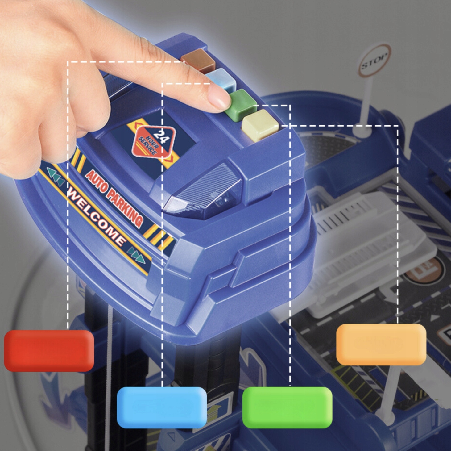 ✔️ Так! Електричний ліфт дозволяє піднімати і опускати автомобілі на всіх 4 рівнях паркінгу. Крім того, на панелі є кнопки зі звуками (сигнал, поліцейська сирена) та світлом для ще більшого задоволення.
