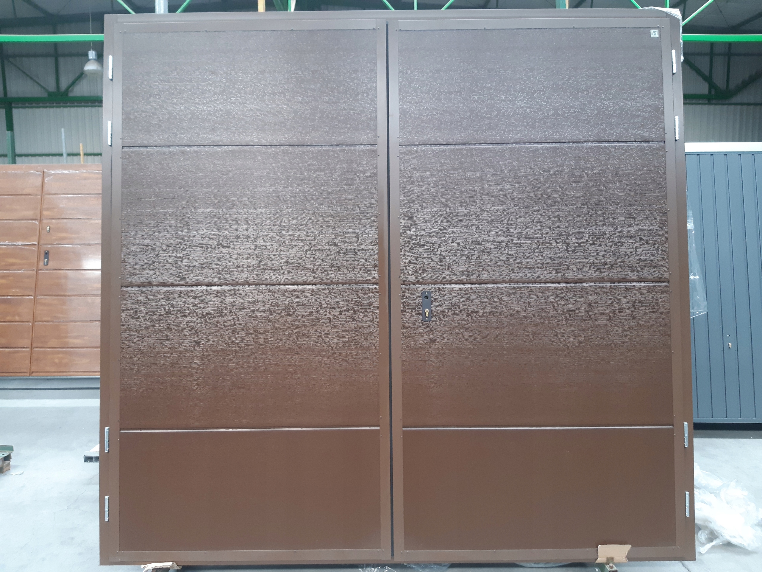 Ворота гаражні двостулкові утеплені з сегментним заповненням. Розпашні ворота з симетричним поділом стулок, колір RAL: 8017 - Ci.Brąz, горизонтальне тиснення панелі, зовнішні розміри з рамою: 237X209 см. Ш x В Для монтажного отвору розміром 240х210 см.