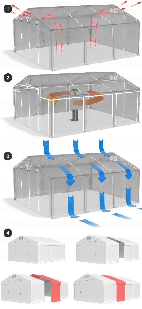 1 - Прозорий модульний дах MS ПВХ (полівінілхлорид) 580г/м2 2 - Подвійна вентиляція з обох сторін 3 - Повзункові та рулонні входи 4 - Міцний YKK блискавки на входах 5 - Ущільнювальні липучки 6 - Змінні Маски з ущільнюючими липучками 7 - Бічні стінки MS PVC приблизно 2 x 2 м (полівінілхлорид) 580 г/м2 8 b> - Додатковий утримуючий фартух