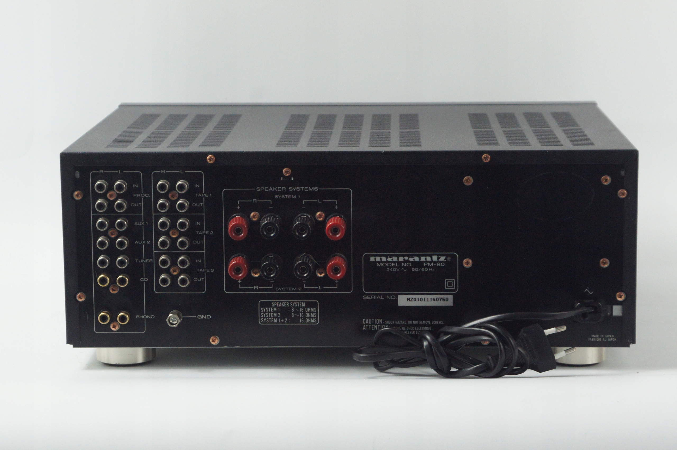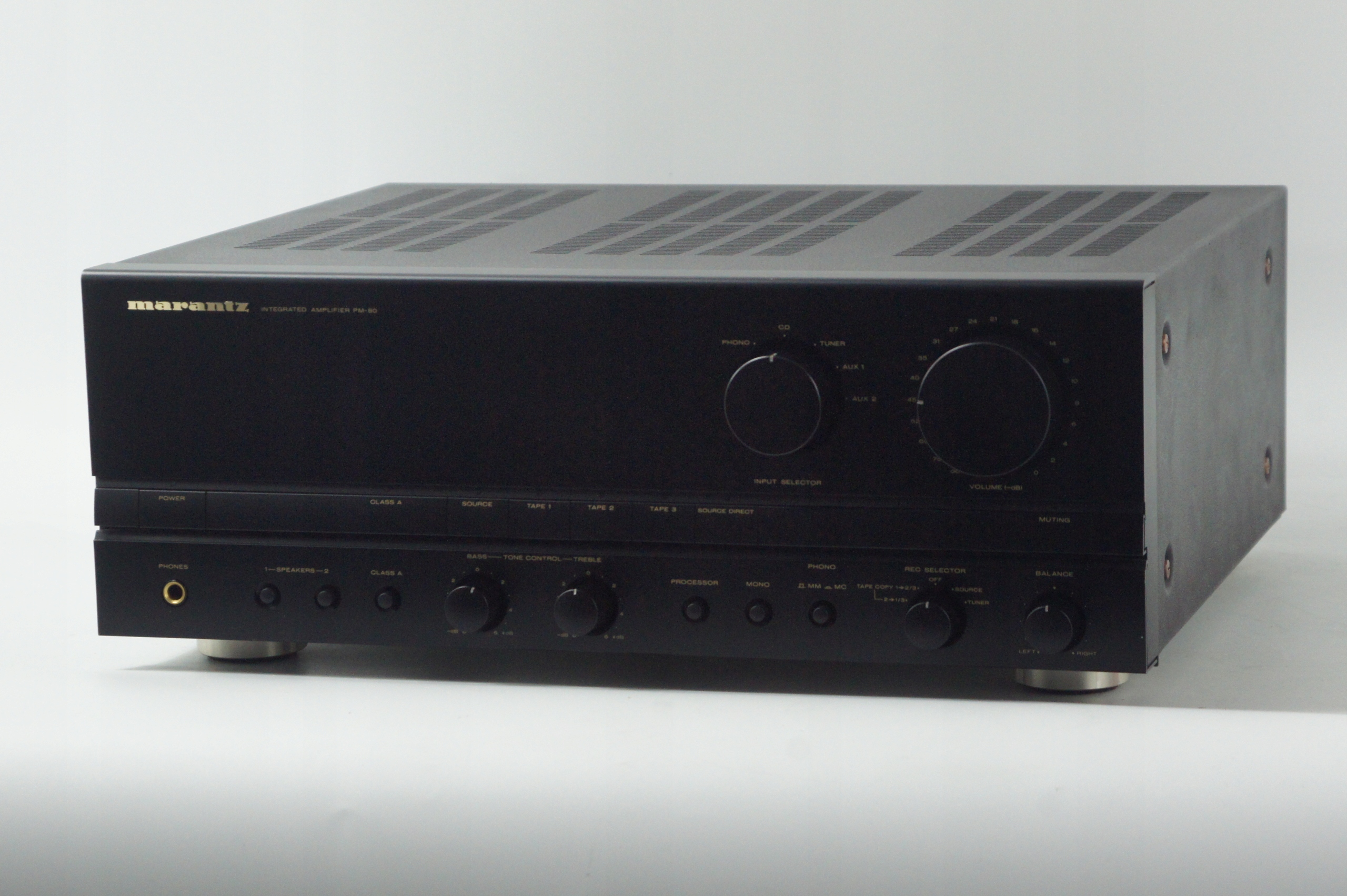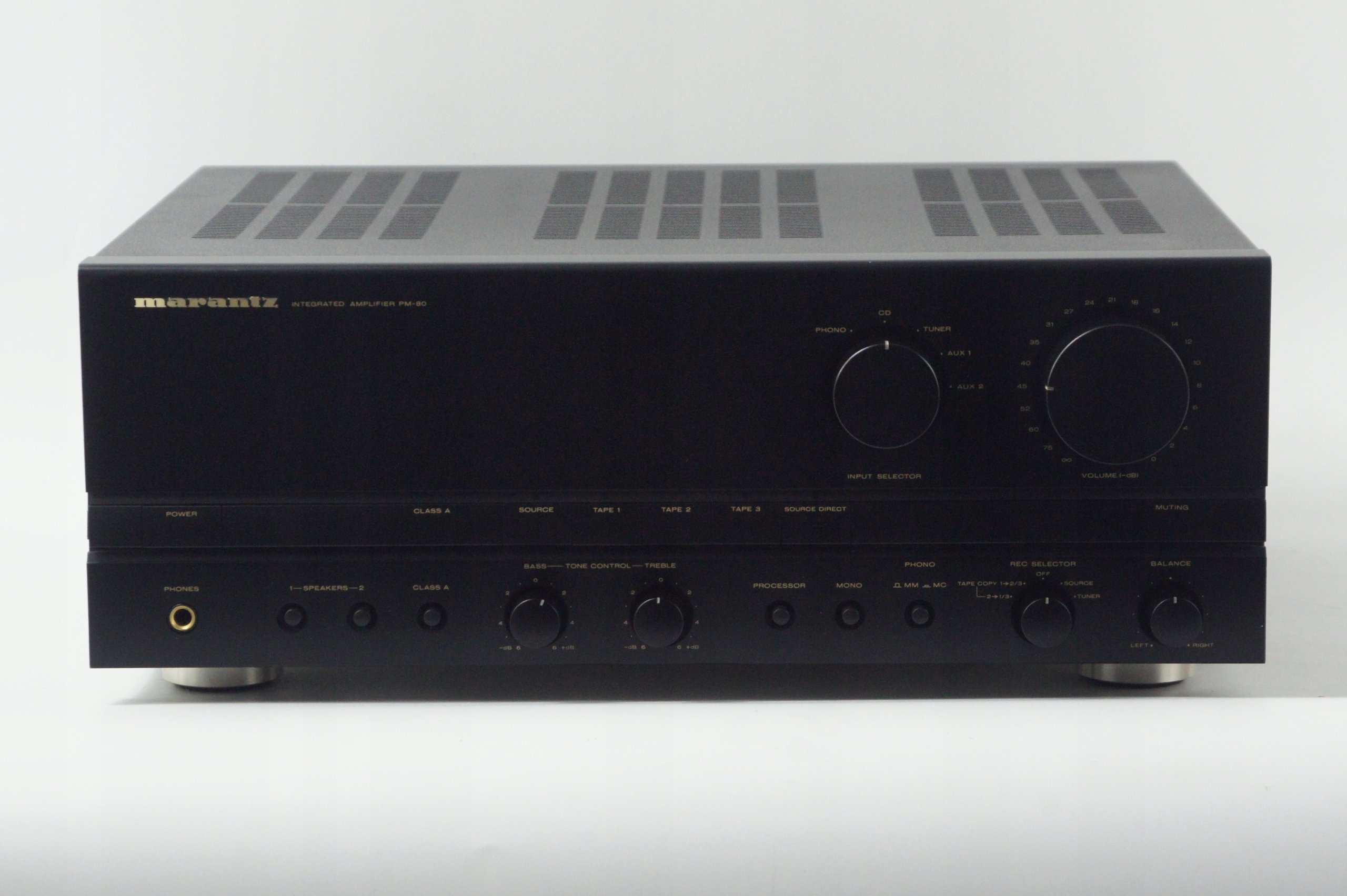Marantz PM-80 — міцно побудований великий підсилювач з кінця 1980-х і 1990-х років, який характеризується теплим, збалансованим звуком, типовим для класичних моделей Marantz. Конструкція забезпечує можливість роботи в режимі Класу A (до 25 Вт на канал) і автоматичного перемикання на Клас AB при більших навантаженнях, що забезпечує гнучкість і ефективне управління теплом.