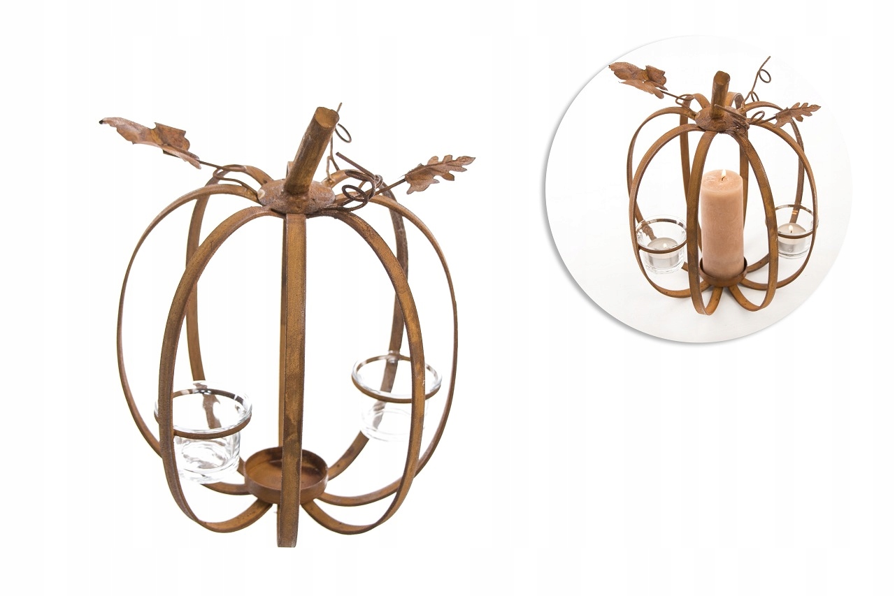 гарбуз -ущільнений свічник, виготовлений з металу в природному кольорі іржі, сирого - матового покриття. У ньому є 3 місця для свічок трійника. Він ідеальний як композиційний елемент або незалежна прикраса. Дасть кімнаті осінній акцент.