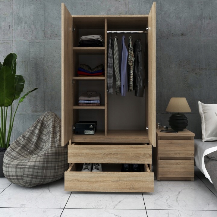 Сучасний сталевий гардероб у кольорі дуба Sonoma є ідеальним рішенням для стильного інтер'єру. Проста, елегантна форма та мінімалістичний стиль ідеально поєднуються як з класичними, так і з сучасними композиціями. У гардеробі є місткі ящики та двері, за якими приховані полиці з баром для одягу, завдяки якому забезпечує багато місця для зберігання одягу, постільних речей та інших домашніх аксесуарів.