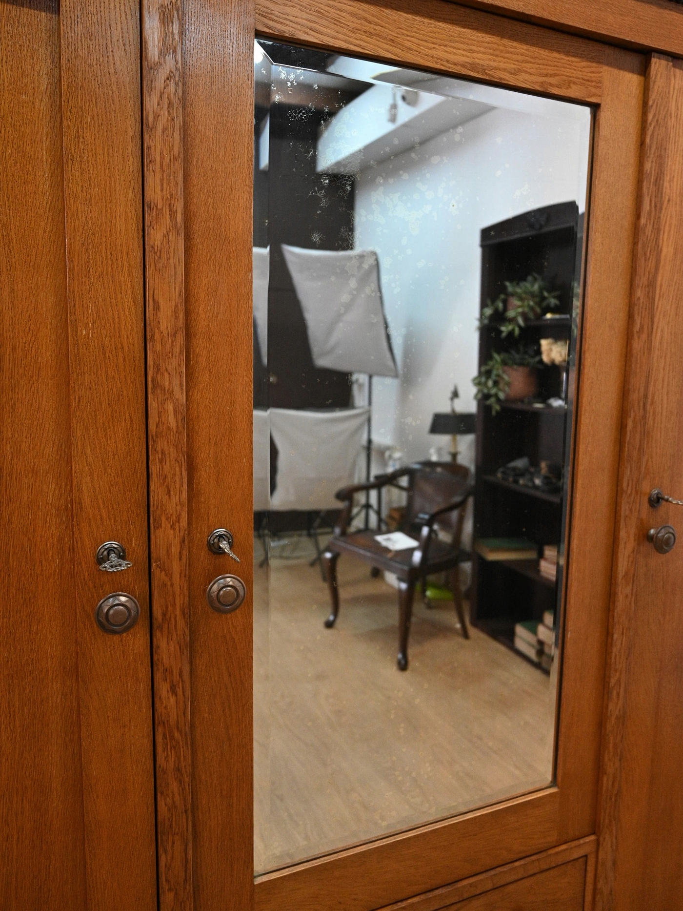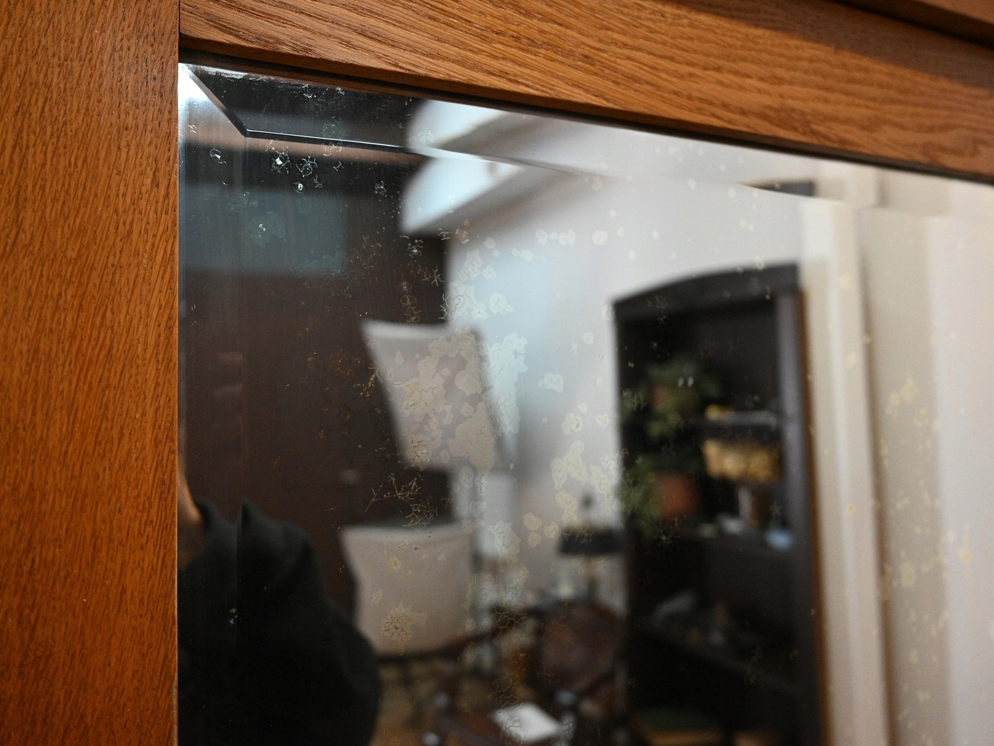 Дзеркало, зачароване видимими слідами минулих меблів, просочених підготовкою проти корових жуків. Немає активного кори жуть.