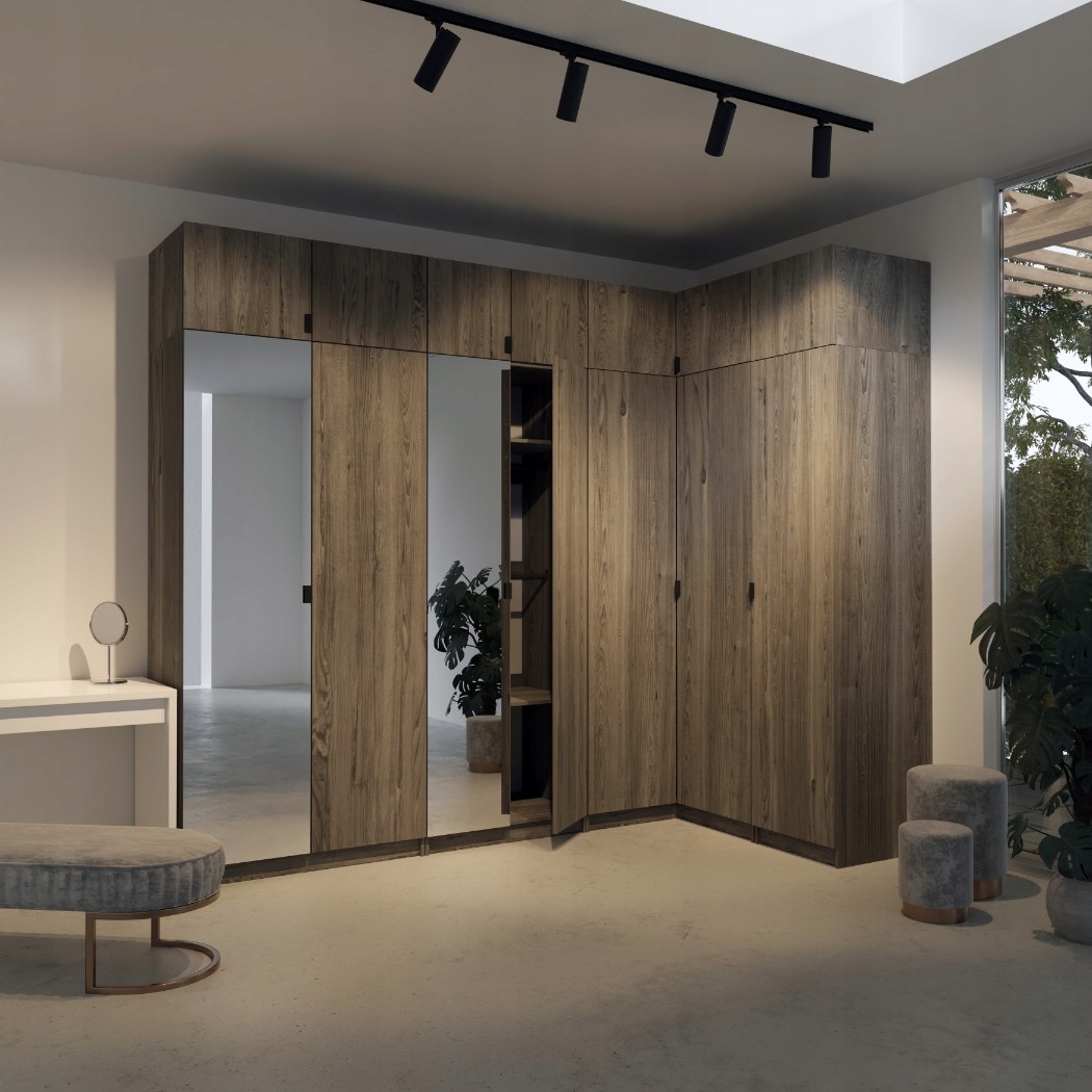 Використовуйте будь-яке вільне місце у своїй кімнаті! Кути спальні, холу або гардеробної є одними з найскладніших місць для облаштування. Шкода залишати це місце порожнім, але часто буває складно знайти потрібний предмет меблів, гардероб або гардероб, який би заповнив цю прогалину. Тому обирайте кутовий гардеробний модуль Flex!