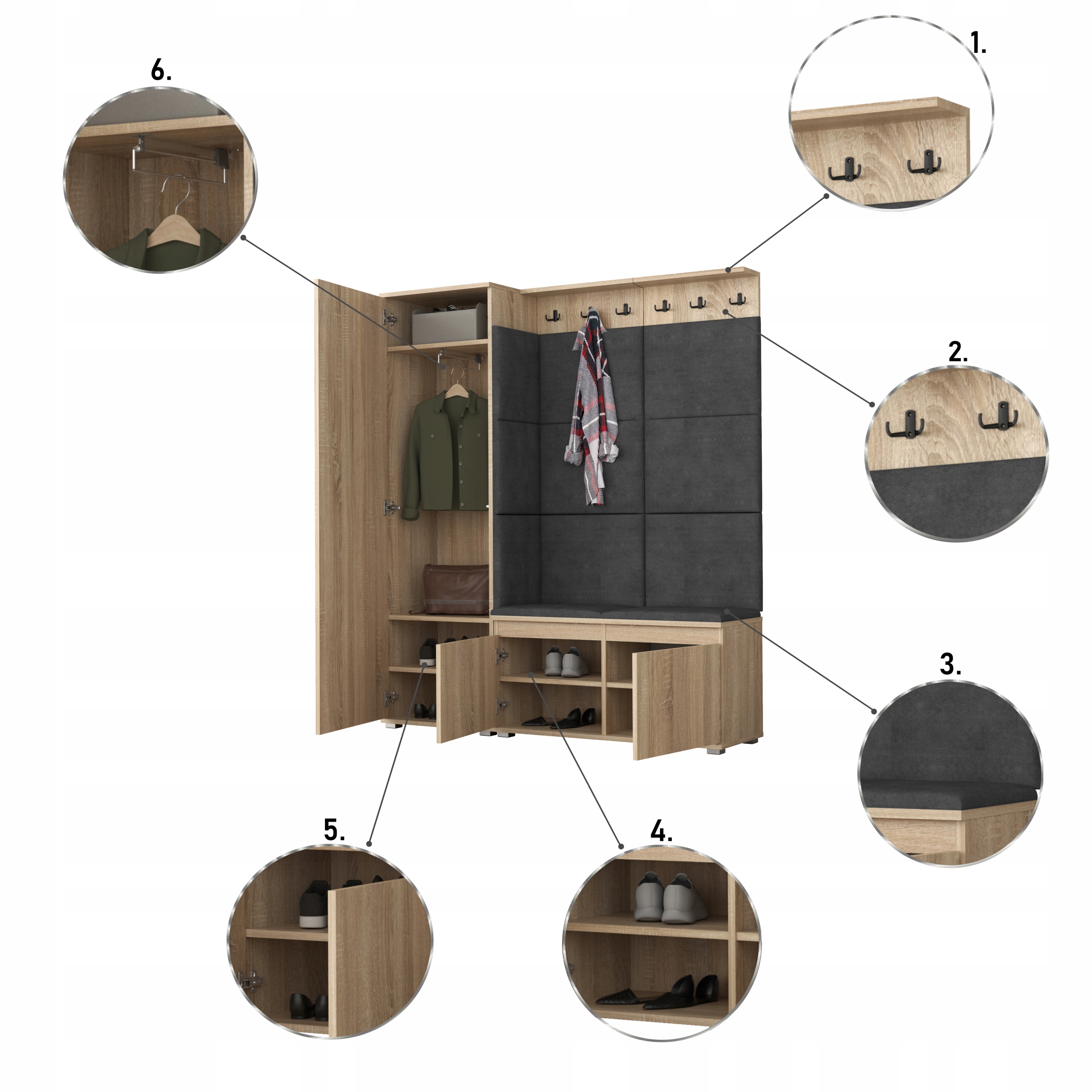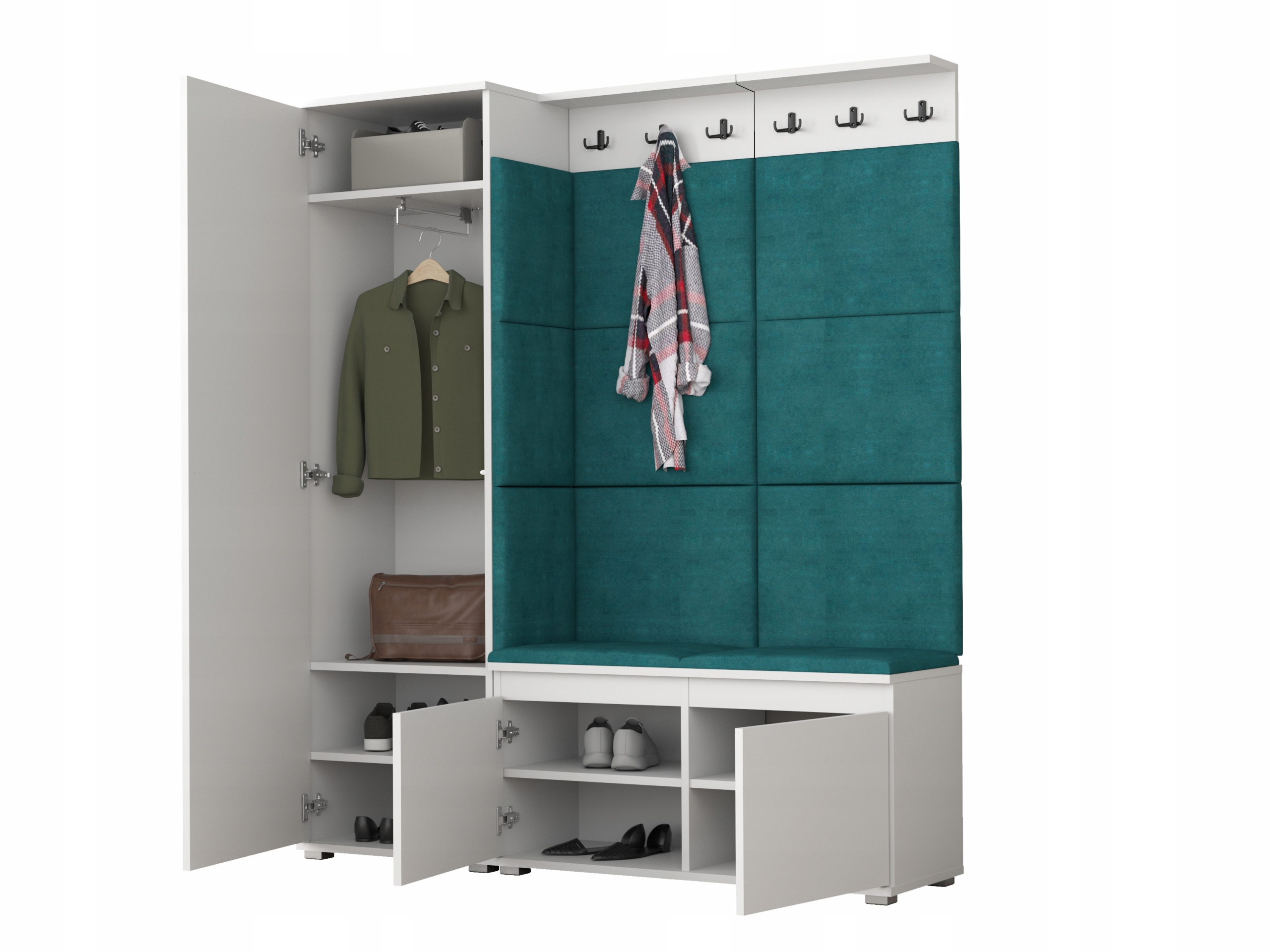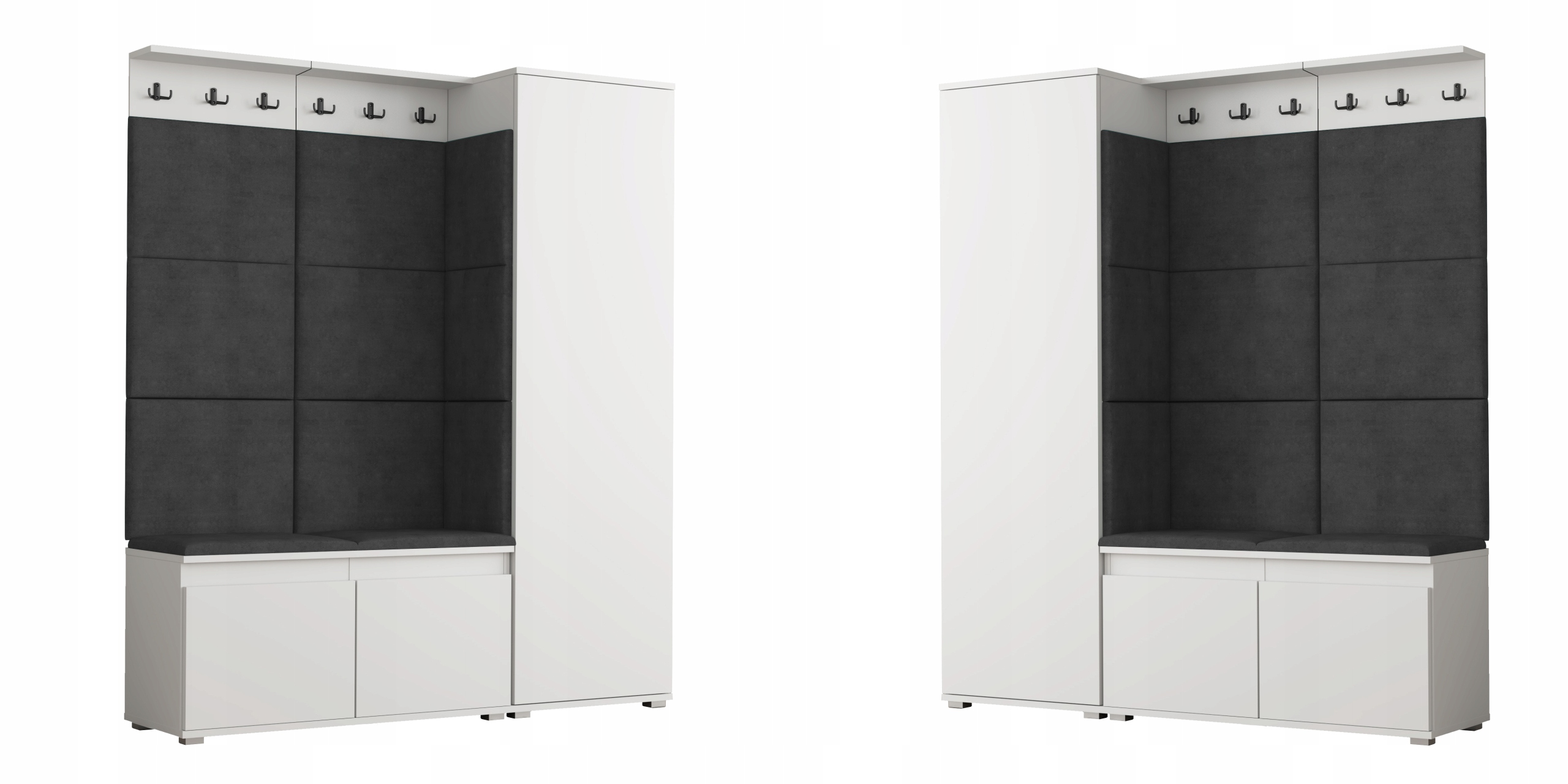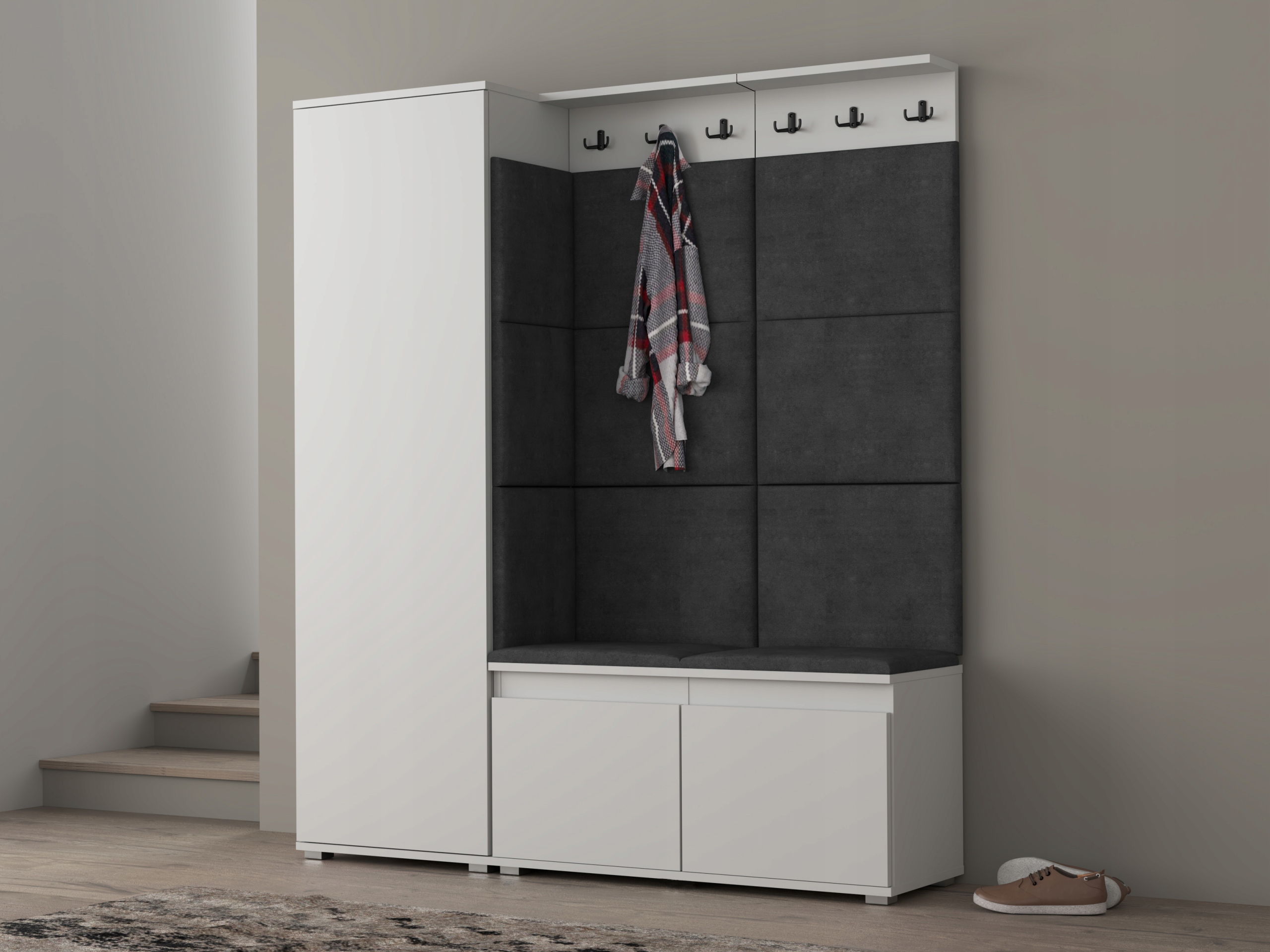 Сучасний, функціональний комплект для передпокою, доступний в 3-х колірних варіантах і трьох кольорах сидінь і панелей.
