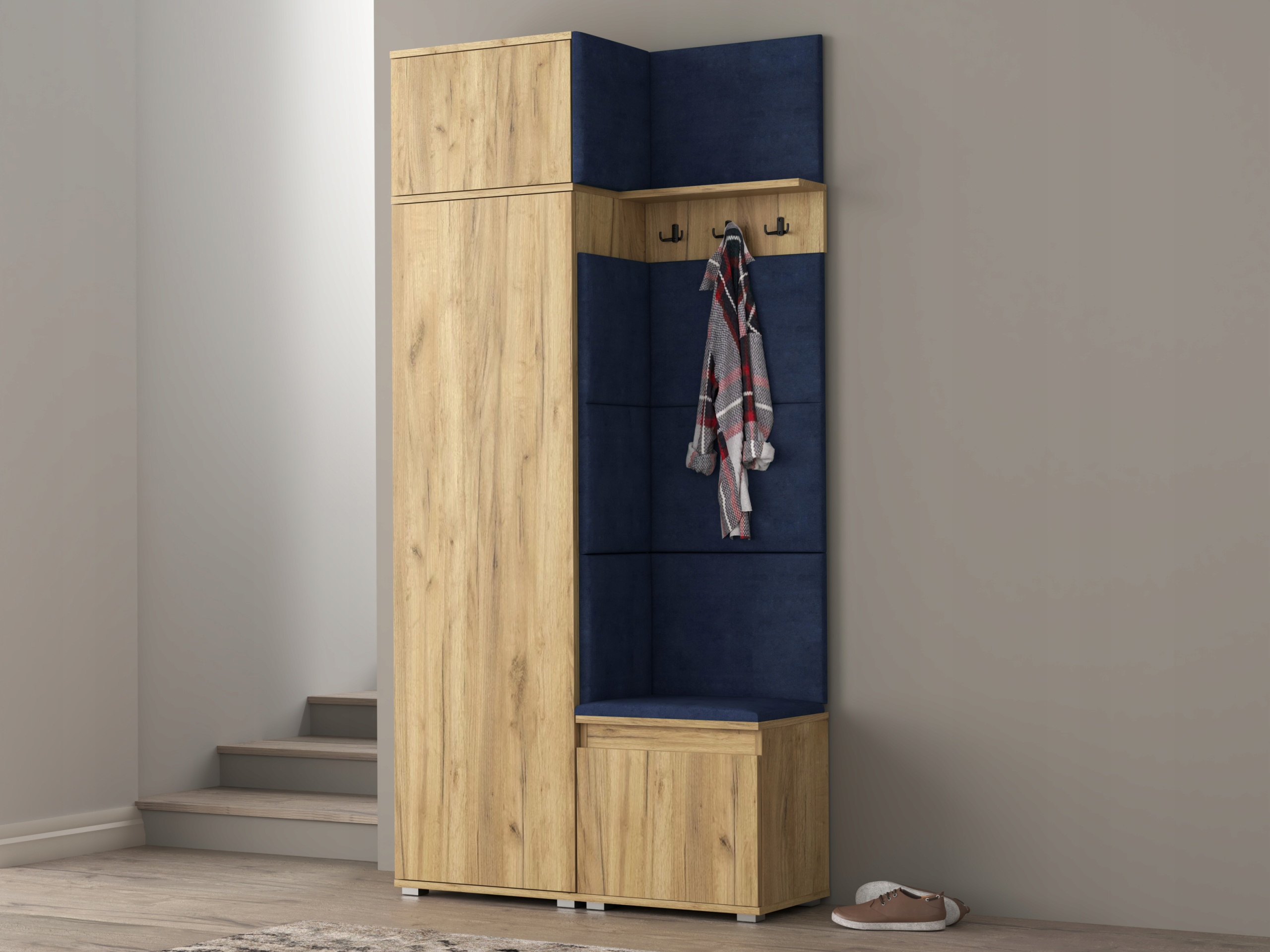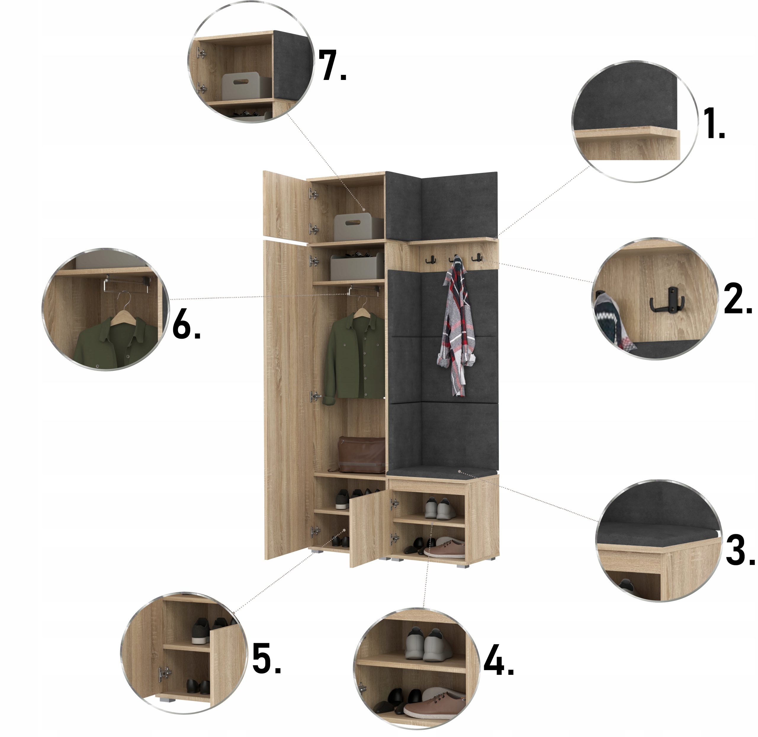 Сучасний, функціональний набір для передпокою, доступний у 3-х колірних варіантах і трьох кольорах для сидіння та панелей.