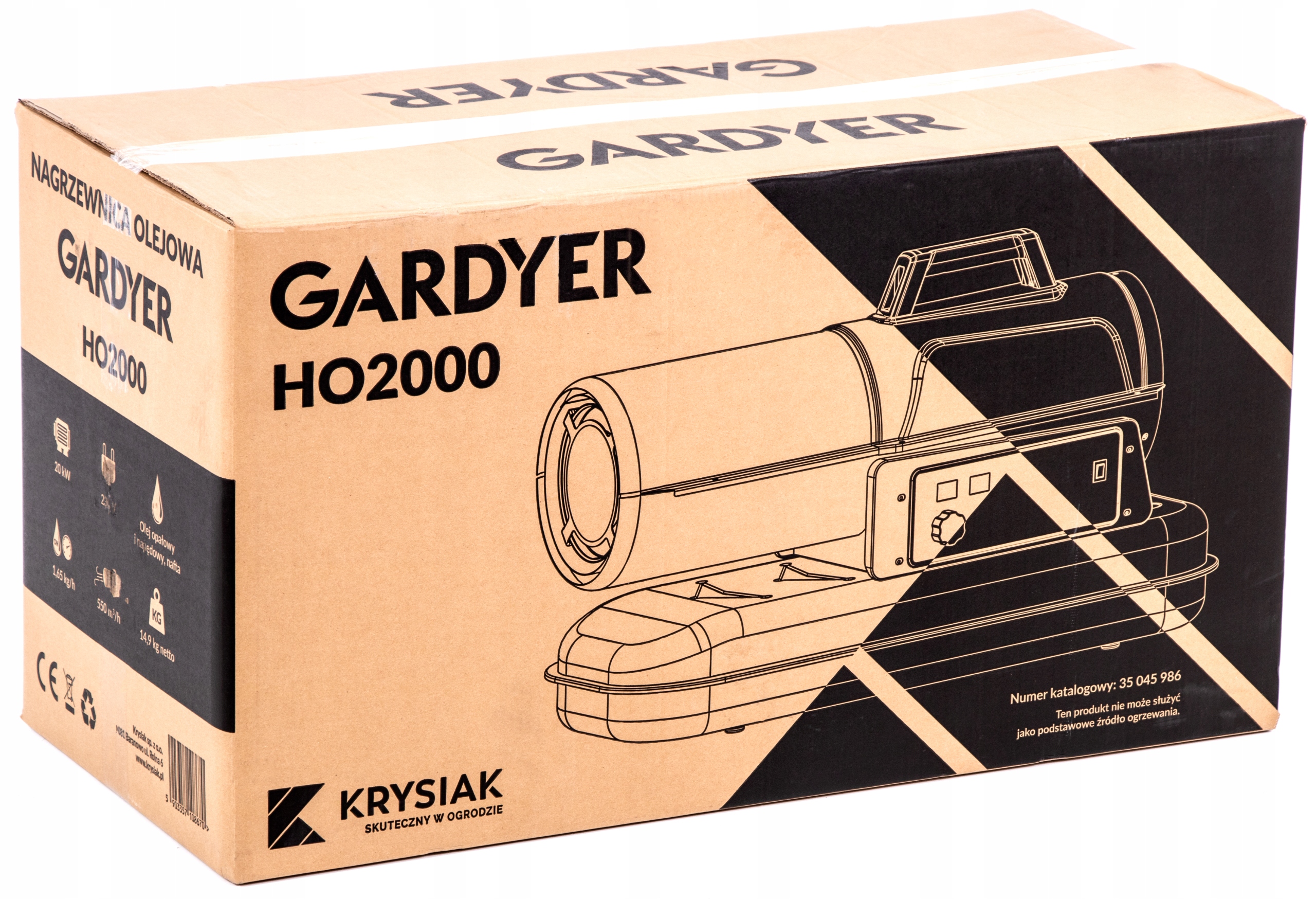 Опагатник Gardyer Ho2000 -це обладнання, придатне для опалення не лише великих закритих приміщень, але й відкритих та напівпровідних приміщень. Цей пристрій відрізняється на 20 кВт. Досягає 550 м3/год повітря. Він також оснащений термостатом. Він має 19 -літерний паливний бак, а його споживання -1,65 кг/год. Використовуване паливо може бути гасом або нагрівальним маслом. Параметри нафтового нагрівача Gardyer HO2000 роблять його обладнанням для верхнього полиця, яке можна перевірити у виняткових умовах, де інші види опалення виявляться недостатньо ефективними.