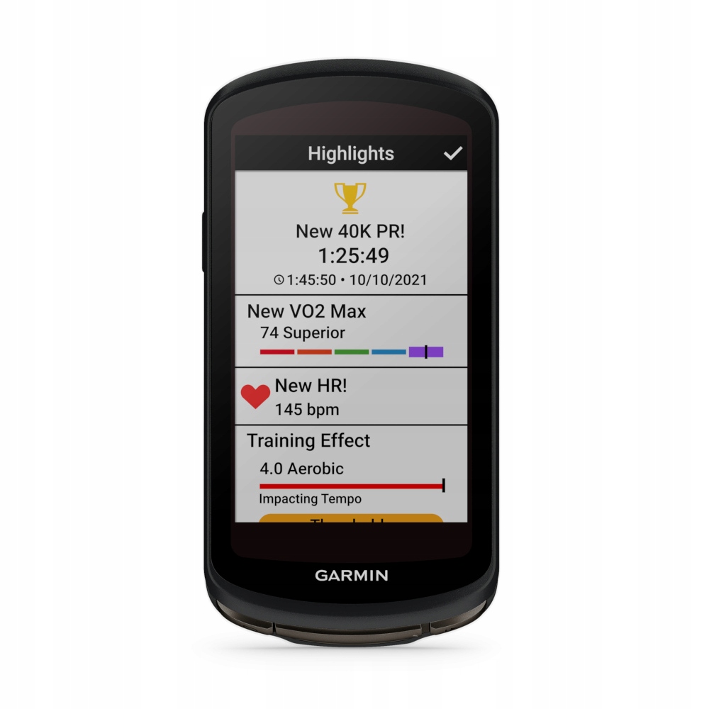 Отримайте інформацію, яка вам потрібна, залишайтеся сильними на кожному кілометрі маршруту. Edge 1040 повідомить вам, коли пора пити воду чи їсти.