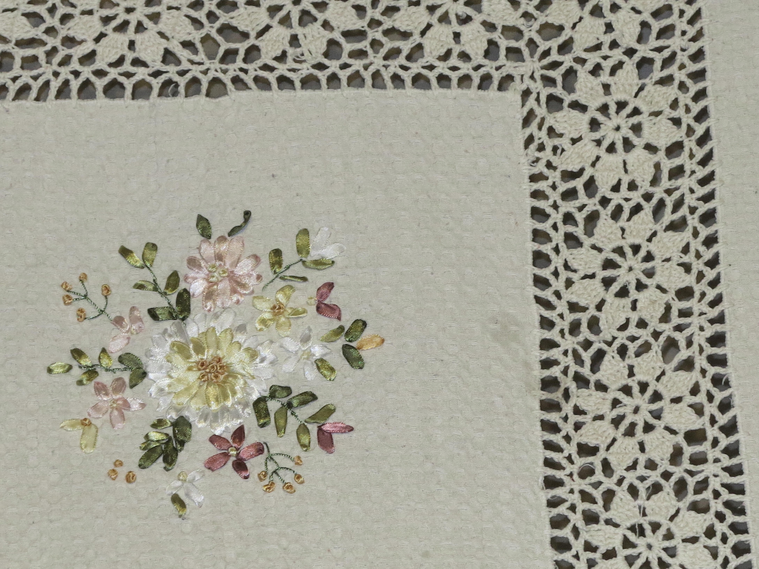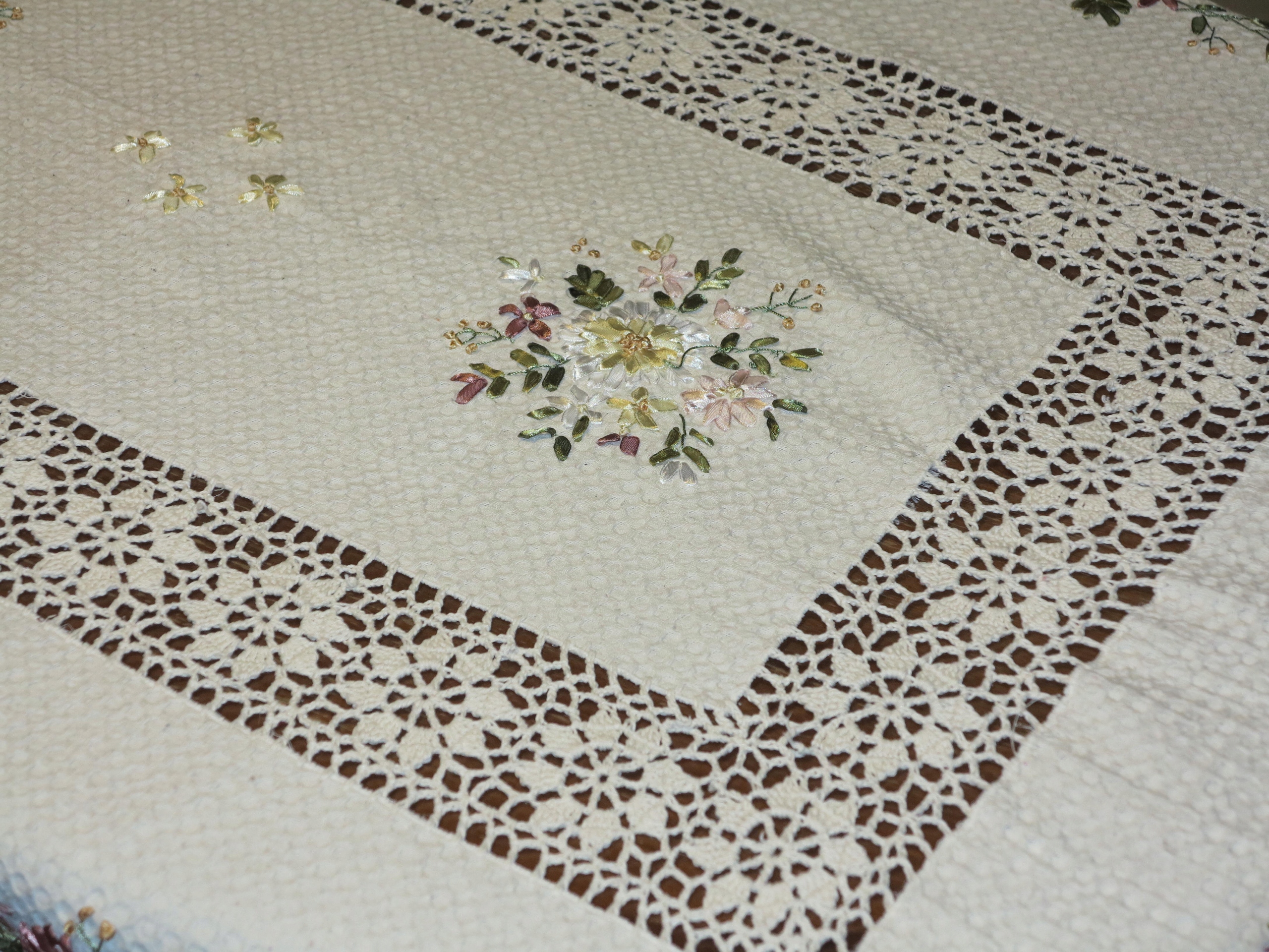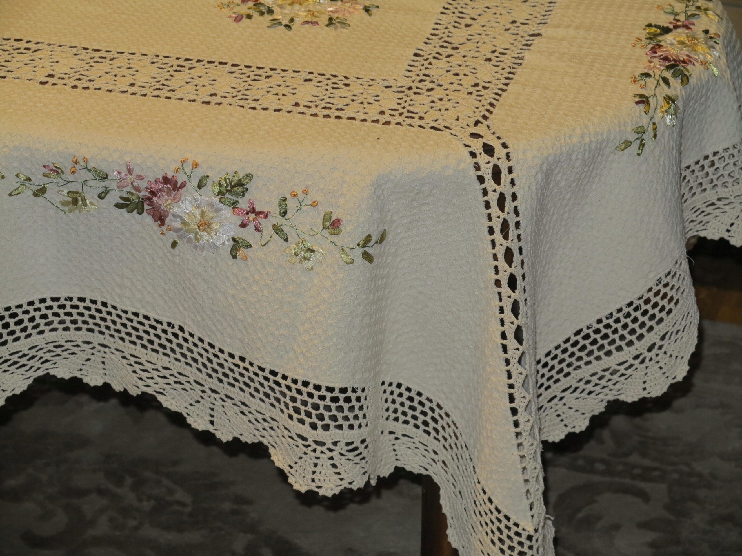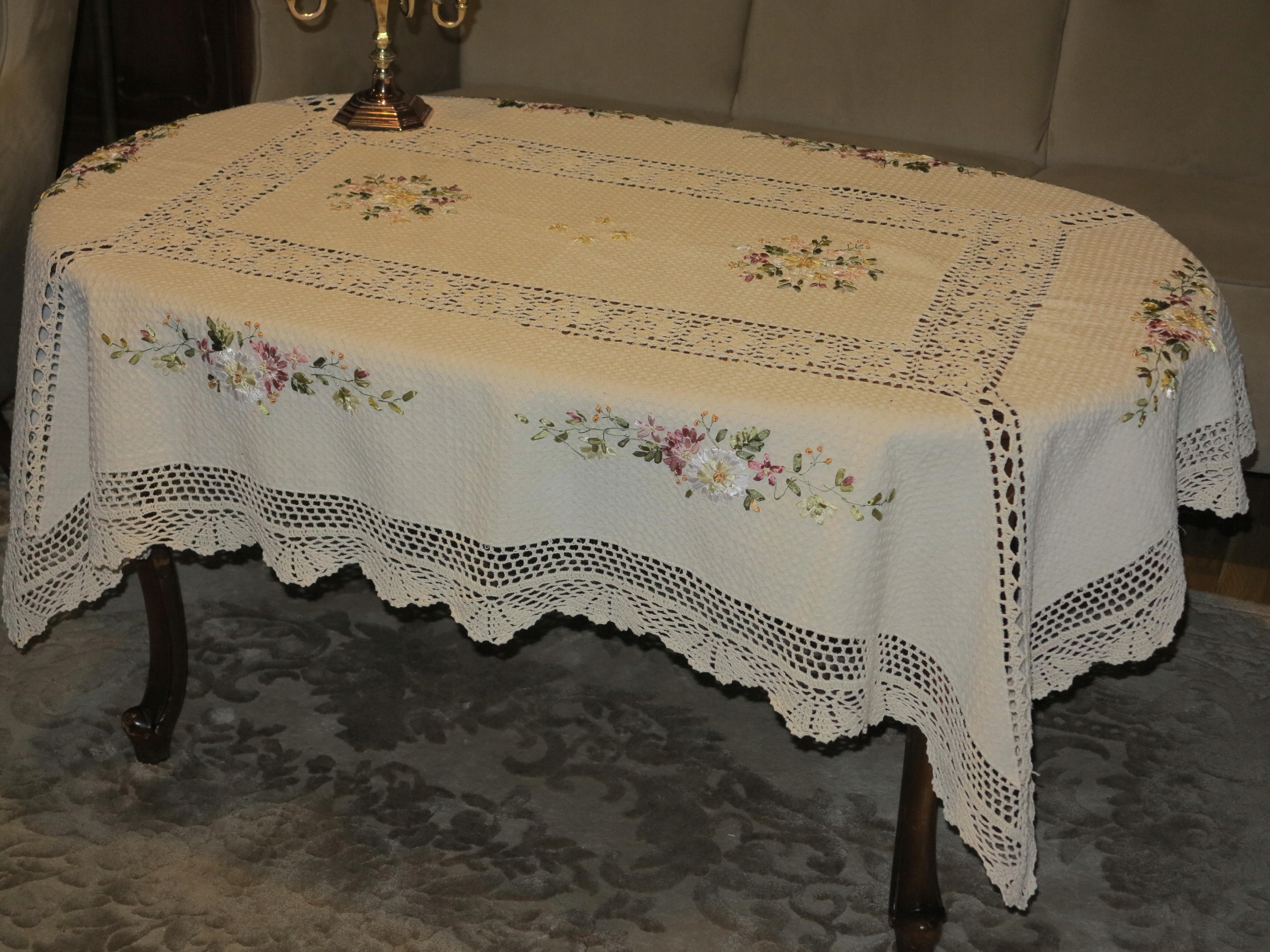 ГАРНУ БАВАВНЯНУ СКАТЕРТИНУ З В'ЯЗАННЯМ ТА ВИШИВКОЮ КОЛЬОРОВИМИ СТРІЧКАМИ. ЗНИЗУ МАЄ ДРУГИЙ ТОНКИЙ ШАР ТКАНИНИ. КОЛЬОРИ: ЕКРЮ/СВІТЛО-БЕЖЕВИЙ