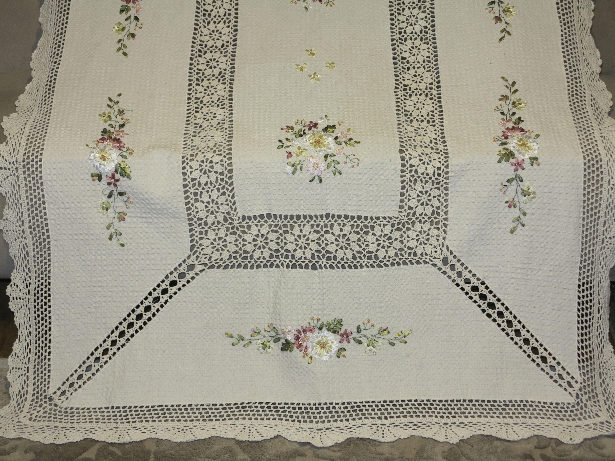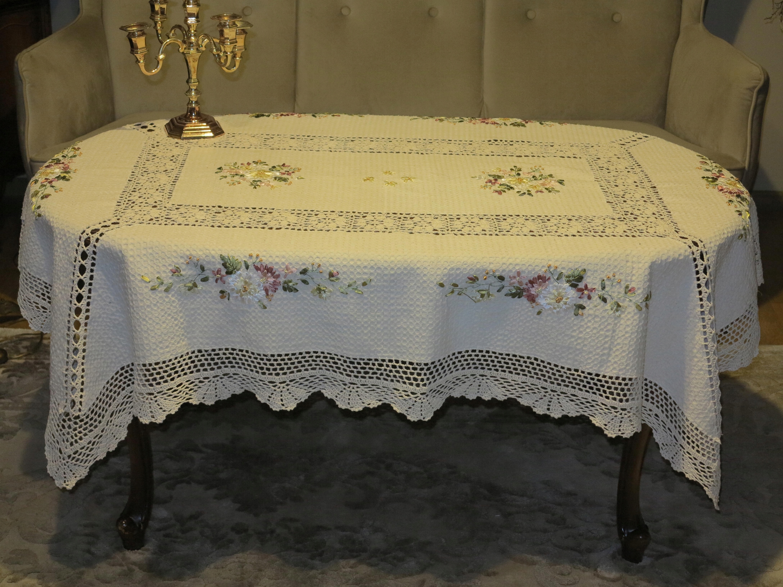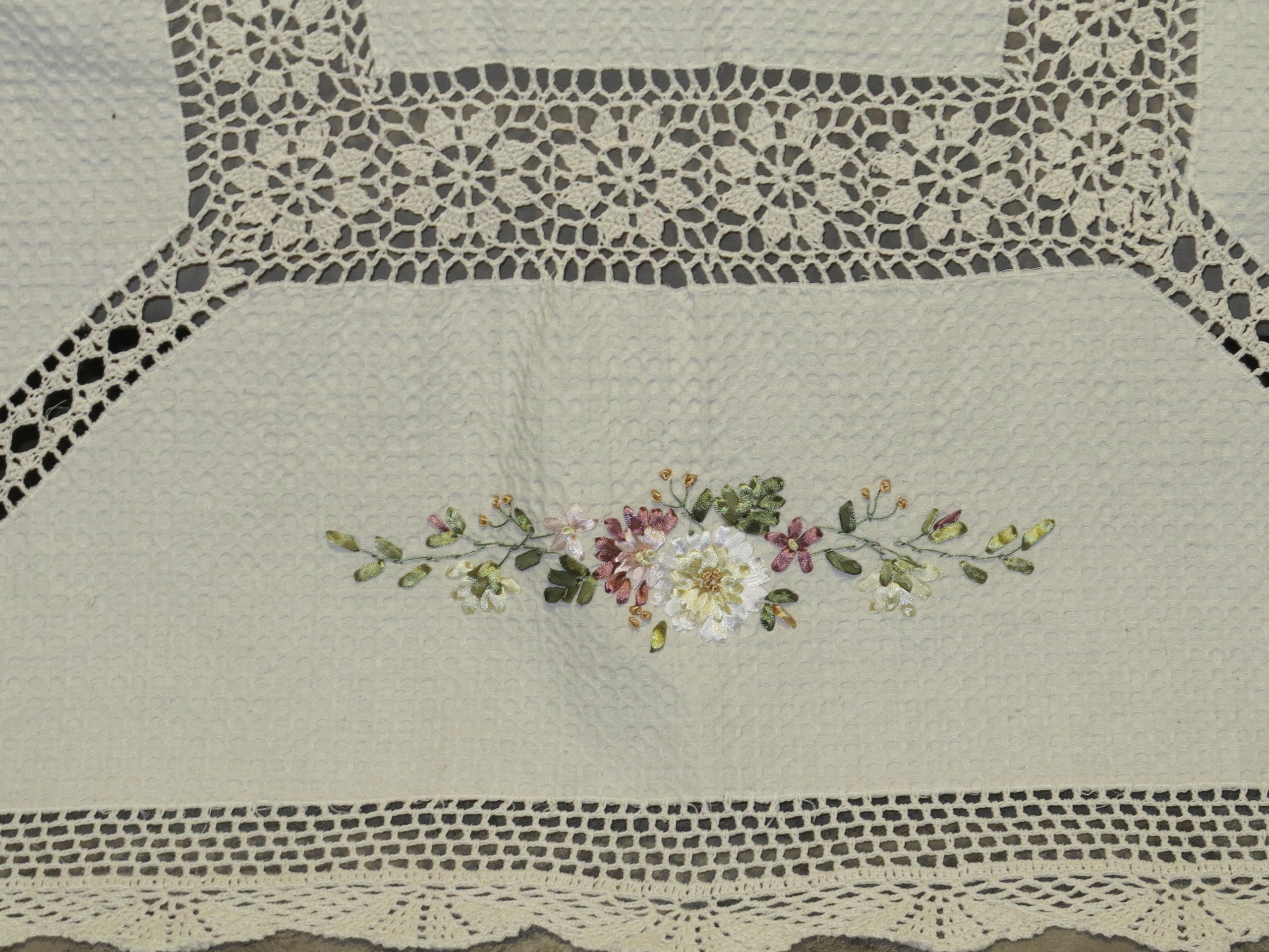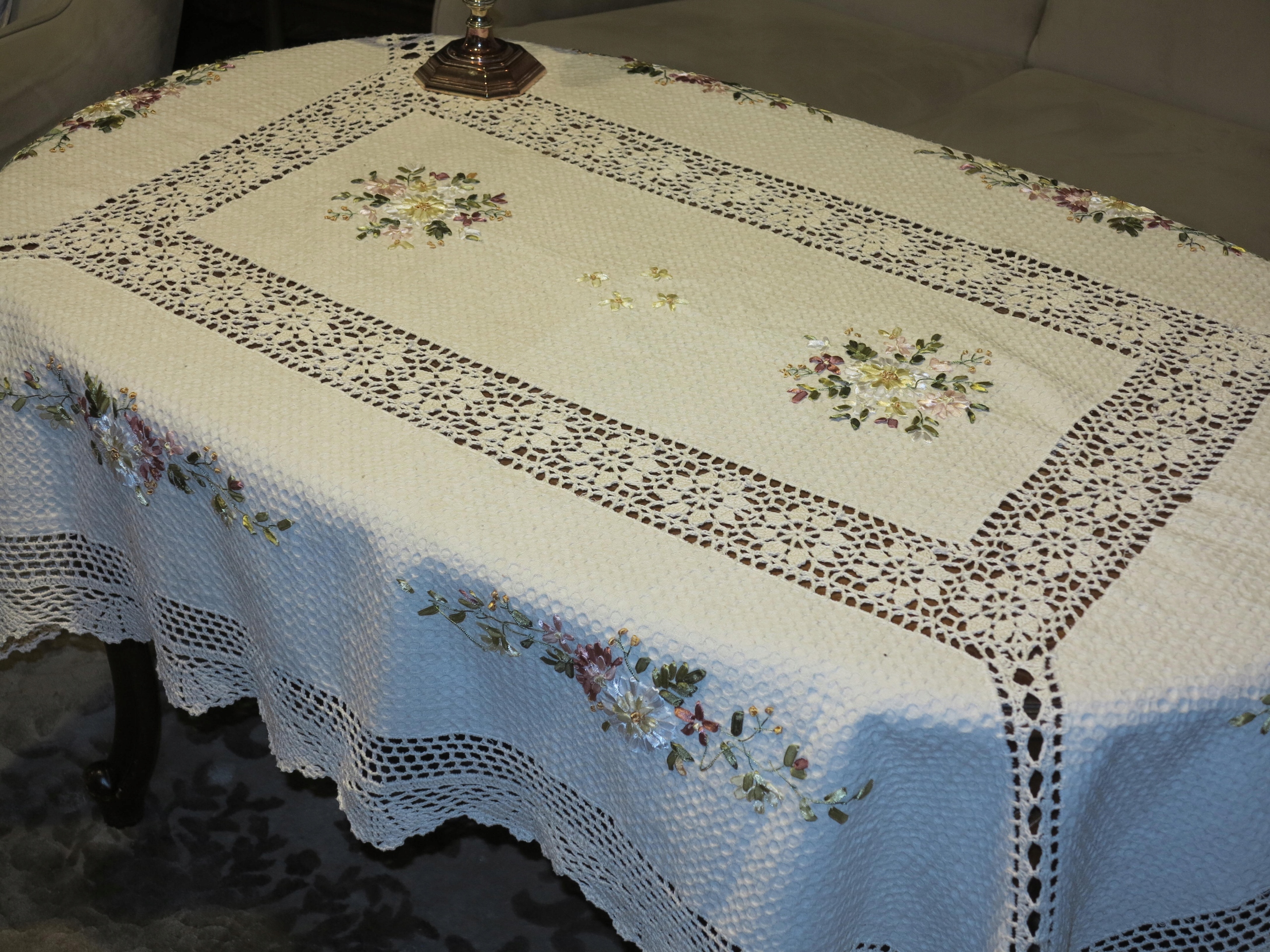 ГАРНУ БАВАВНЯНУ СКАТЕРТИНУ З В'ЯЗАННЯМ ТА ВИШИВКОЮ КОЛЬОРОВИМИ СТРІЧКАМИ. ЗНИЗУ МАЄ ДРУГИЙ ТОНКИЙ ШАР ТКАНИНИ. КОЛЬОРИ: ЕКРЮ/СВІТЛО-БЕЖЕВИЙ