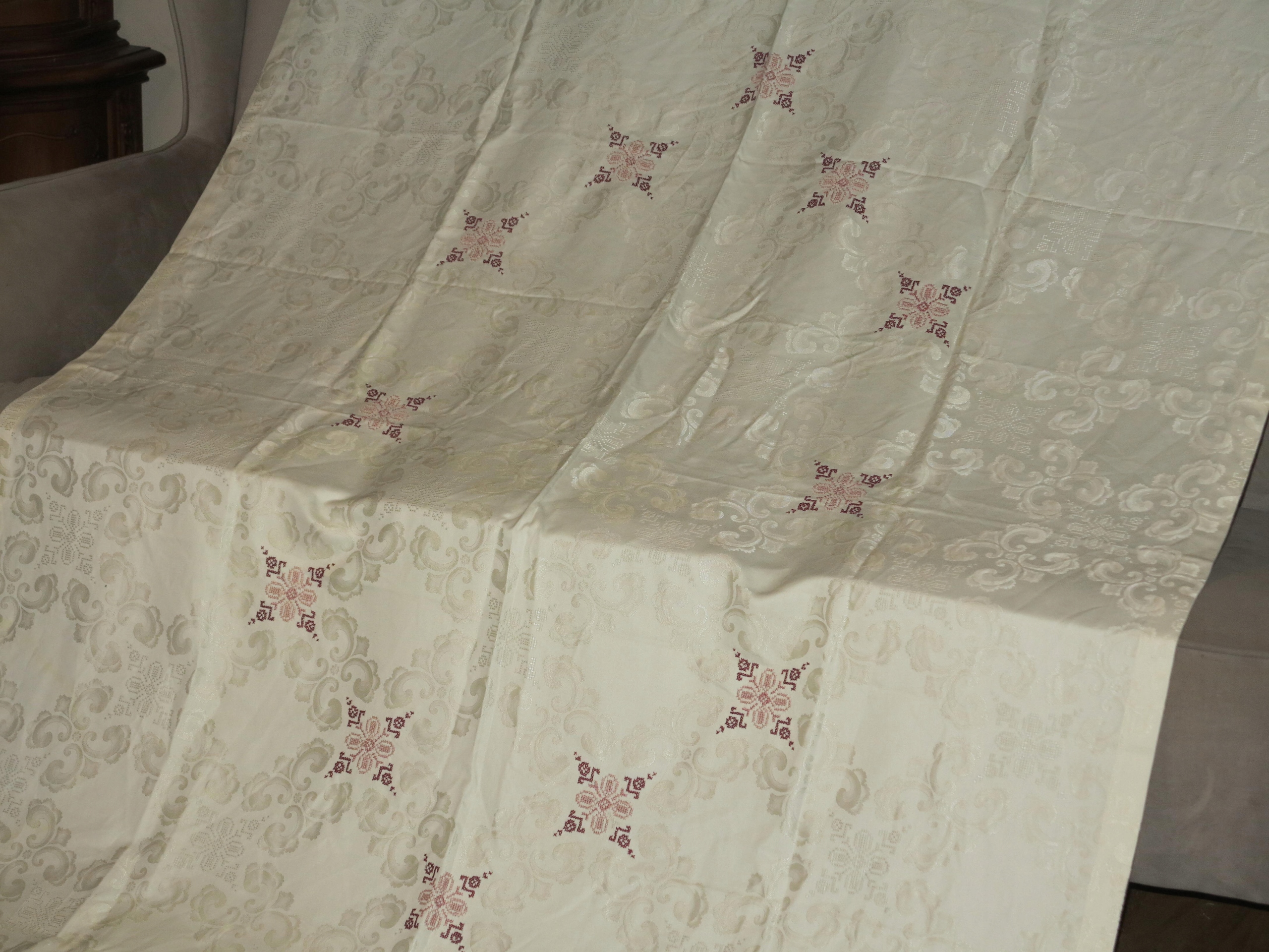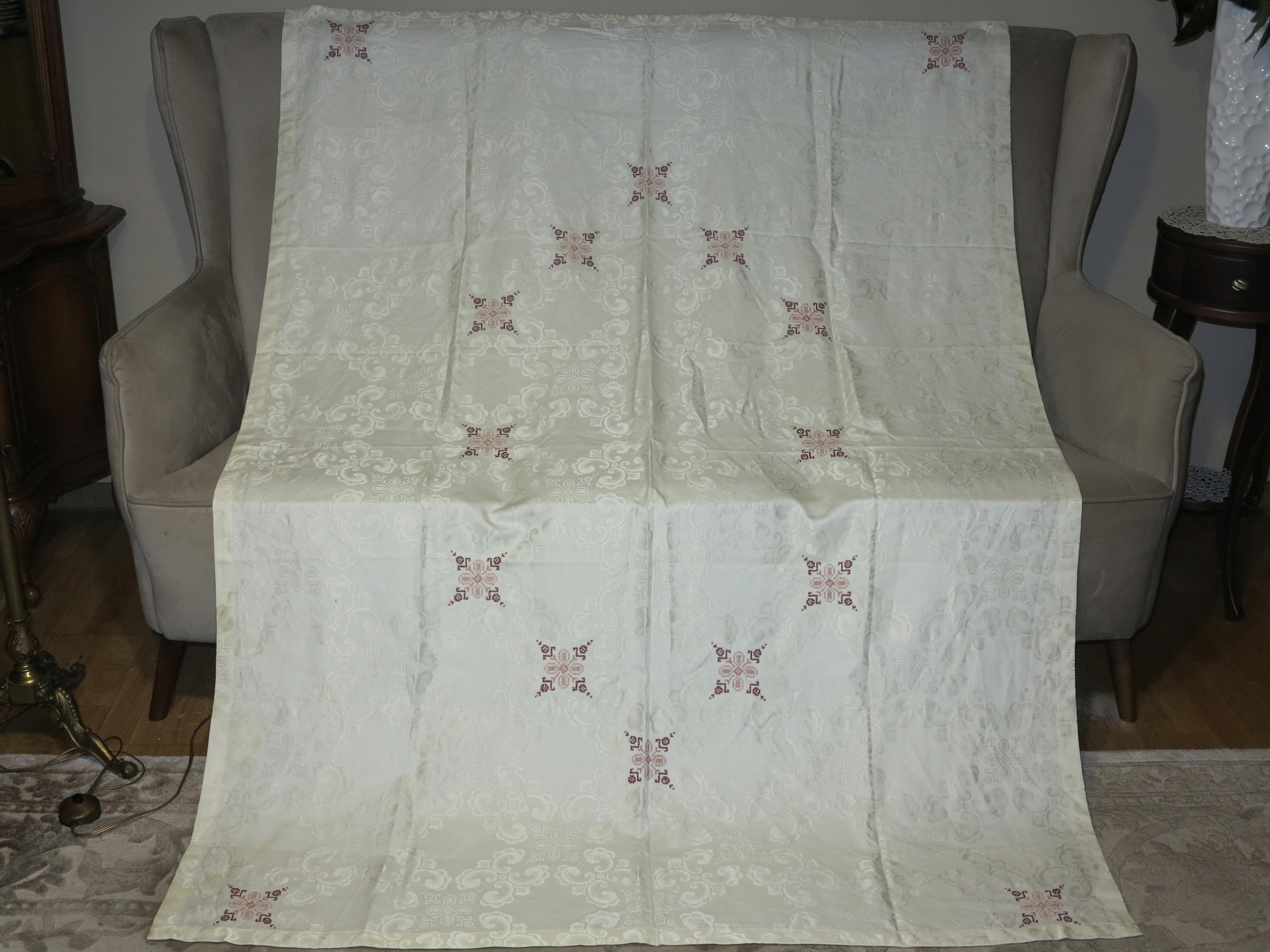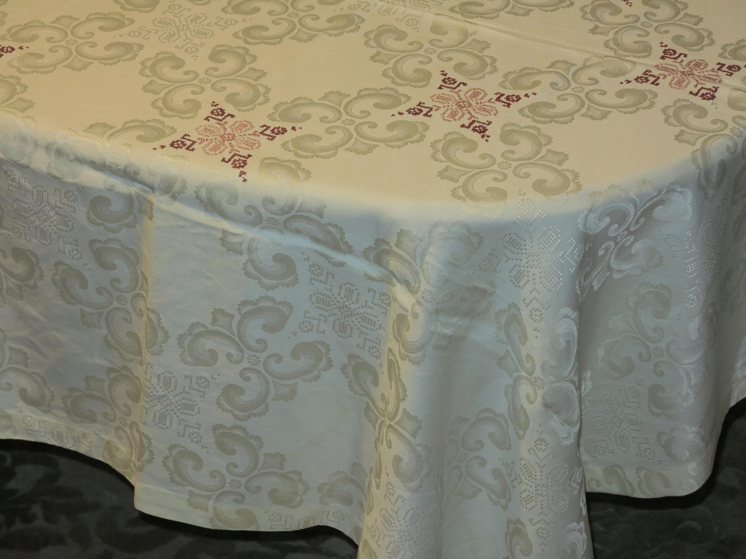 ГАРНУ СУЦІЛЬНУ СКАТЕРТИНУ З БАВОВНИ ДАМАСК З БЛИСКУЧИМ СТИЛЬНИМ ВИЗІРОНКОМ НА СКАТЕРТИНІ, ВИШИВАННЯМ ХРЕСТИКОМ. КОЛІР ЕКРЮ