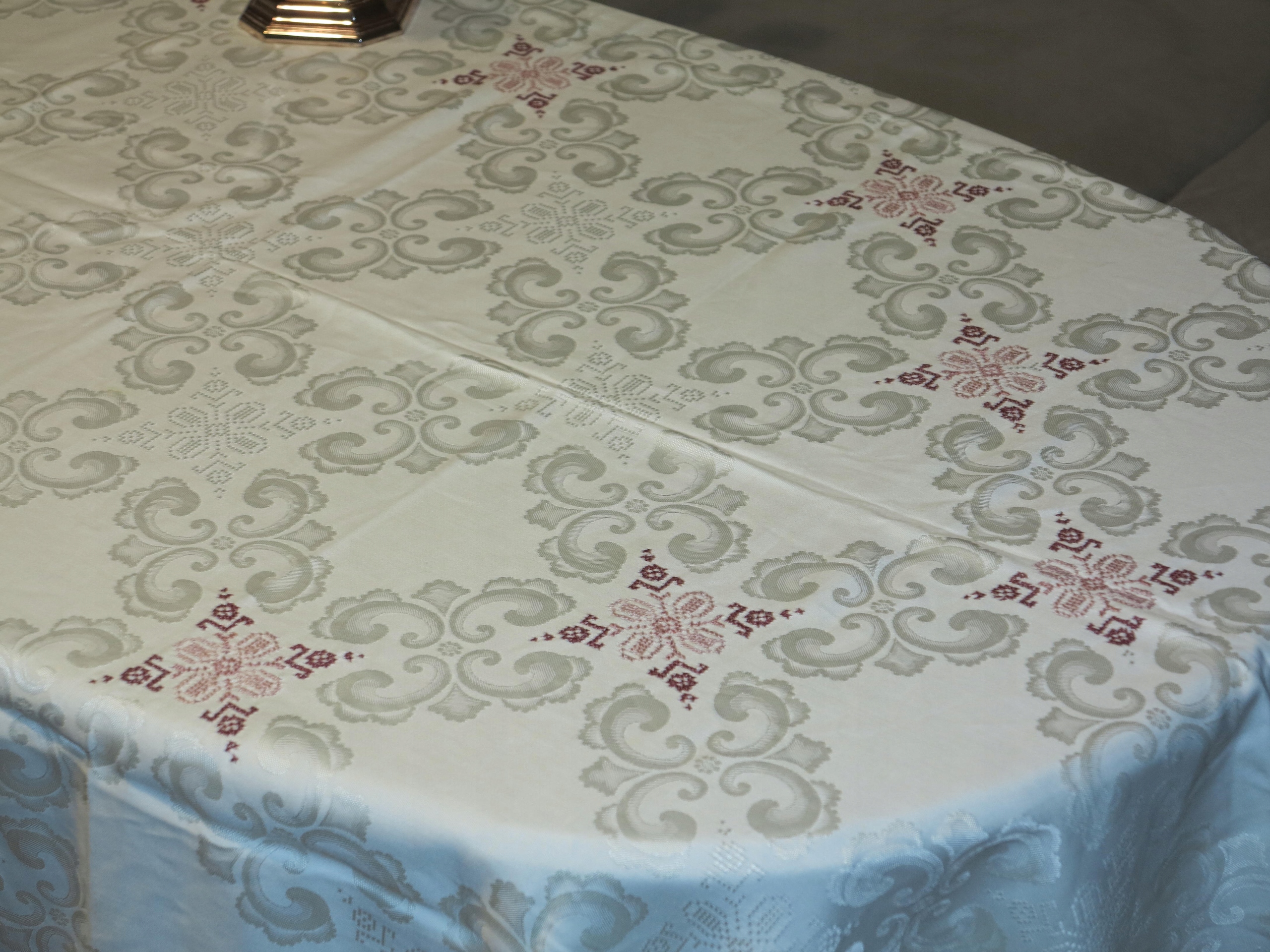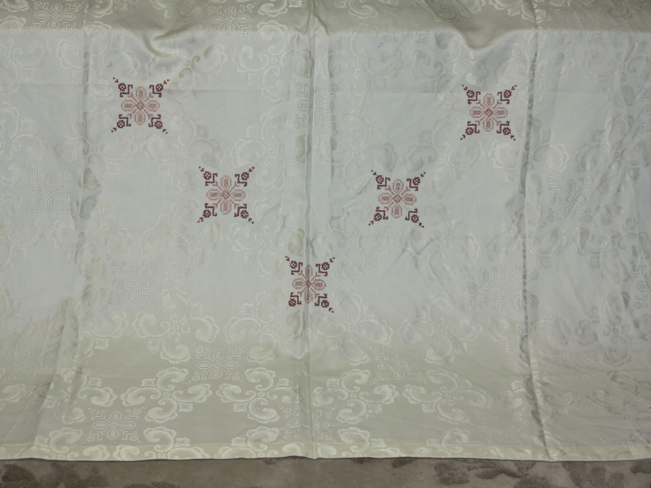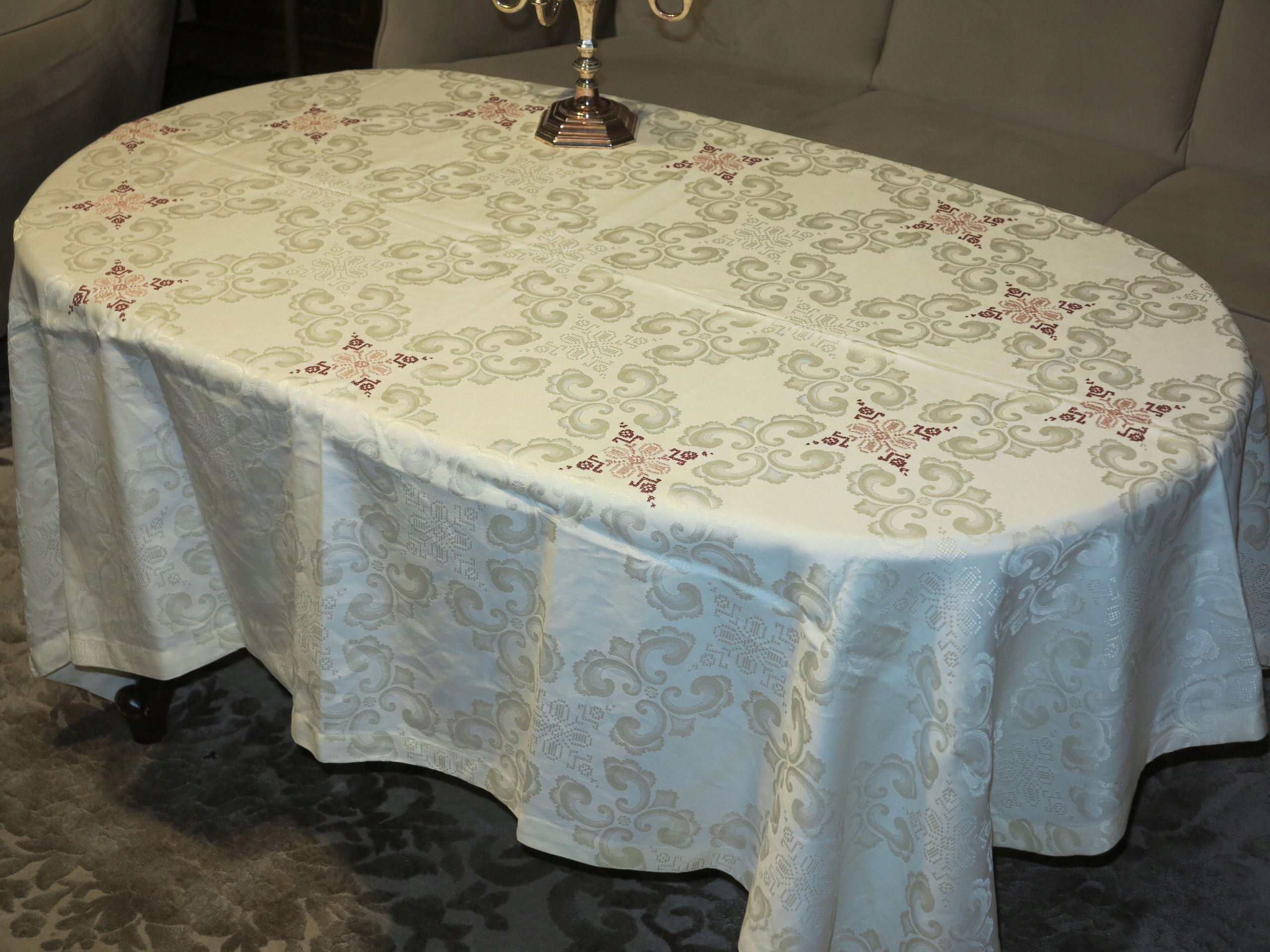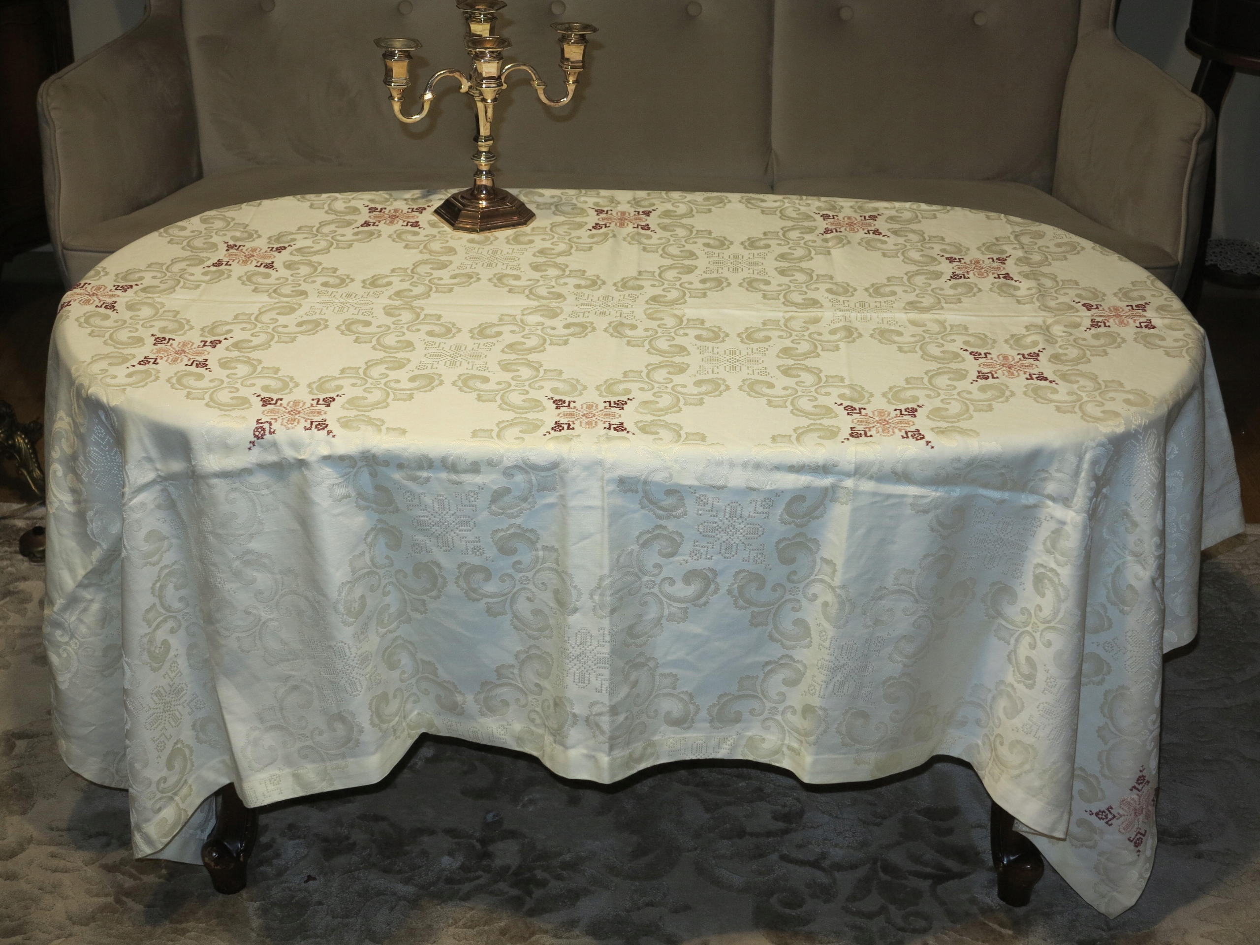 ГАРНУ СУЦІЛЬНУ СКАТЕРТИНУ З БАВОВНИ ДАМАСК З БЛИСКУЧИМ СТИЛЬНИМ ВИЗІРОНКОМ НА СКАТЕРТИНІ, ВИШИВАННЯМ ХРЕСТИКОМ. КОЛІР ЕКРЮ