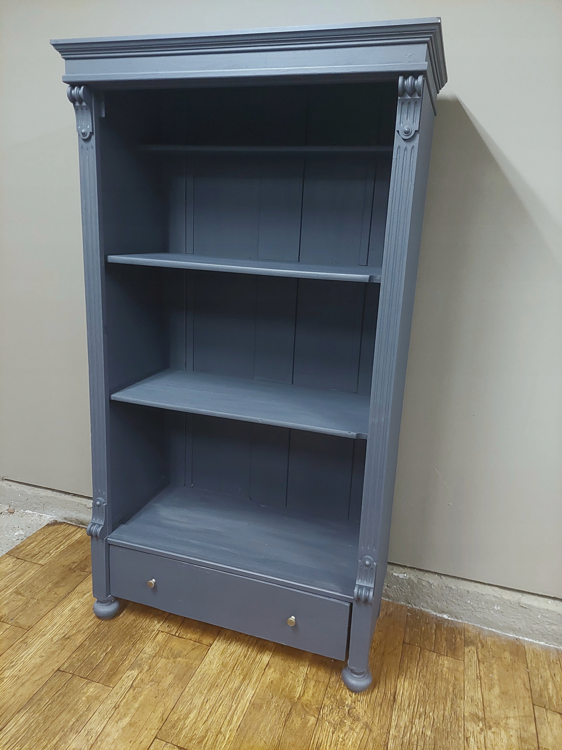 Полиця була очищена від старого покриття, а потім пофарбована у темно-синій/сталевий відтінок.