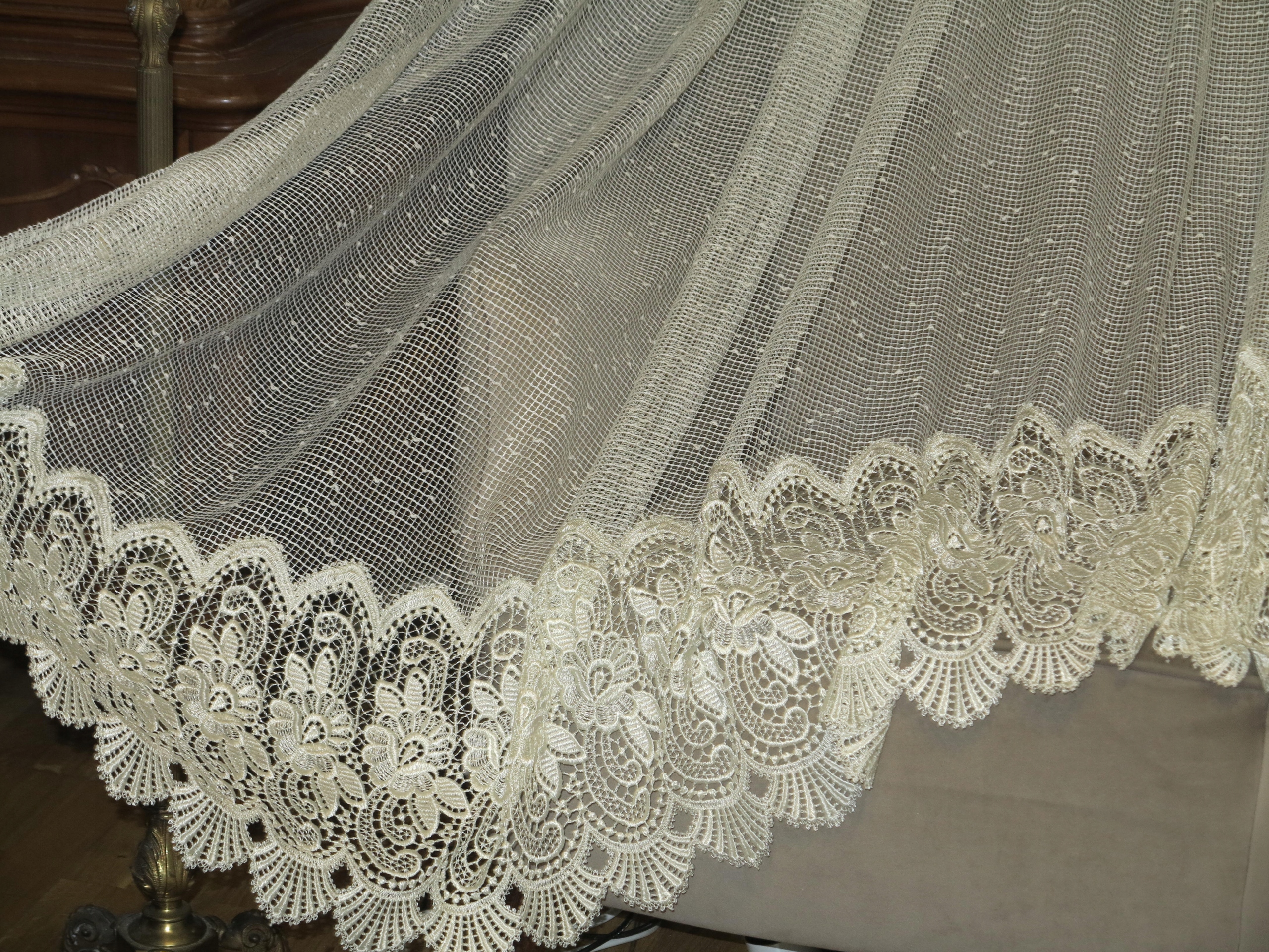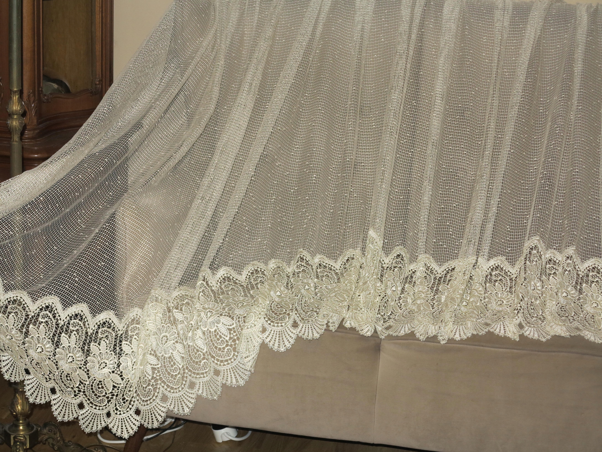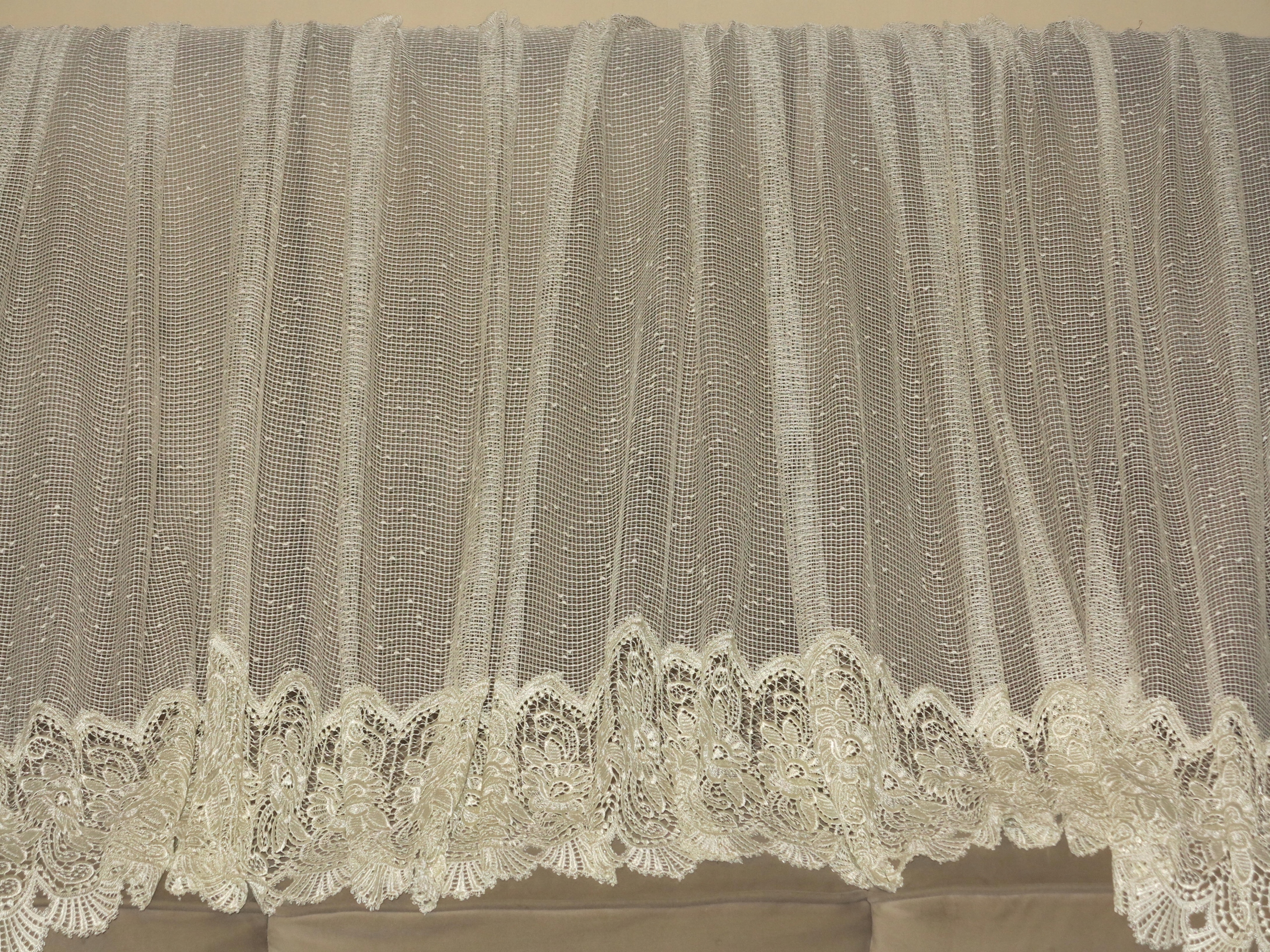 КРАСИВУ ШТОРУ АКЛАДНО РОЗРІЗАНУ В АРКУ. ВИГОТОВЛЕНО З ТОНКОЇ СІТКИ, ЩО РОЗДІЙСЯТЬ, З ГІПЮРОМ, ЩО РОЗЛИВАЄТЬСЯ, ВНИЗУ. КОЛІР ПЕРЛАМУ ЕКРЮ