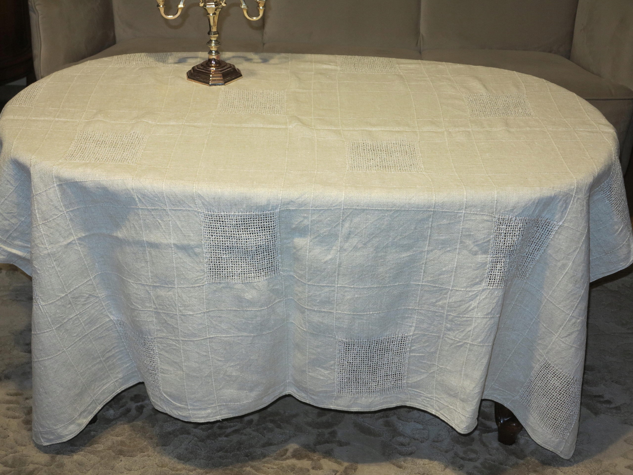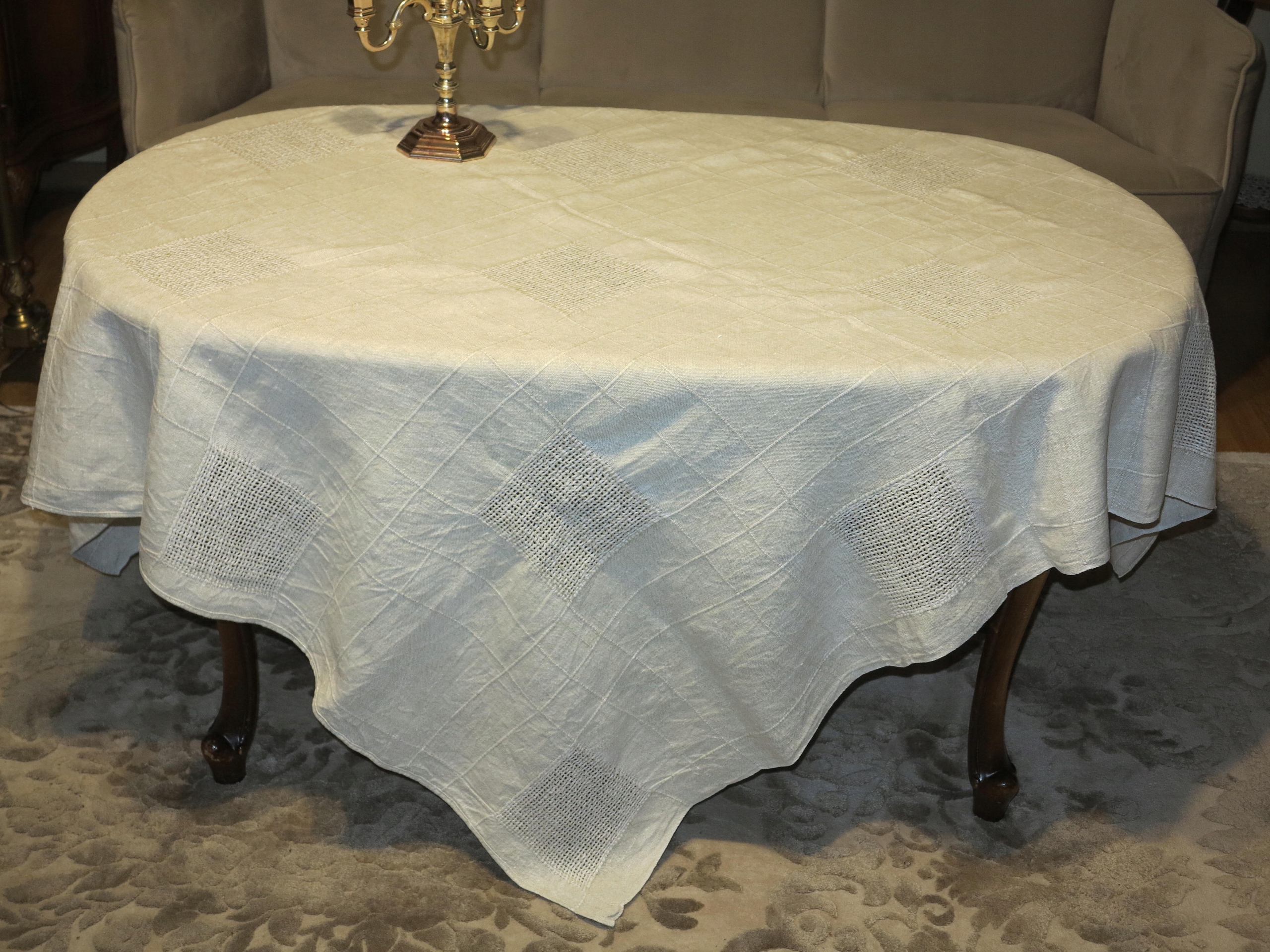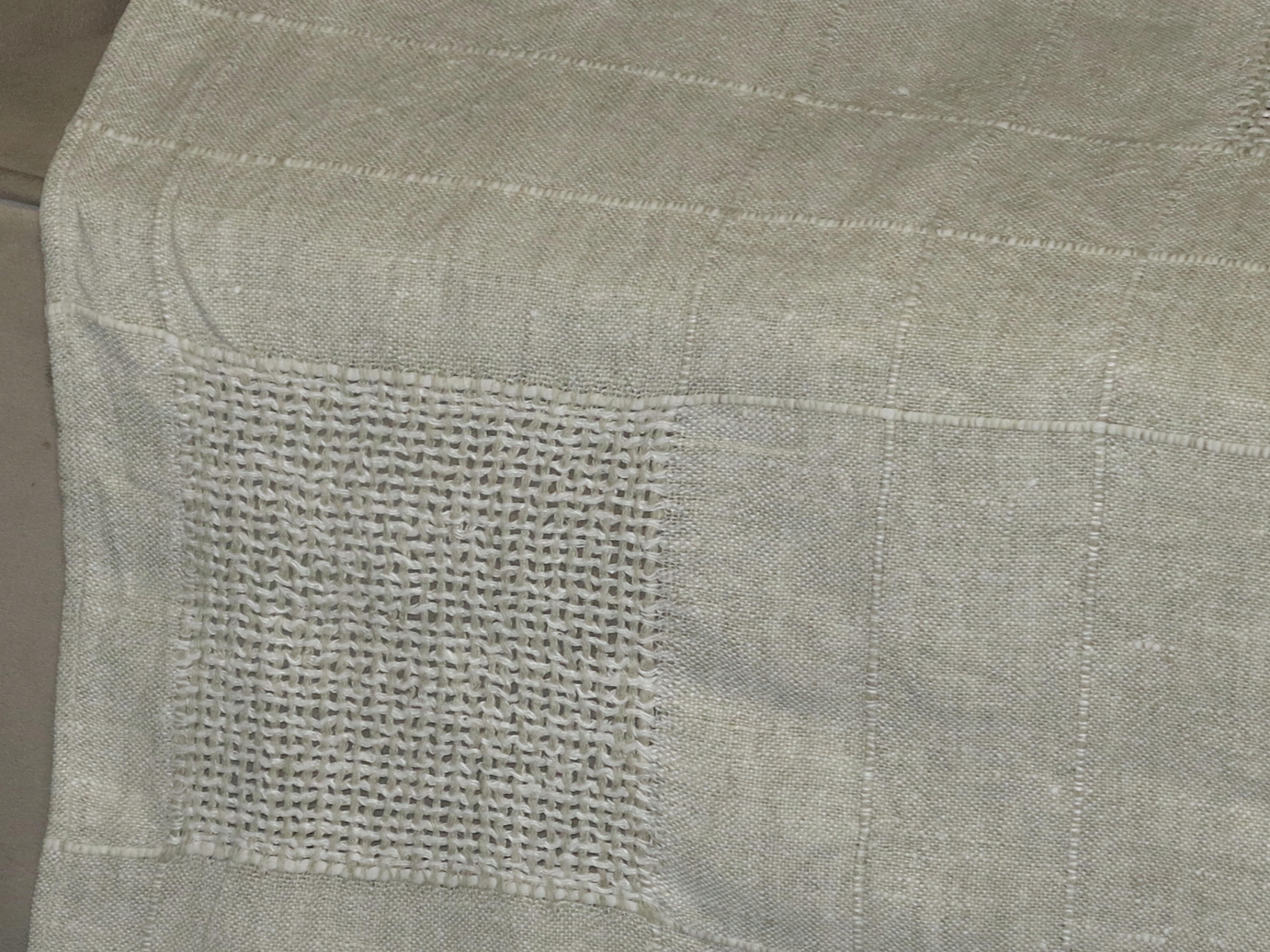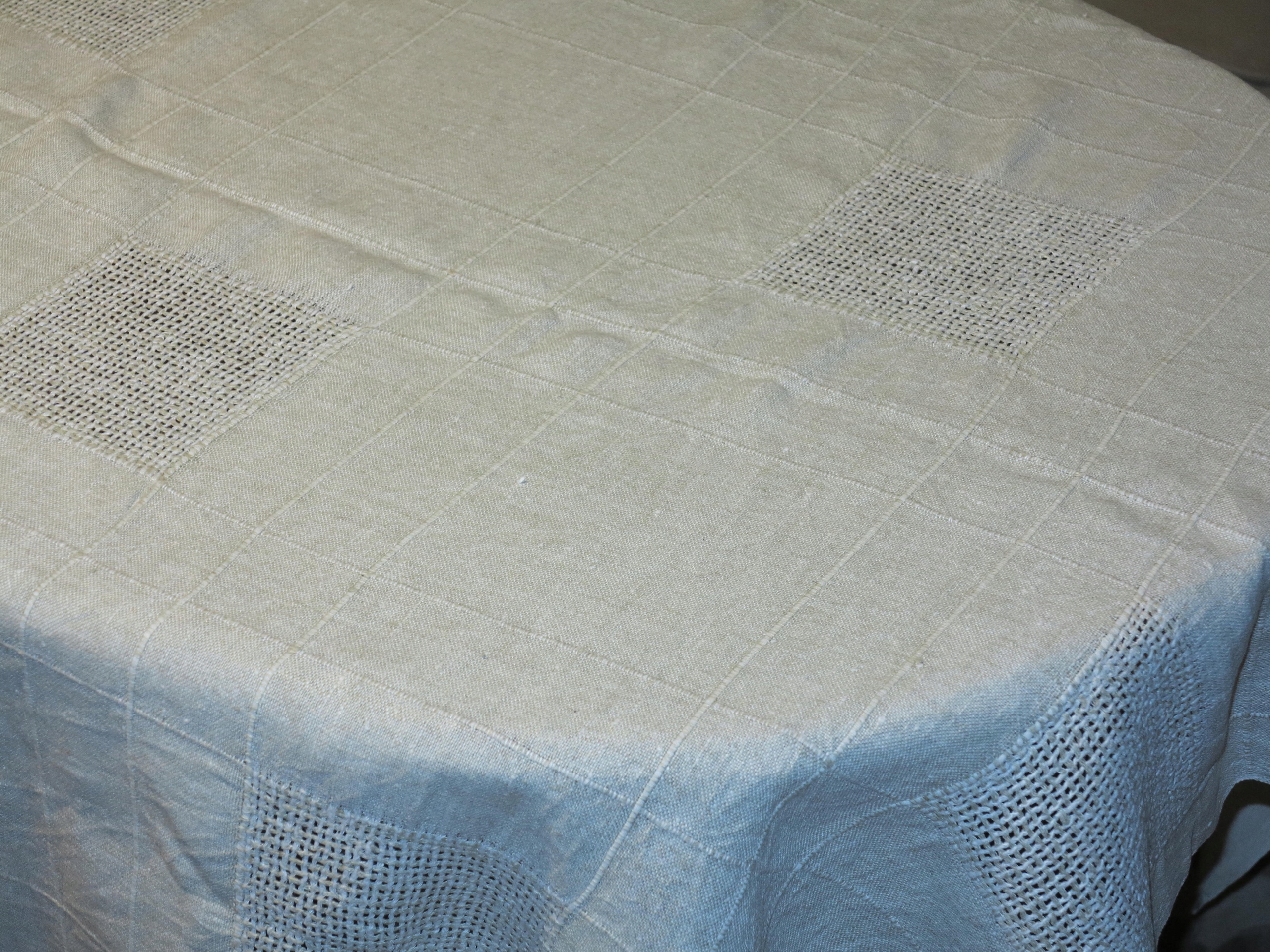 ГАРНУ, СТАРУ, ЧИСТИЙ ЛЬОН, НАТУРАЛЬНУ СКАТЕРТИНУ, ПОПІЛЯНО-БЕЖЕВУ, СКАТЕРТИНУ З ДУЖЕ МІЦНОГО, ЩІЛЬНОГО ЛЬОНУ. ВЕЛИКІ КВАДРАТНІ КВАДРАТИ НА СКАТЕРТИНУ РУЧНОЇ РОБІТКИ
