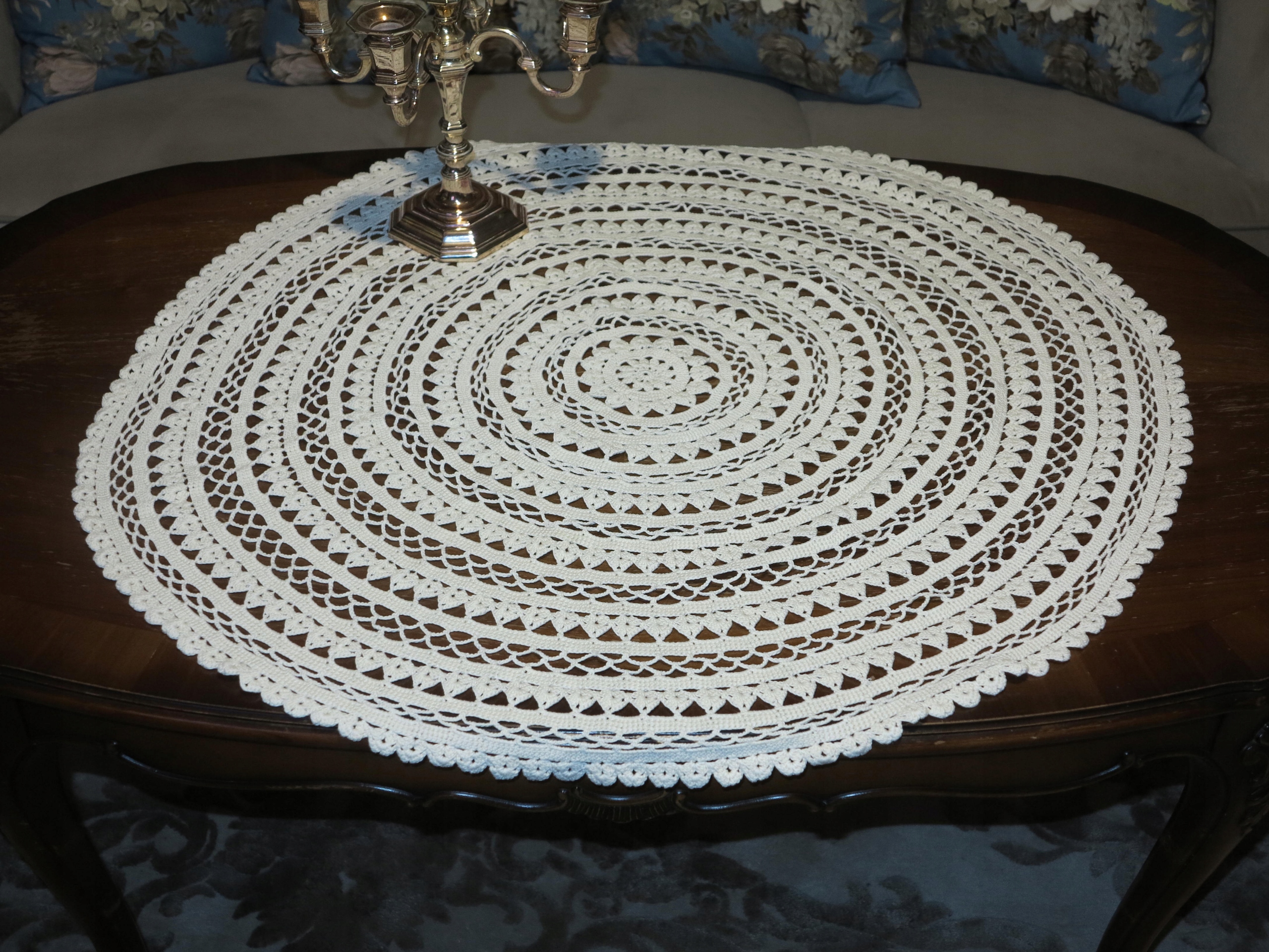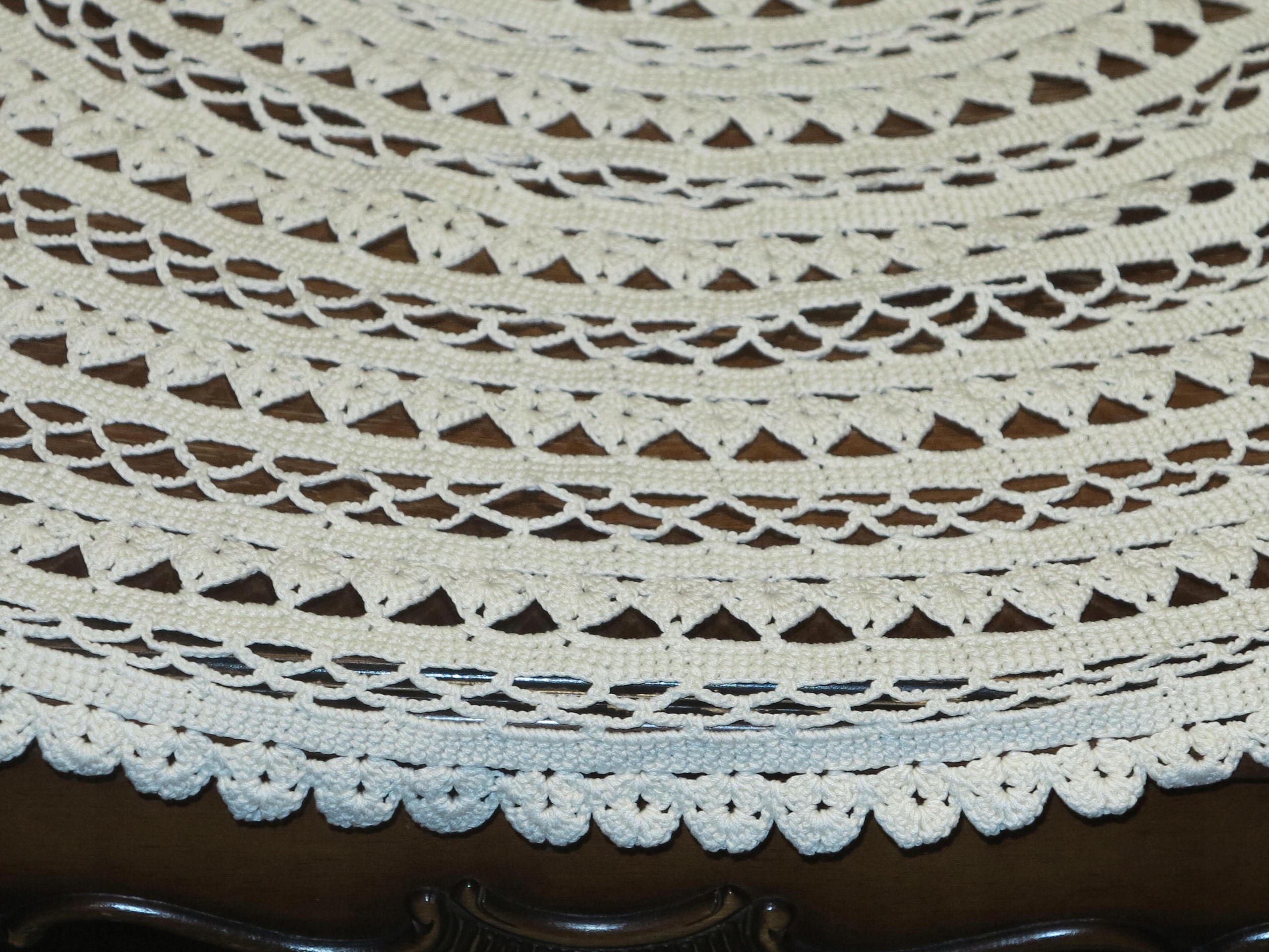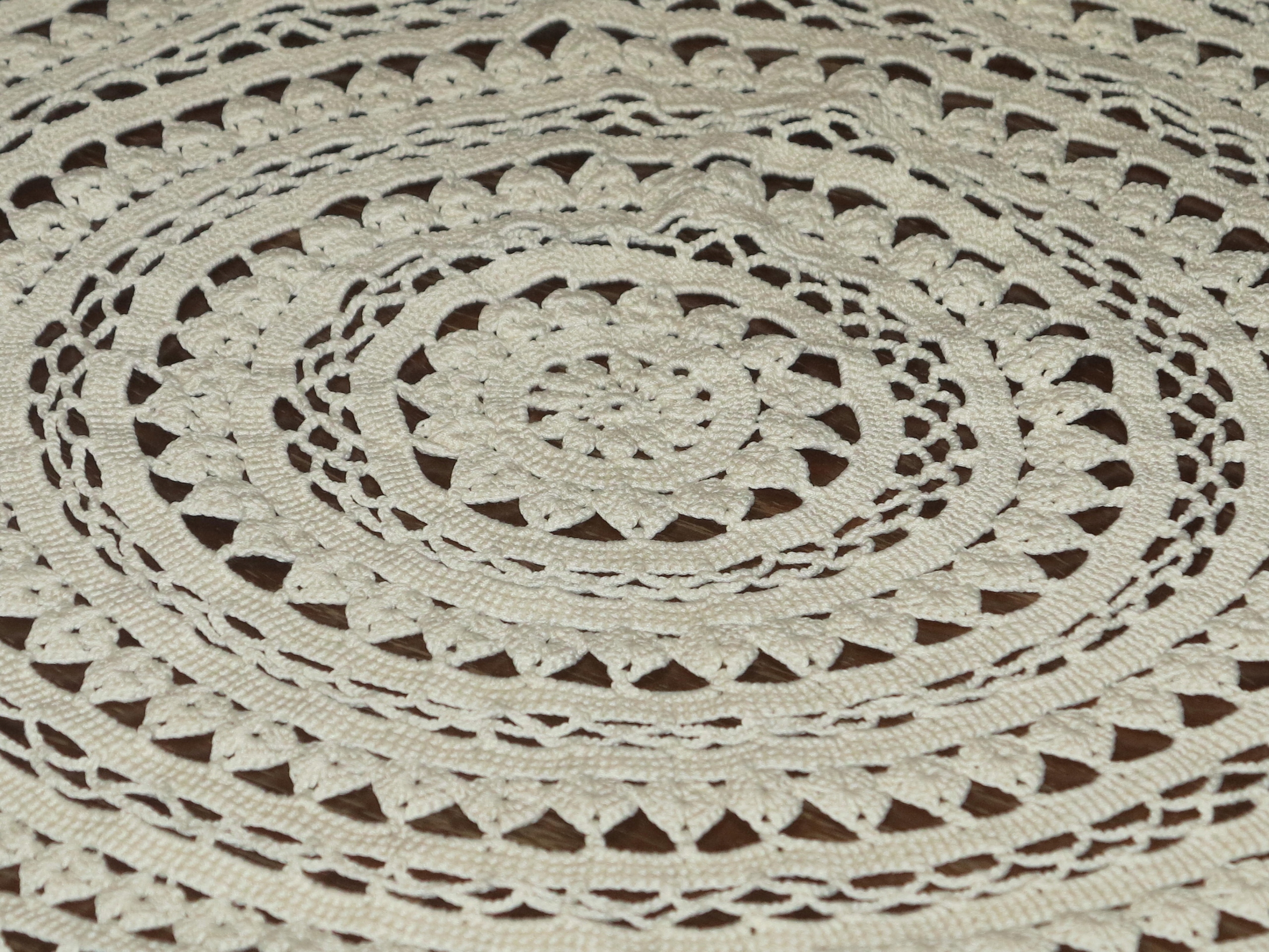 ГАРНУ, ПОВНІСТЮ РУЧНОГО В'ЯЗАННЯ, КРУГЛУ СТОЛЬНИЦЮ З БАВОВНЯНИХ КОРДОННИХ НИТОК. НИТКИ ТОВСТІ, ДИХАЮТЬ. КОЛІР ЕКРЮ