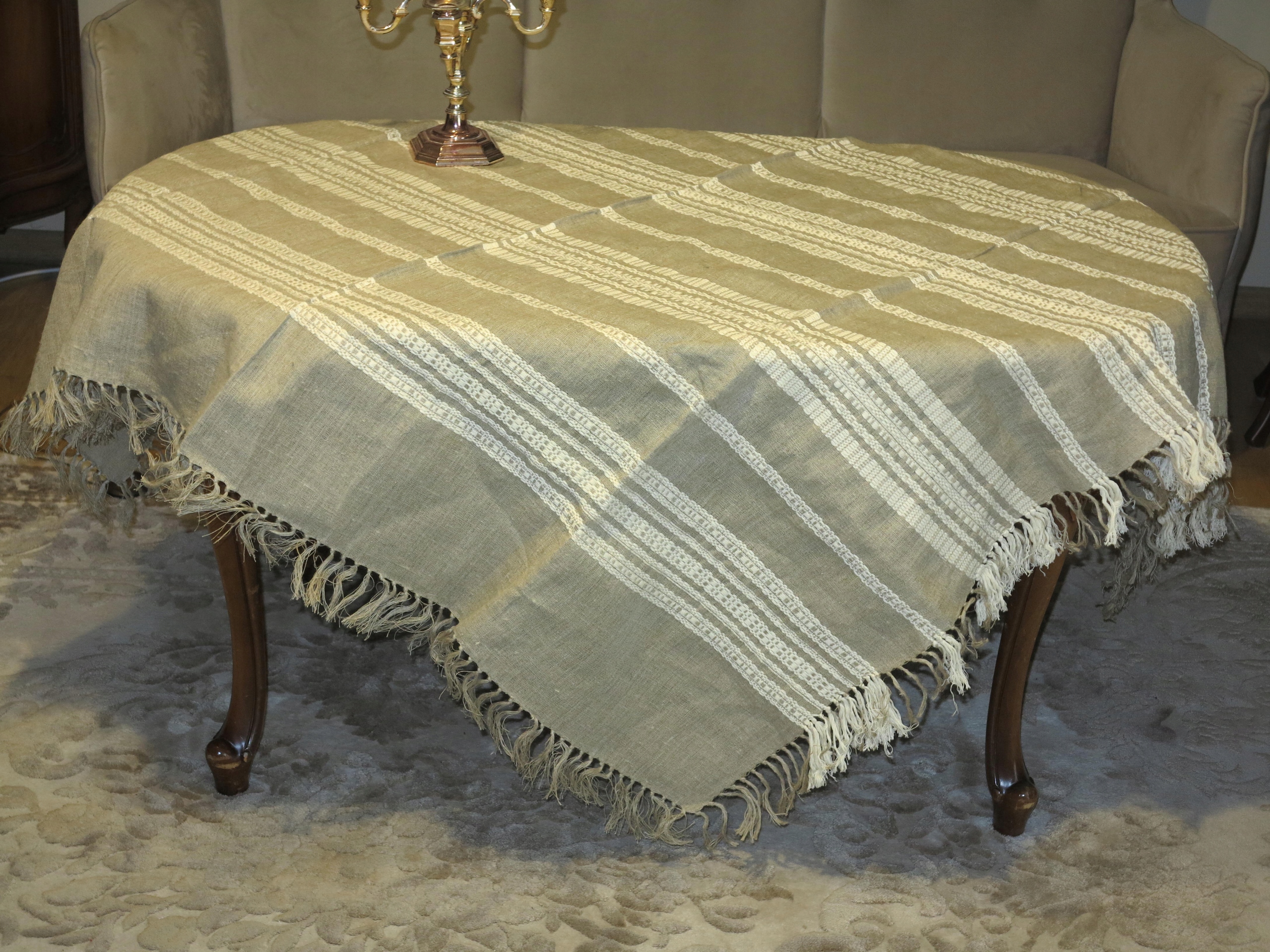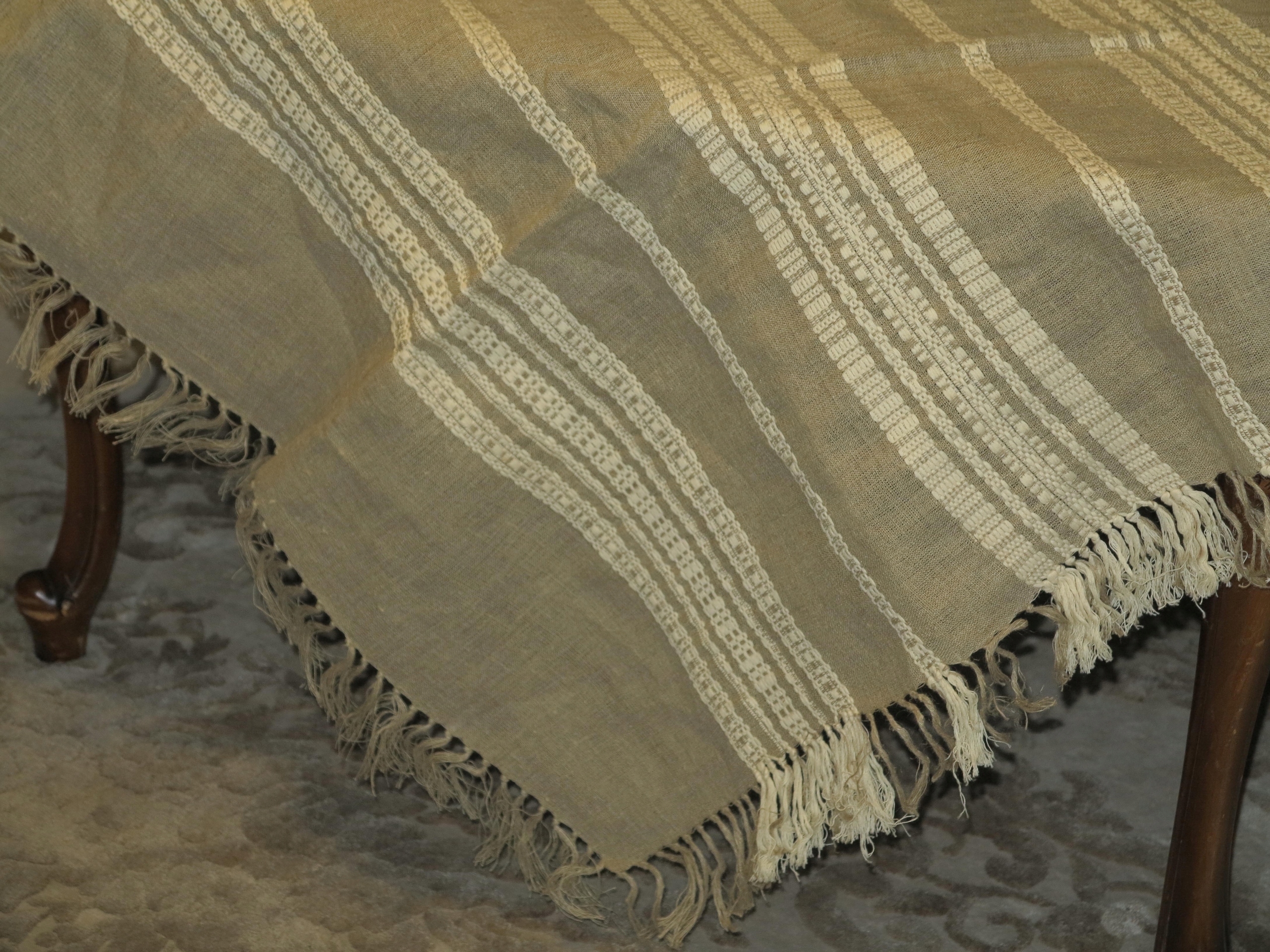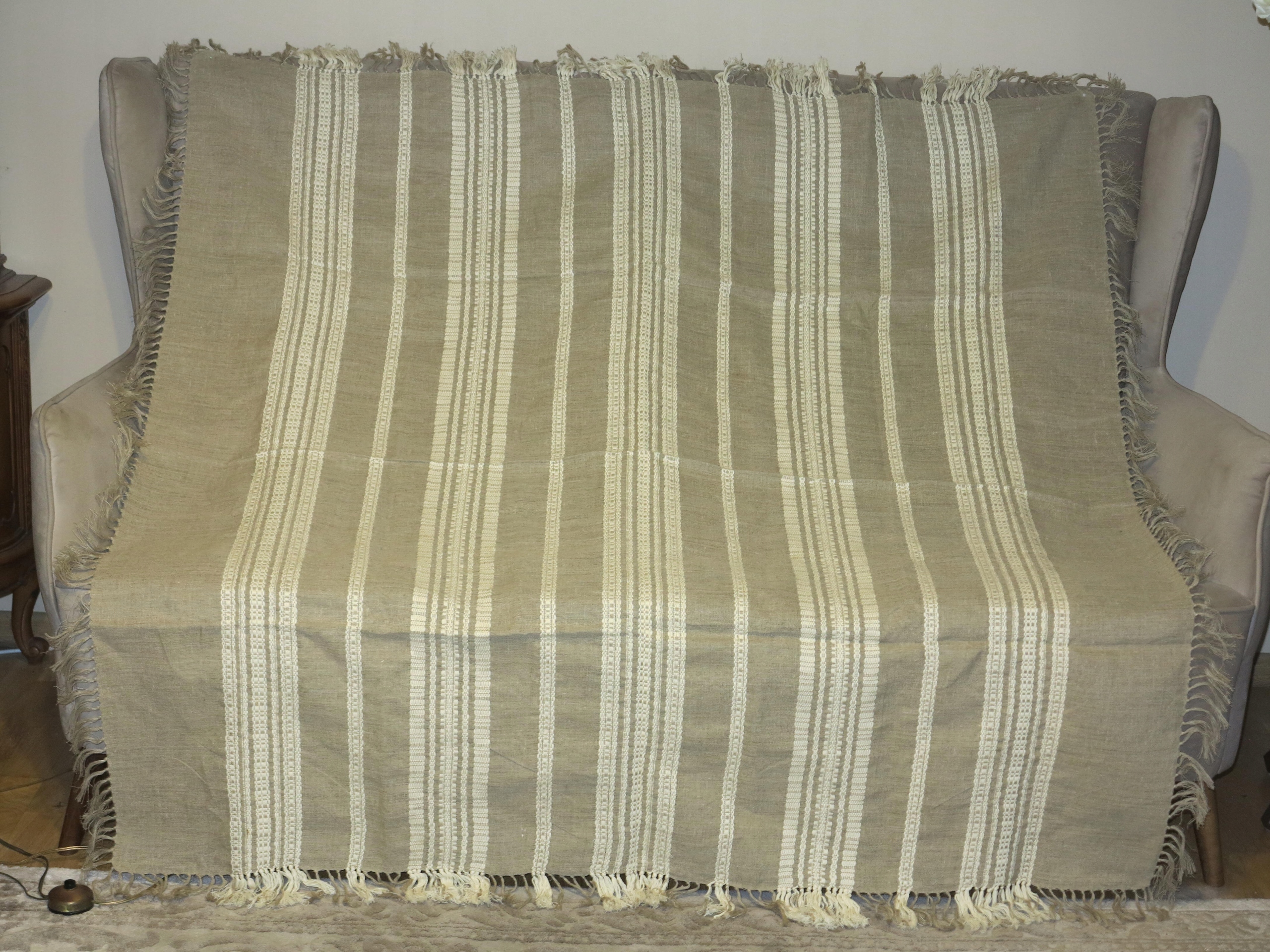 Предметом аукціону є стара, чиста лляна скатертина з пов’язаними бахромами. Його розміри: 150/150 см + бахрома. Скатертина б/в, у відмінному стані та якості незважаючи на вік. Рекомендую