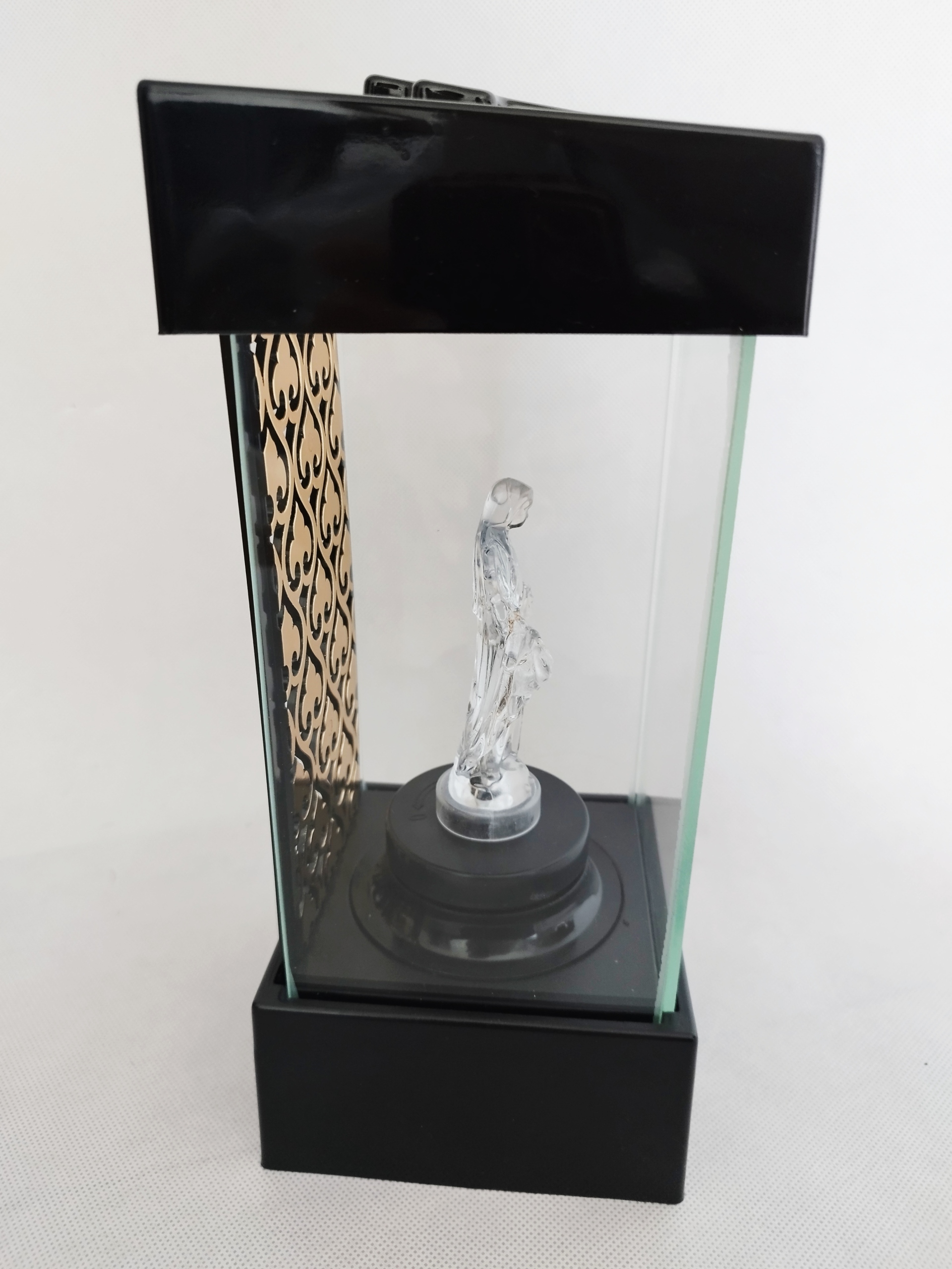 Сучасна свічка зі скляними стінками. На задній частині свічки є стінка з золотим декором. Ліхтарик постачається зі світлодіодною фігуркою Марії, яка світиться СИНИМ. Поставляється з батарейками.