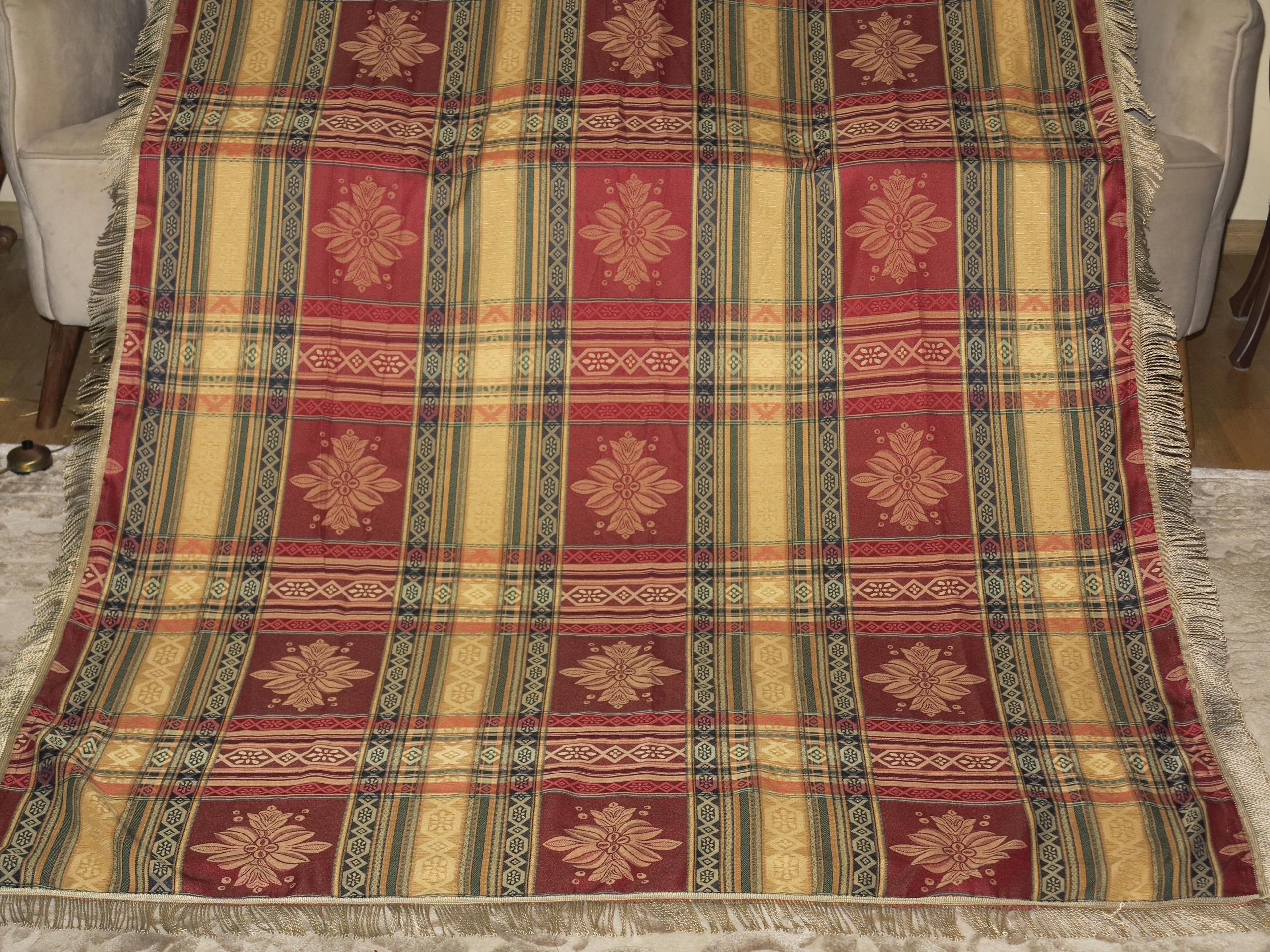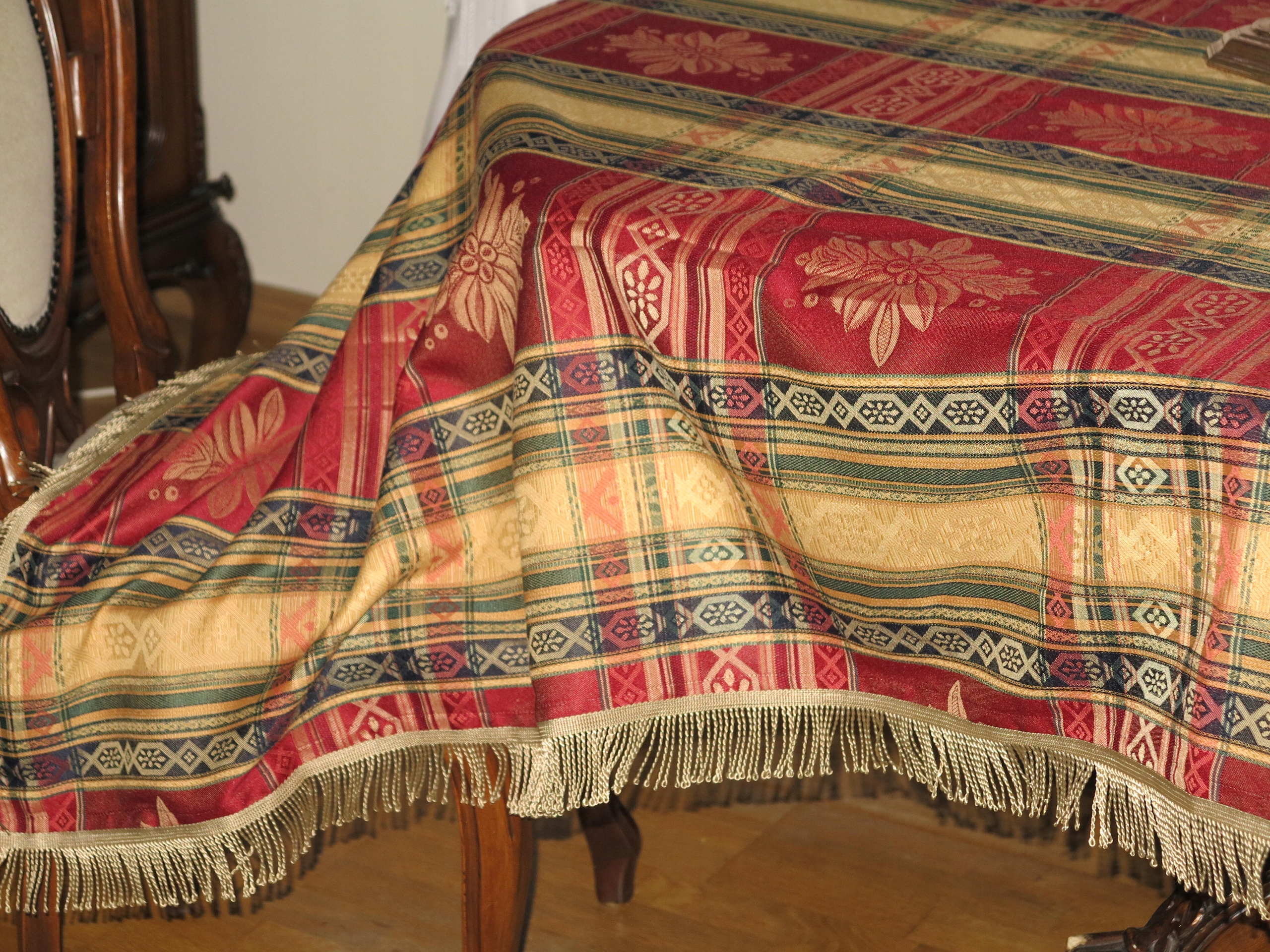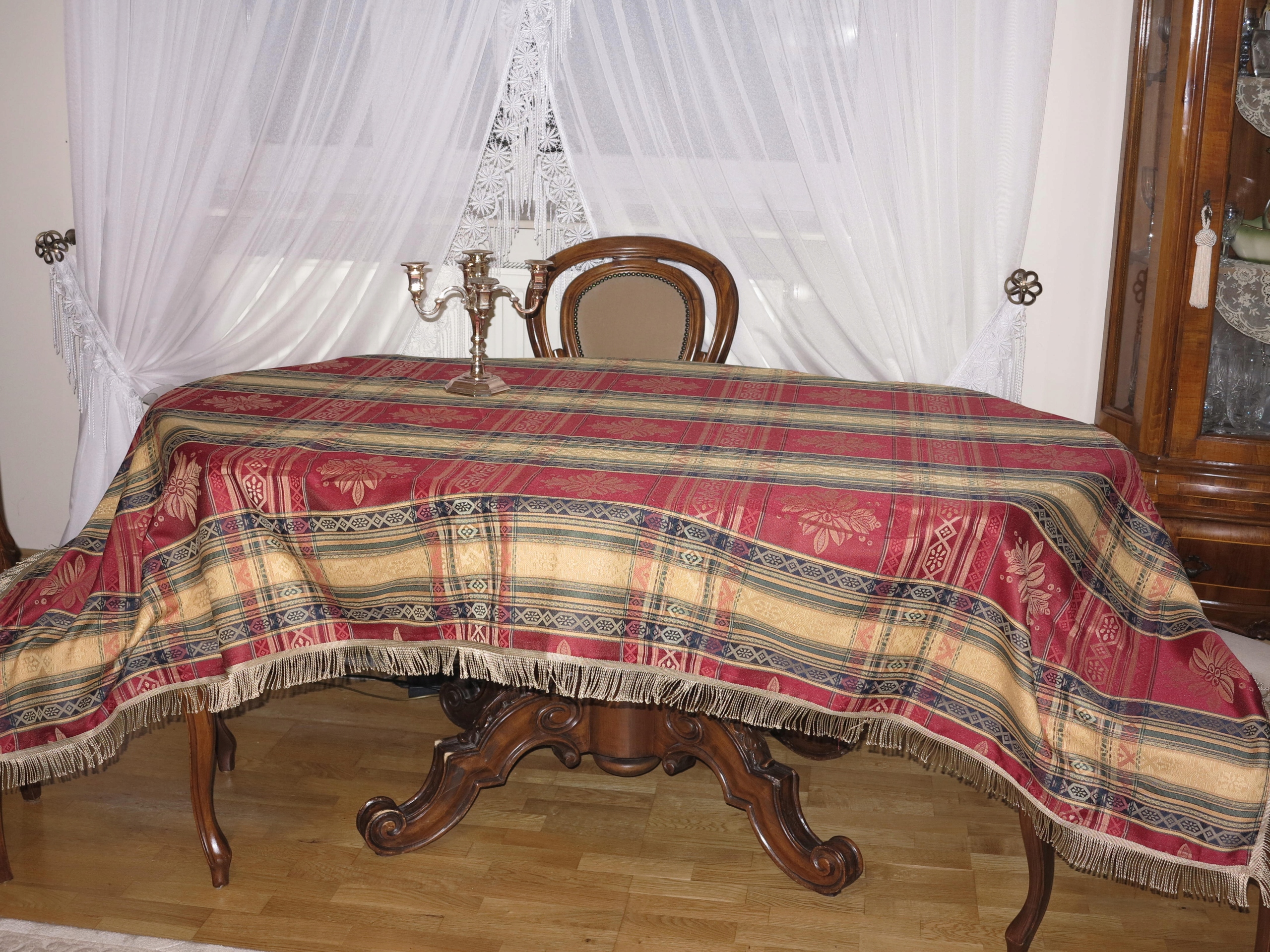 Предметом аукціону є надзвичайно красива, стильна скатертина з м'ясистої, міцної та дуже міцної жаккардової тканини зі смугами Ludwik. Кругом гарна бахрома. Розміри скатертини: 235/135см + бахрома 5см. Скатертина б/у, але у відмінному стані та якості, щиро рекомендую.