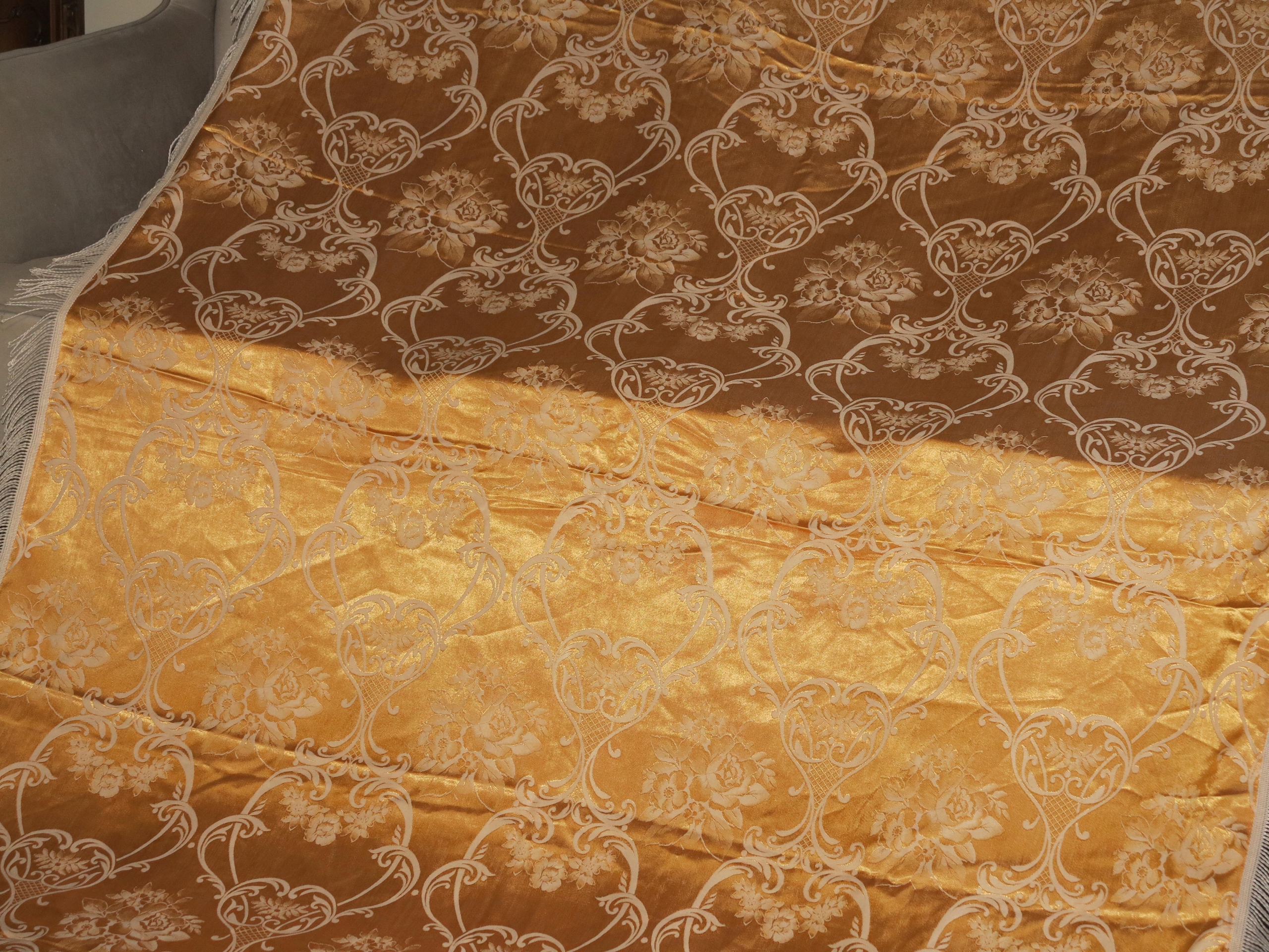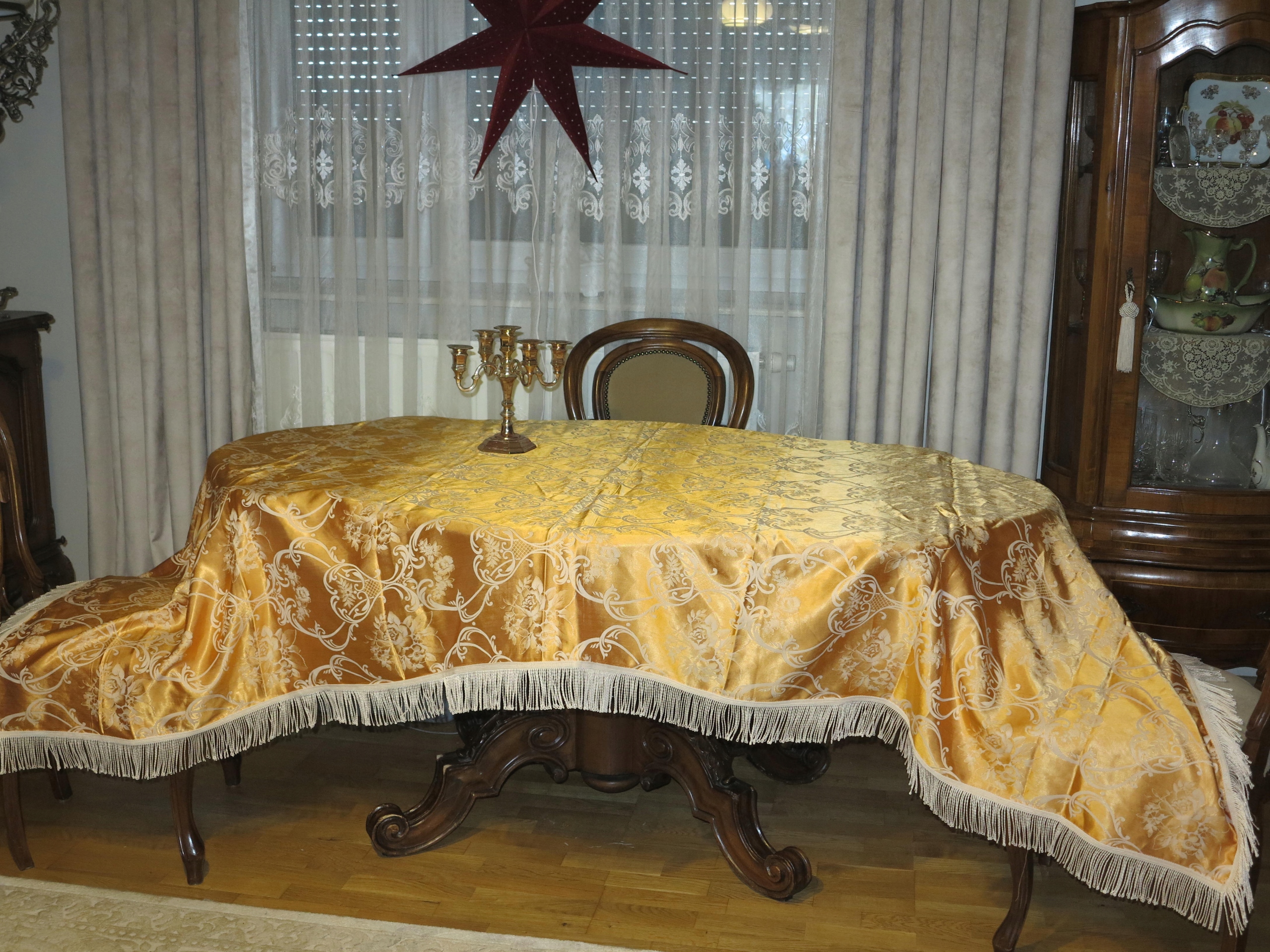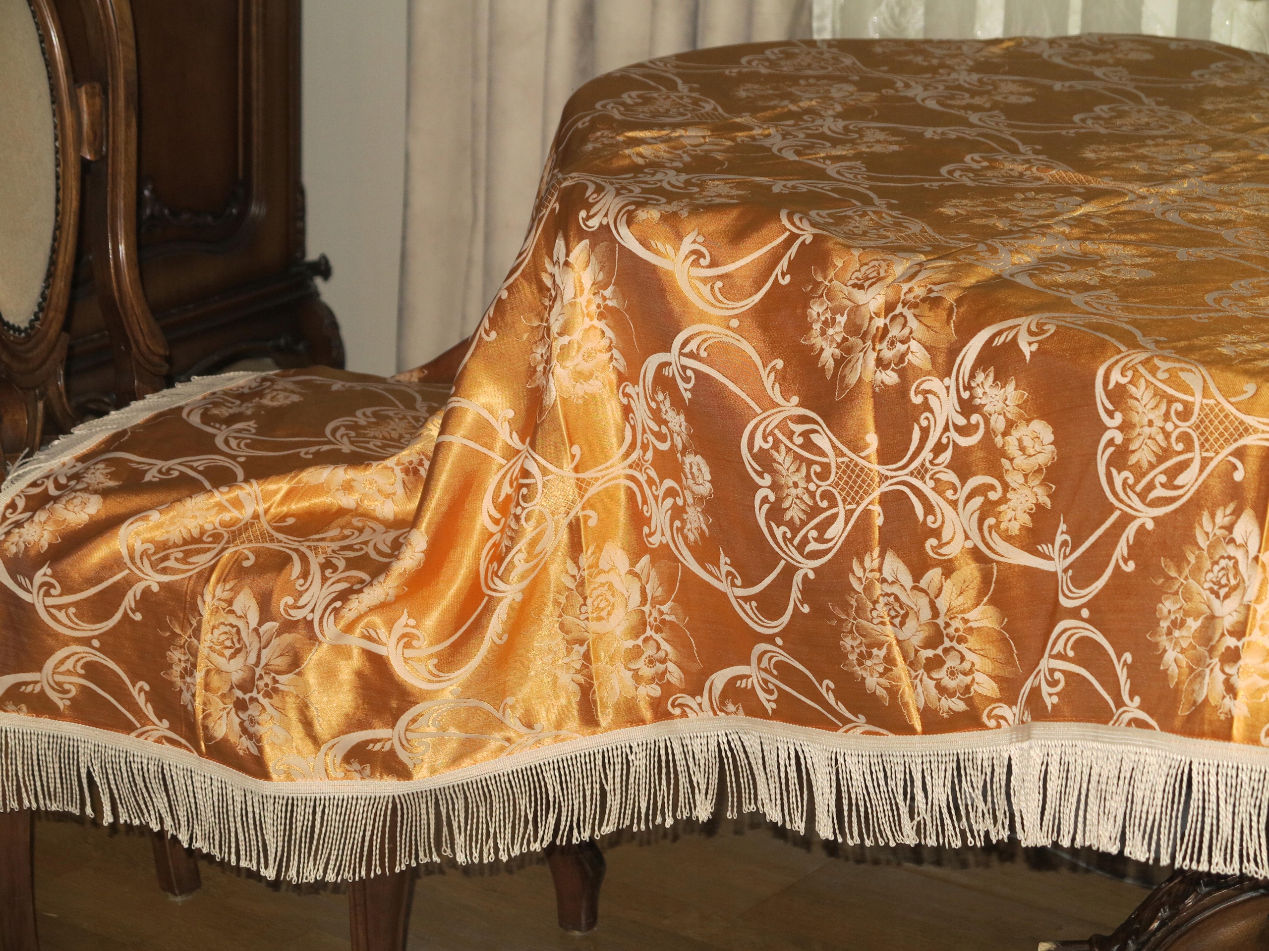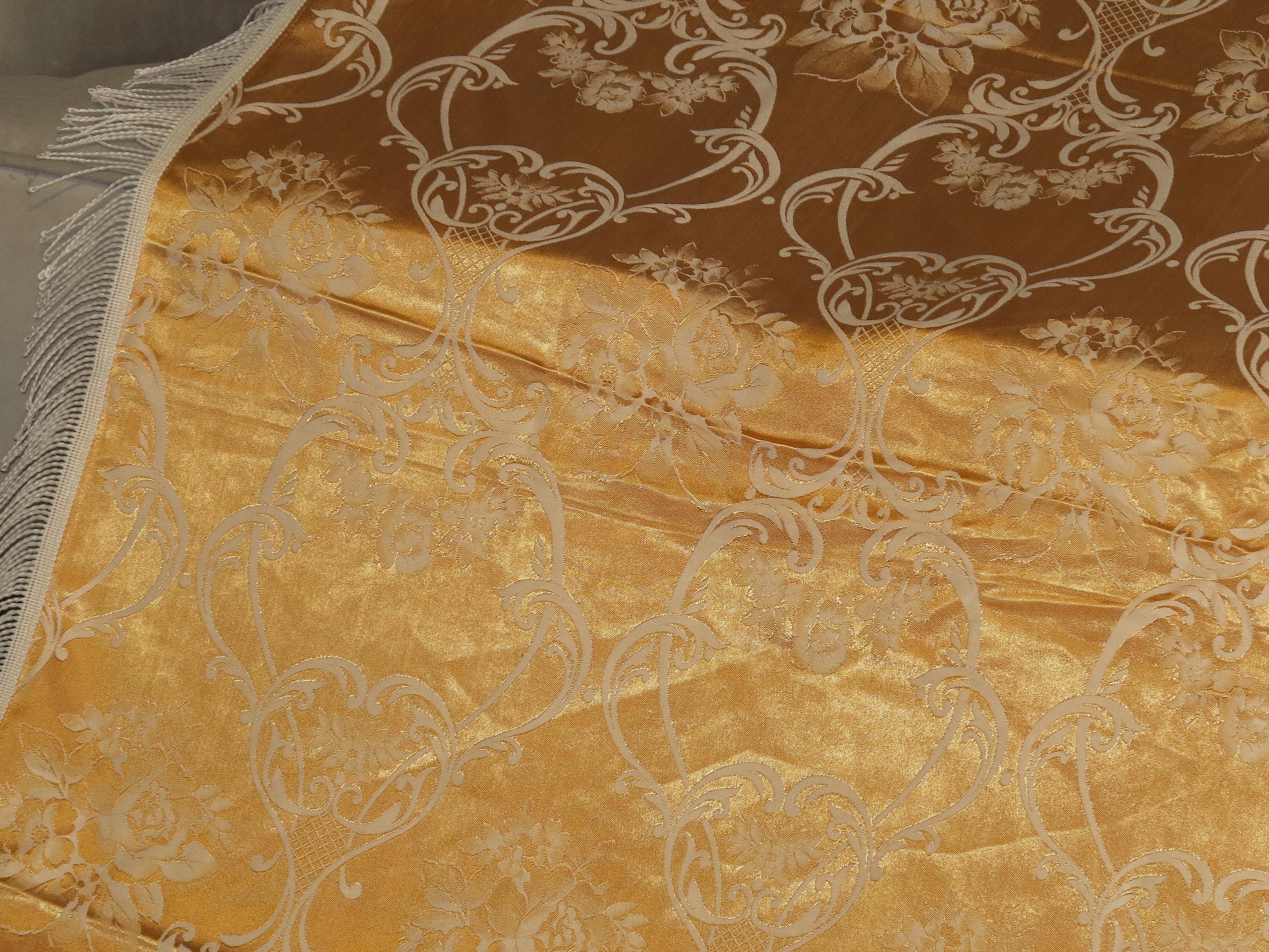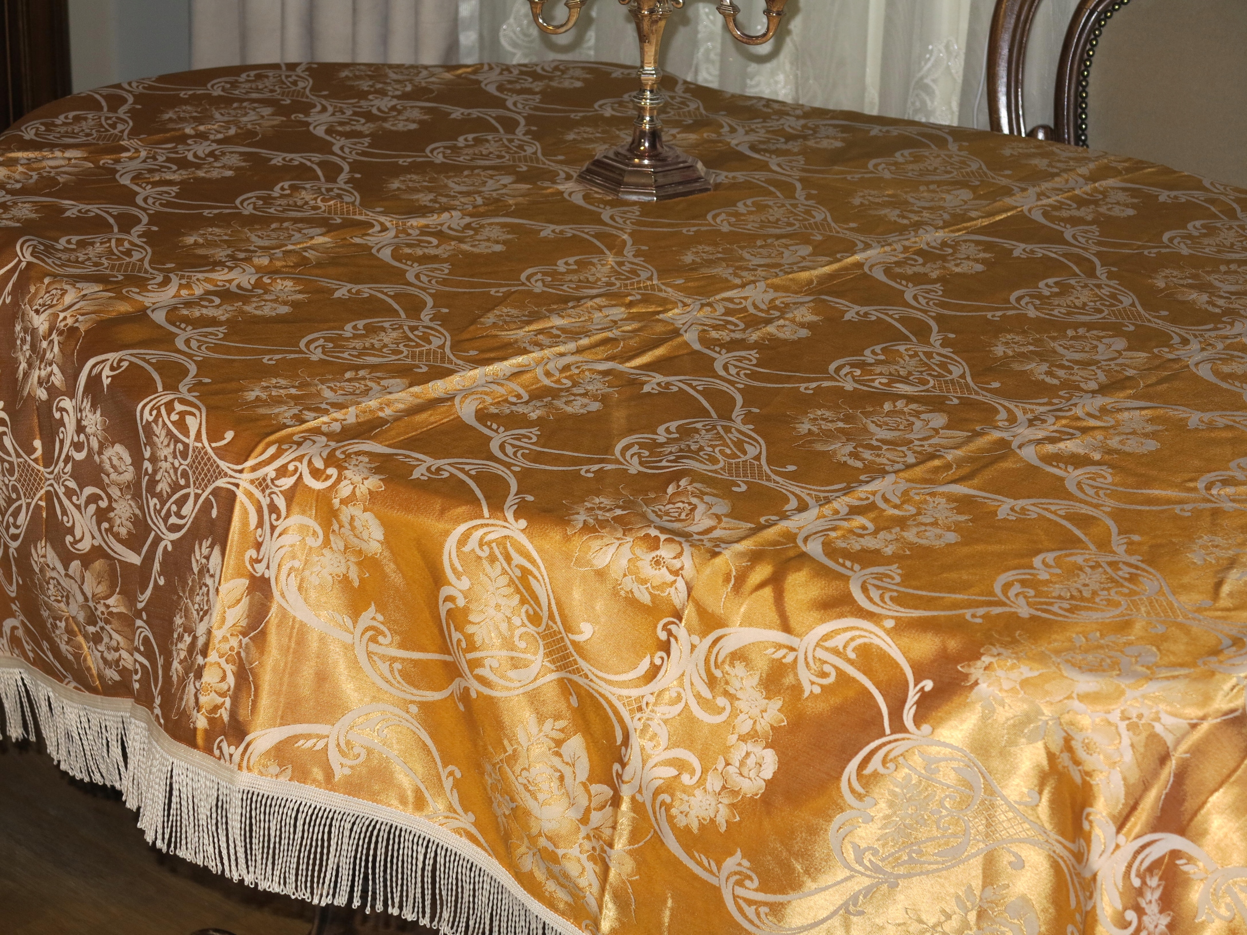 ГАРНУ СОЦІЛЬНУ ВЕЛИЧЕЗНУ СКАТЕРТИНУ З ЩІЛЬНОЇ БАВОВНИ ТА ШОВКУ ДАДАШЕ ЗІ СТИЛЬНИМ ВІЗЕРУНКОМ І НА СКАРСІ НАШИБОВАНІ ТРОЯНДИ. НАВКОЛ ПРИКРАШЕНИЙ БАХОМРОЮ. КОЛЬОР ЗОЛОТА З ВІДТІНКОМ АБРИКОСА