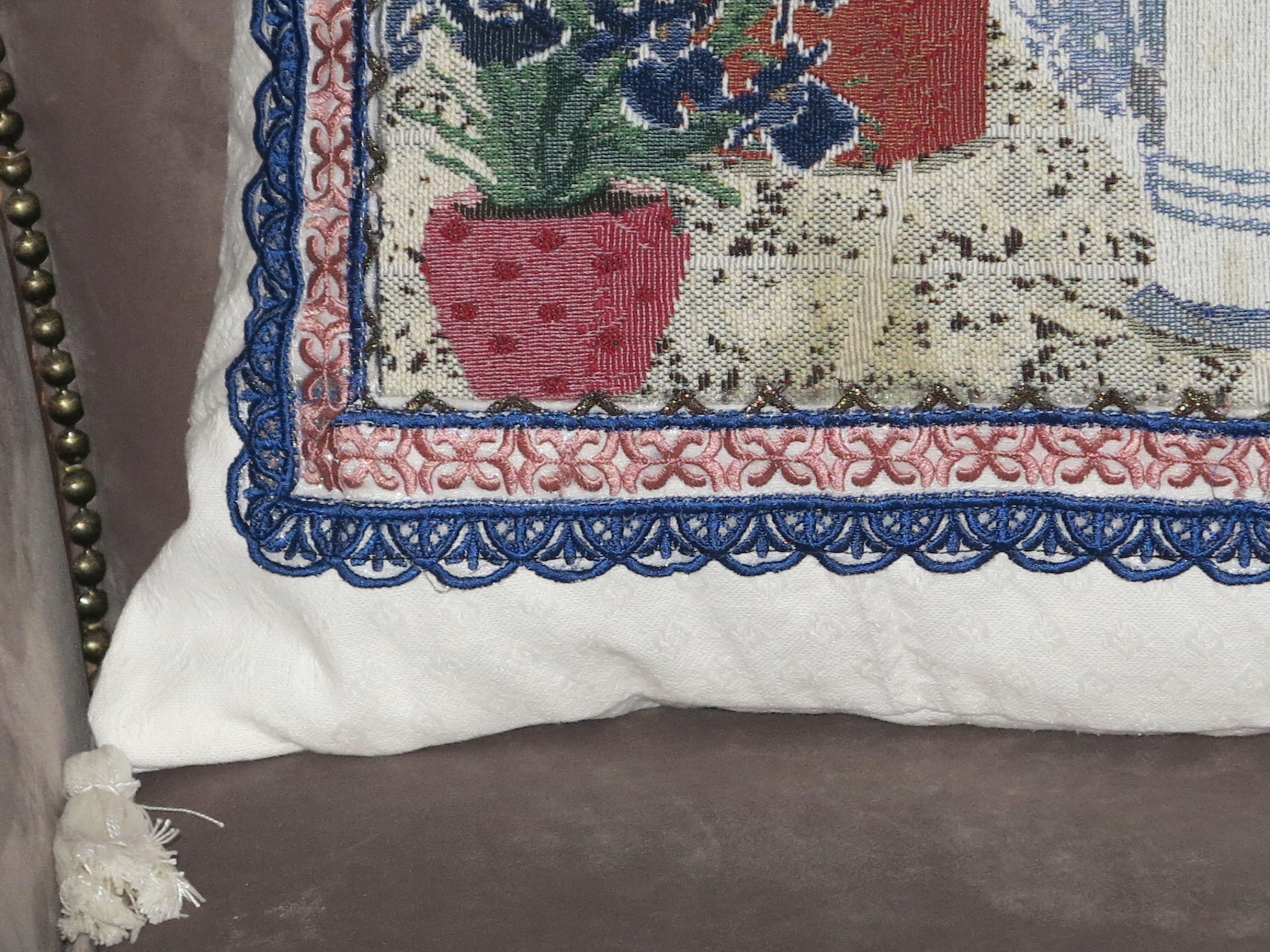 ГАРНУ ВЕЛИКУ ПОДУШКУ ВАТОВУ З ГОБЕЛІНОМ ТА НАПОВНЮВАЧОМ. ПОМПОНИ НА КУТАХ