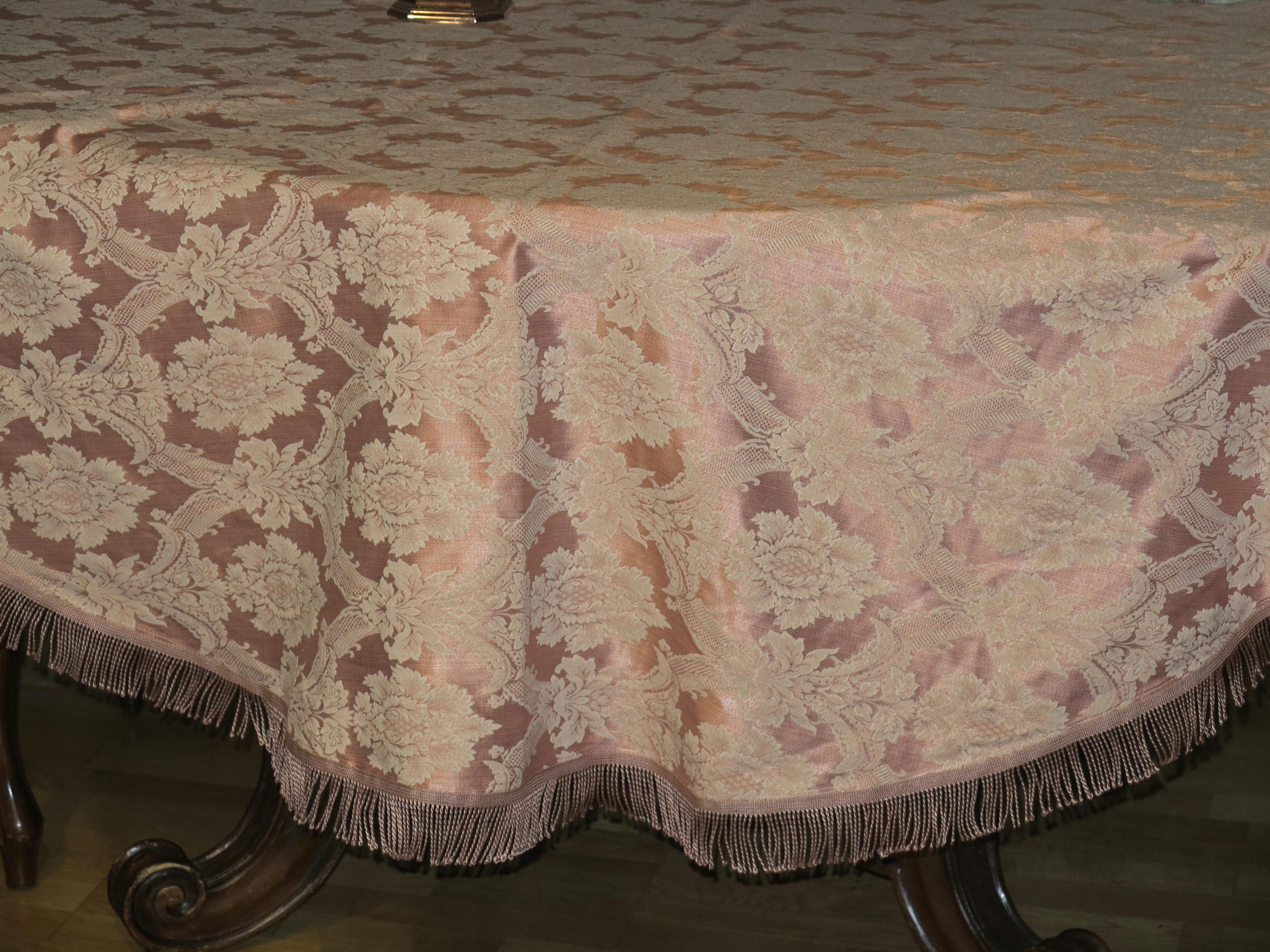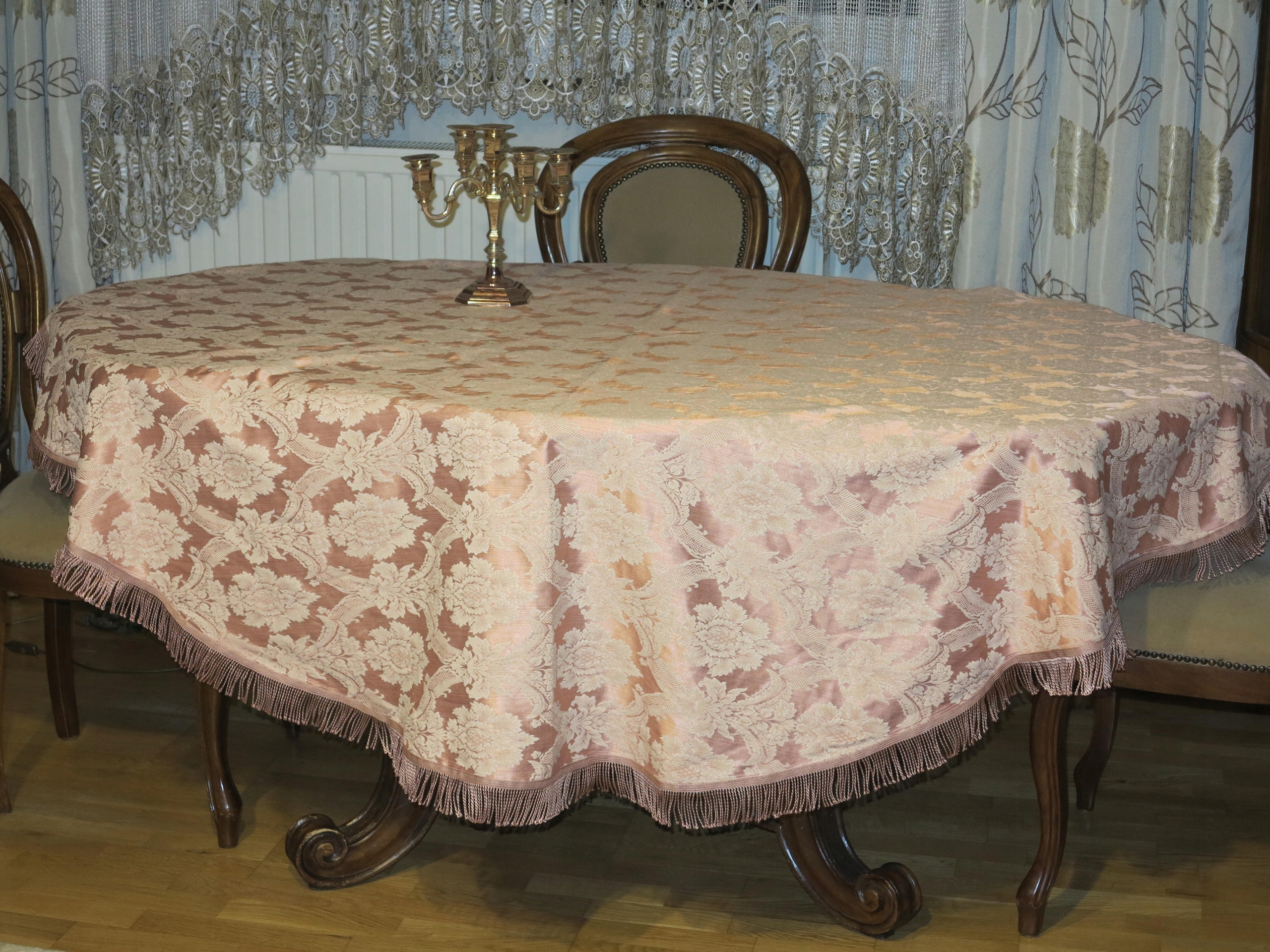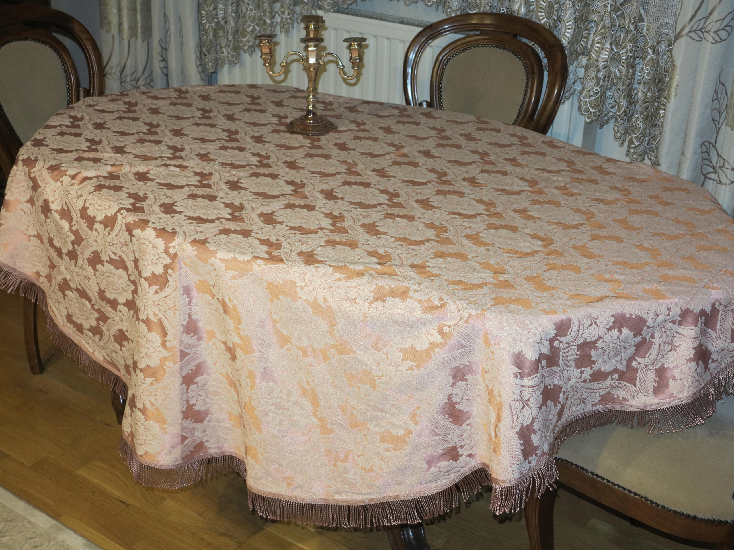 ГАРНУ ВЕЛИКУ АНГЛІЙСЬКУ скатертину З БАВОВНЯНОГО ЖАККАРДУ ПУДРОВО-РОЖЕВОГО КОЛЬОРУ З ВИЗІЛЕНКОМ AQANTO. TNA НАВОКРУГ ПРИКРАШЕНА БАРОМКОЮ.