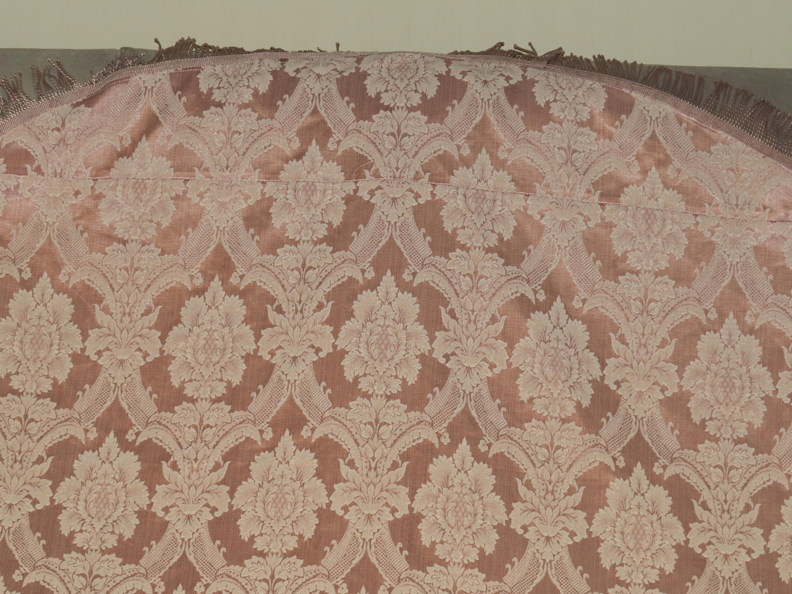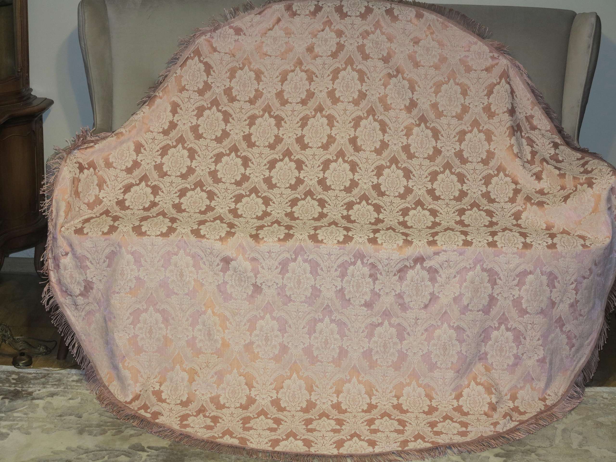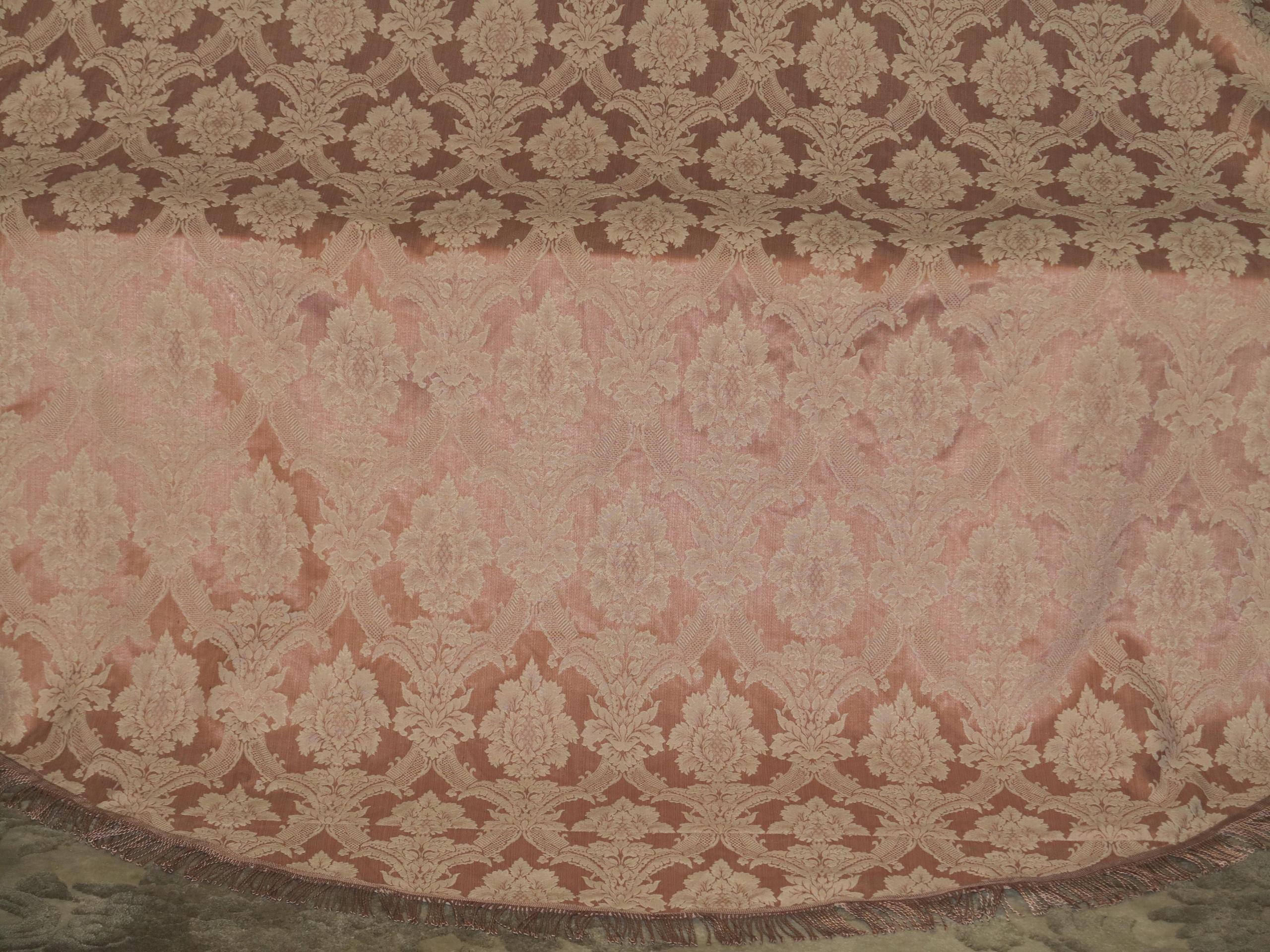 ГАРНУ ВЕЛИКУ АНГЛІЙСЬКУ скатертину З БАВОВНЯНОГО ЖАККАРДУ ПУДРОВО-РОЖЕВОГО КОЛЬОРУ З ВИЗІЛЕНКОМ AQANTO. TNA НАВОКРУГ ПРИКРАШЕНА БАРОМКОЮ.