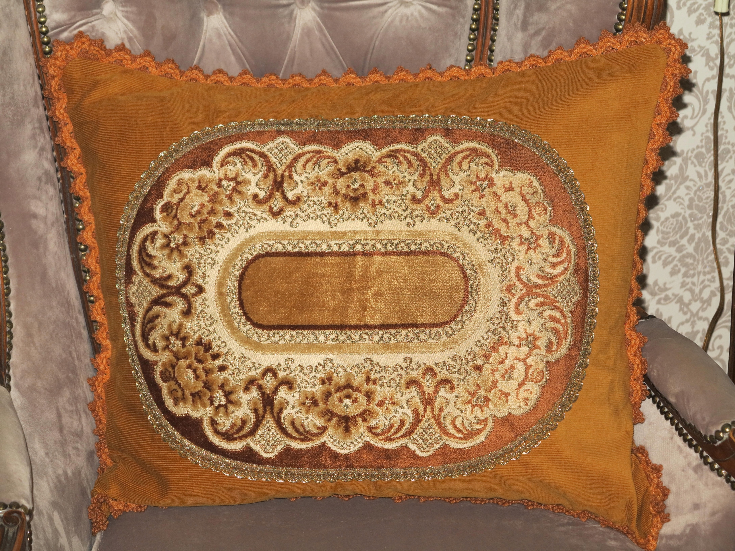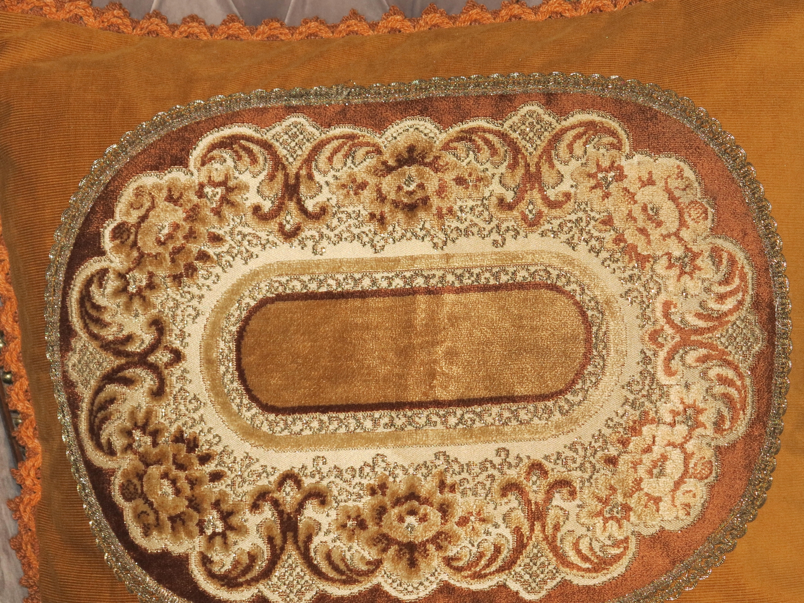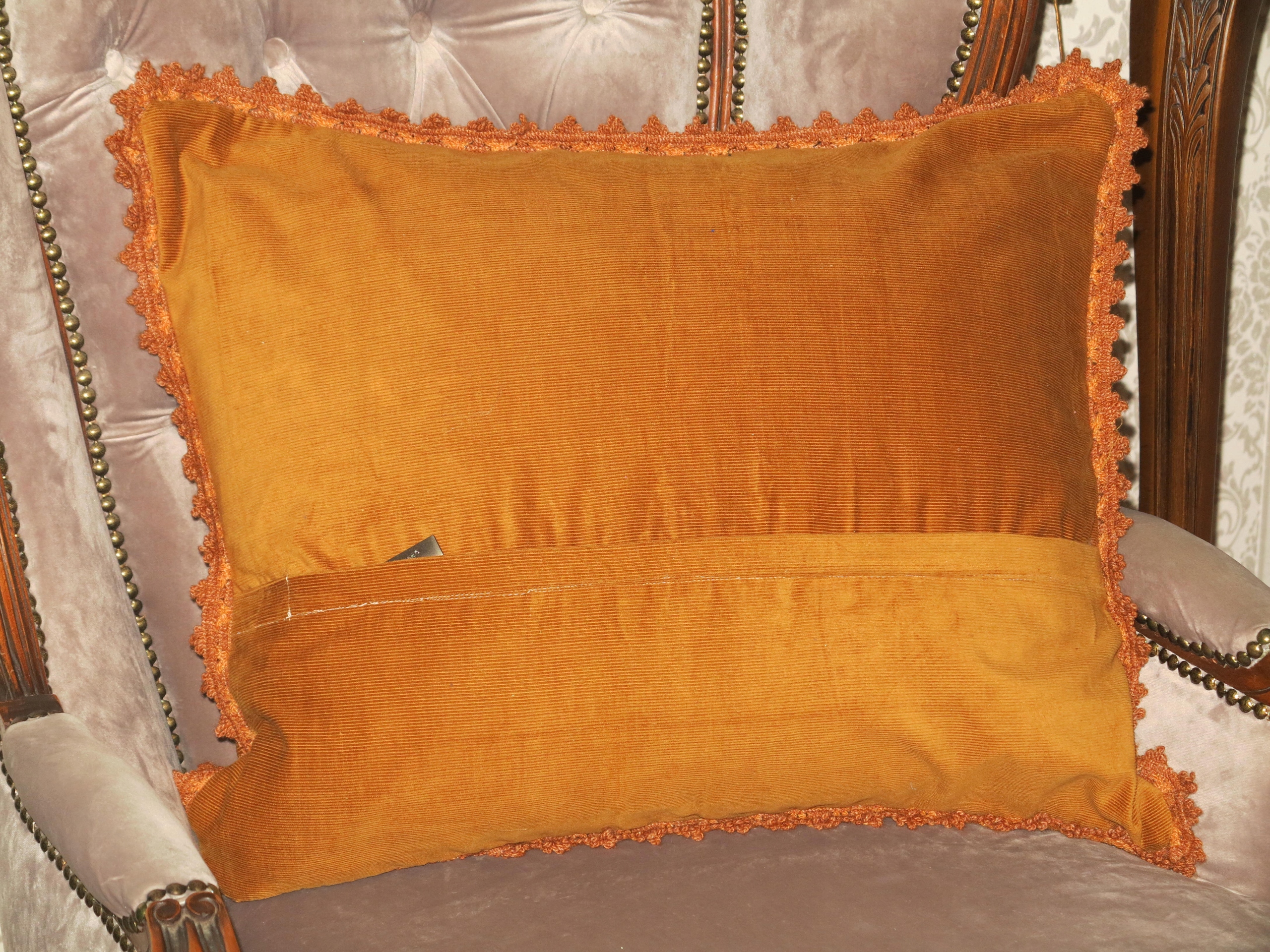 ГАРНУ, ДУЖЕ ВЕЛИКУ ДЕКОРАТИВНУ ОКСАМИТОВУ ПОДУШКУ З НАПОВНЮВАЧОМ. СПЕРЕДУ — гобелен із старовинною галантереєю зі старого золота. НАВКОЛ ПРИКРАШЕНИЙ ЩІЛЬНИМ МЕРЕЖИВОМ. ОКСАМИТ В ТОНКІ СМУЖКИ