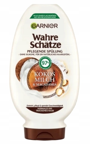 Кондиціонер для волосся Garnier True Treasures Coconut Milk & Macadamia балує нормальне та сухе волосся, забезпечуючи йому інтенсивний догляд. Поживна формула кондиціонера забезпечує помітно м'яке, еластичне волосся, яке сяє шовковистим від коренів до кінчиків. Кремовий кондиціонер Garnier True Treasures також балує вас своїм чуттєвим ароматом.