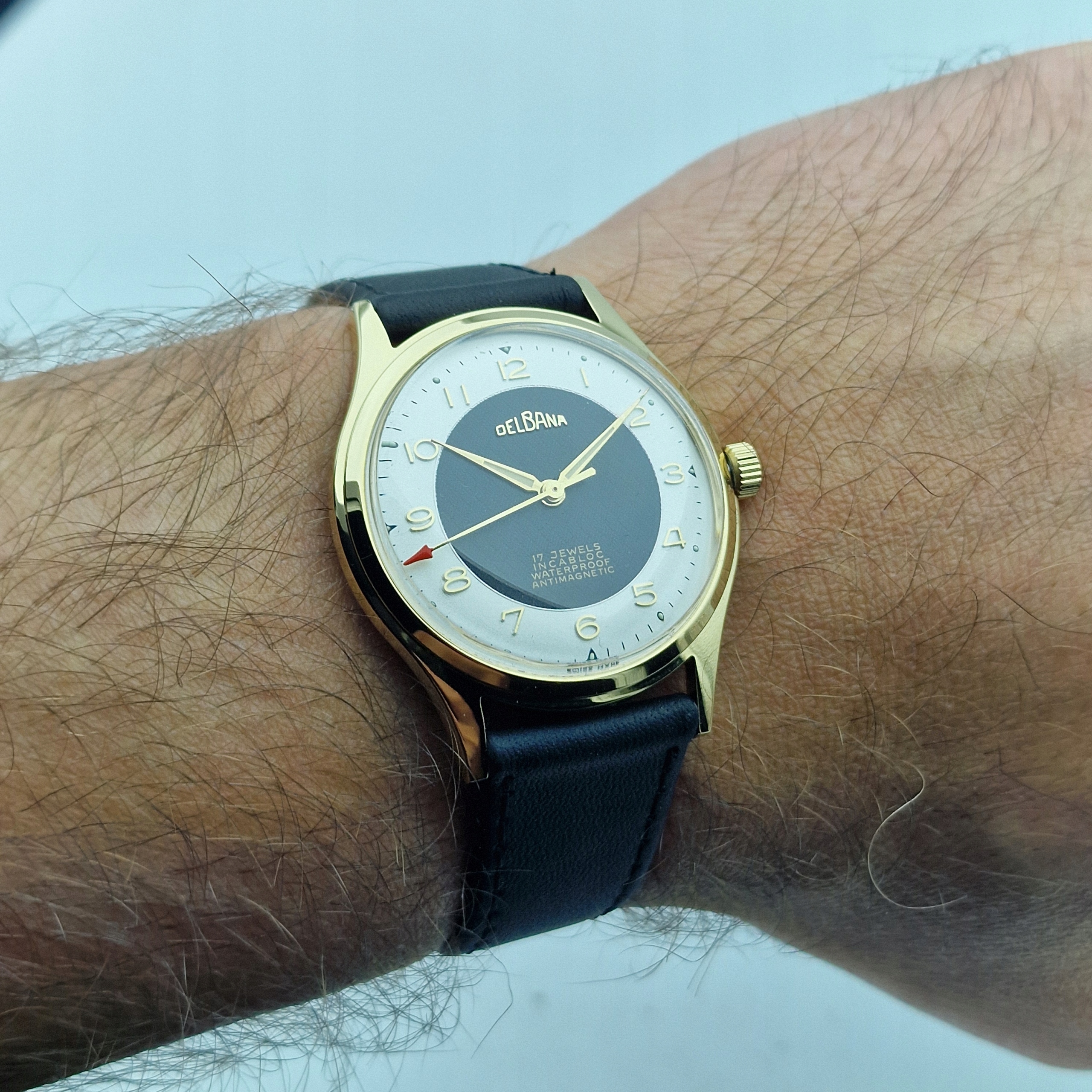 - Сріблястий металевий циферблат із чорним центром, золотими годинниковими мітками та красивим декором. Оригінальний циферблат із підписом: «DELBANA, 17 JEWELS, INCABLOC, WATERPROOF, ANTIMAGNETIC, SWISS MADE». Циферблат в ідеальному стані, видно на фото.
