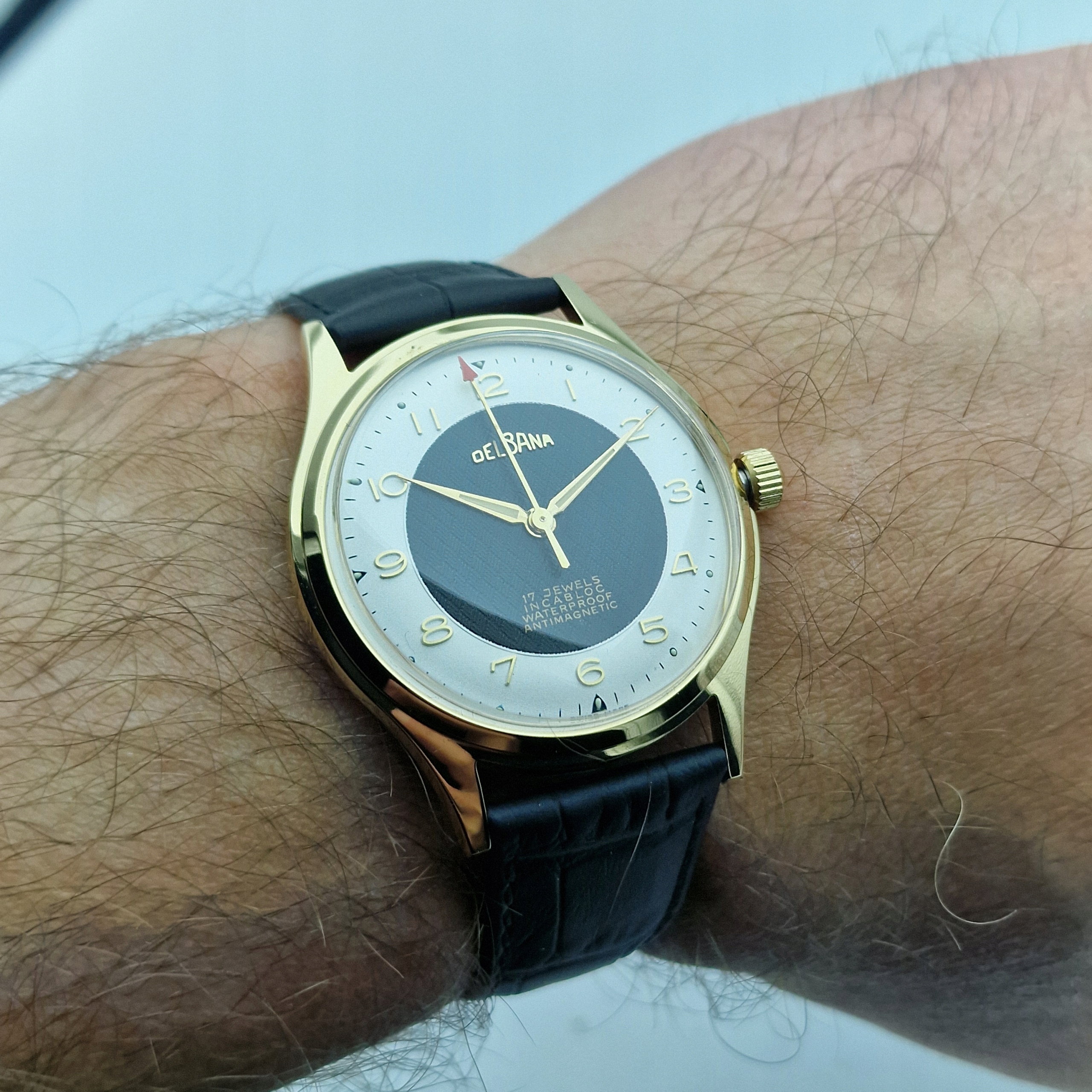 ГАРНИЙ ЧОЛОВІЧИЙ ЧОЛОВІЧИЙ ЧОРНИЙ ГОДИННИК DELBANA ПОЗОЛОЧЕНИЙ, 1950-ті роки - ІДЕАЛЬНИЙ