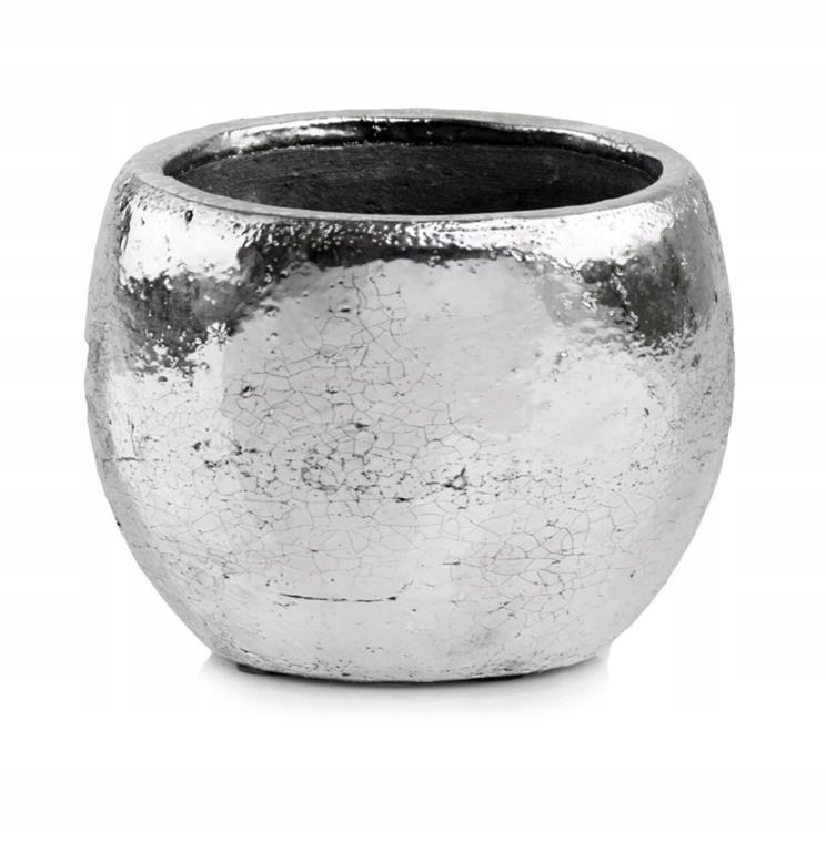 Квітковий горщик у формі кулі. Керамічна кришка для каструлі з виключно оригінальною фактурою - багато заломів, подряпин, тріщин і нерівностей. Все це разом створює прекрасний ефект старого, але не позбавленого блиску срібла. Срібне покриття отримано за допомогою техніки гальванопластики. Це пропозиція з позачасовою естетикою, масивна, дуже декоративна, яка є сильним і незамінним декоративним елементом будь-якого інтер’єру.