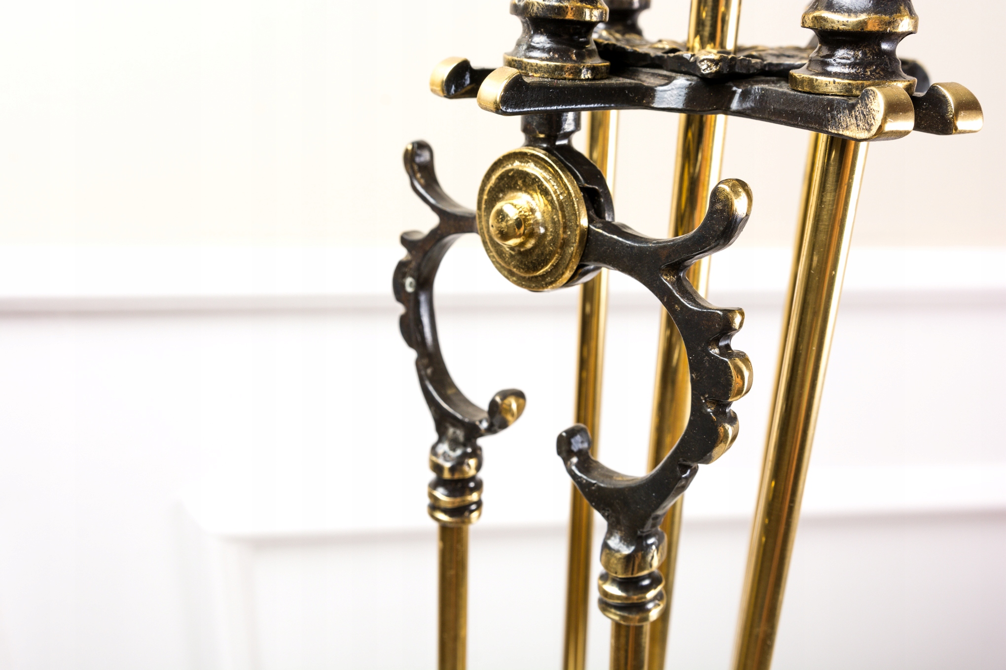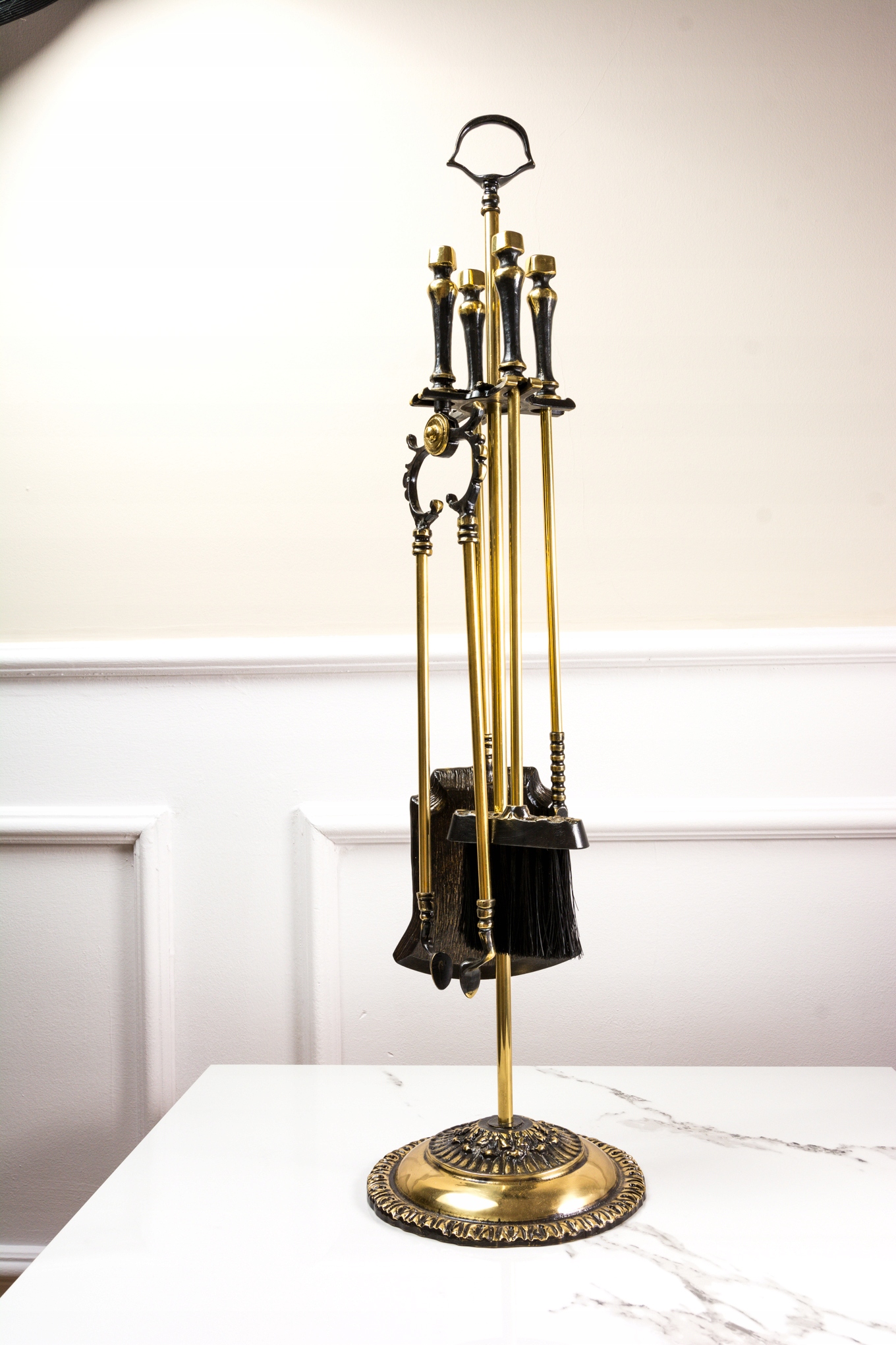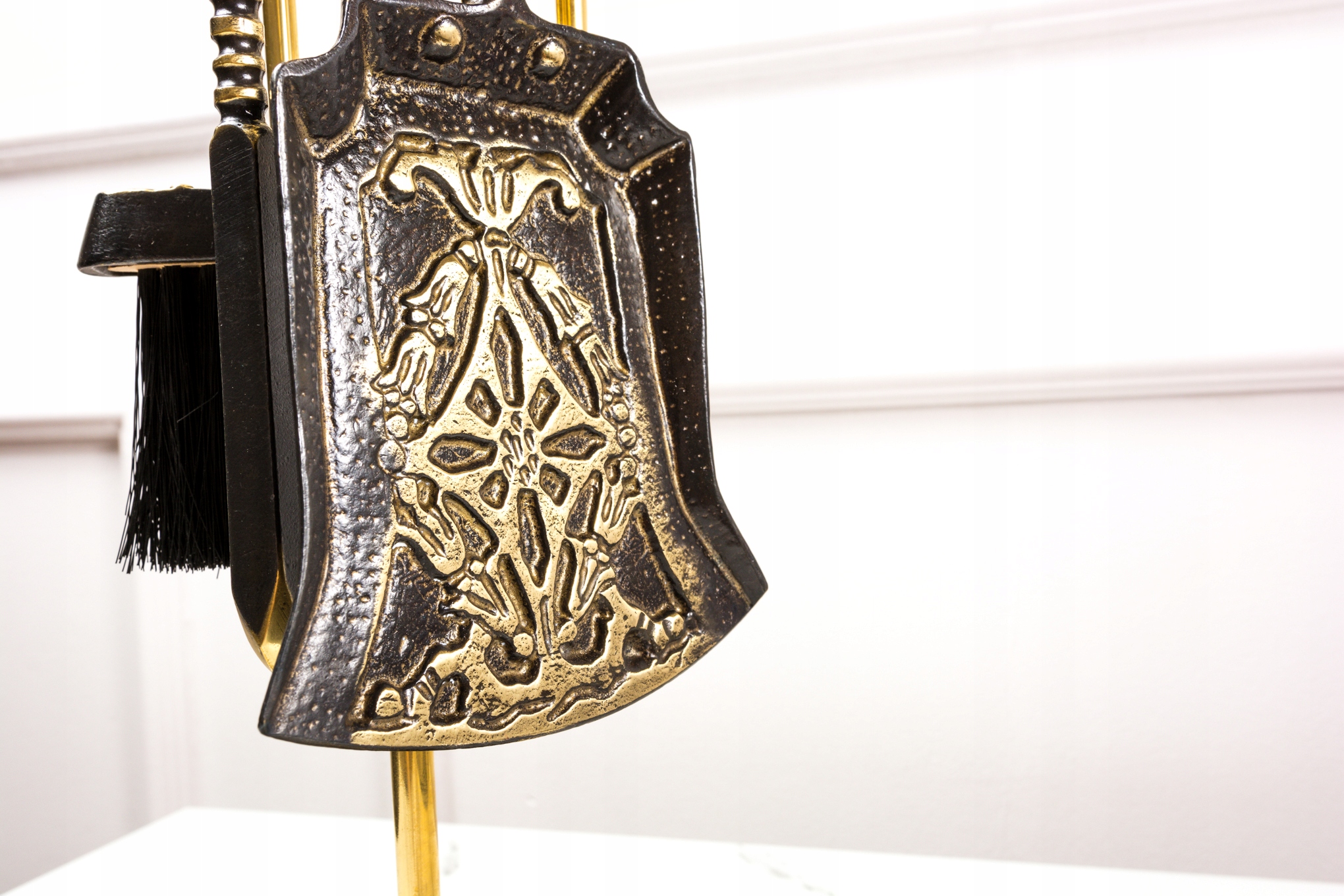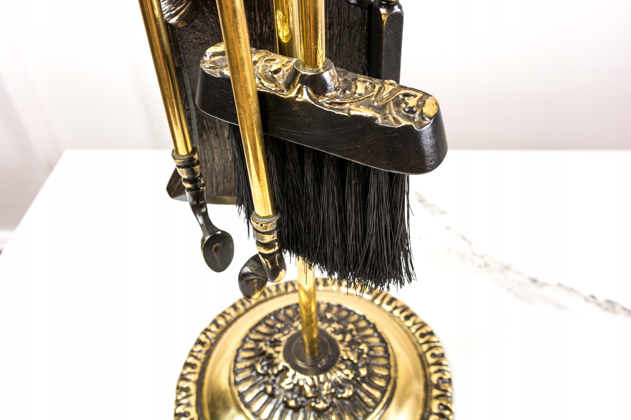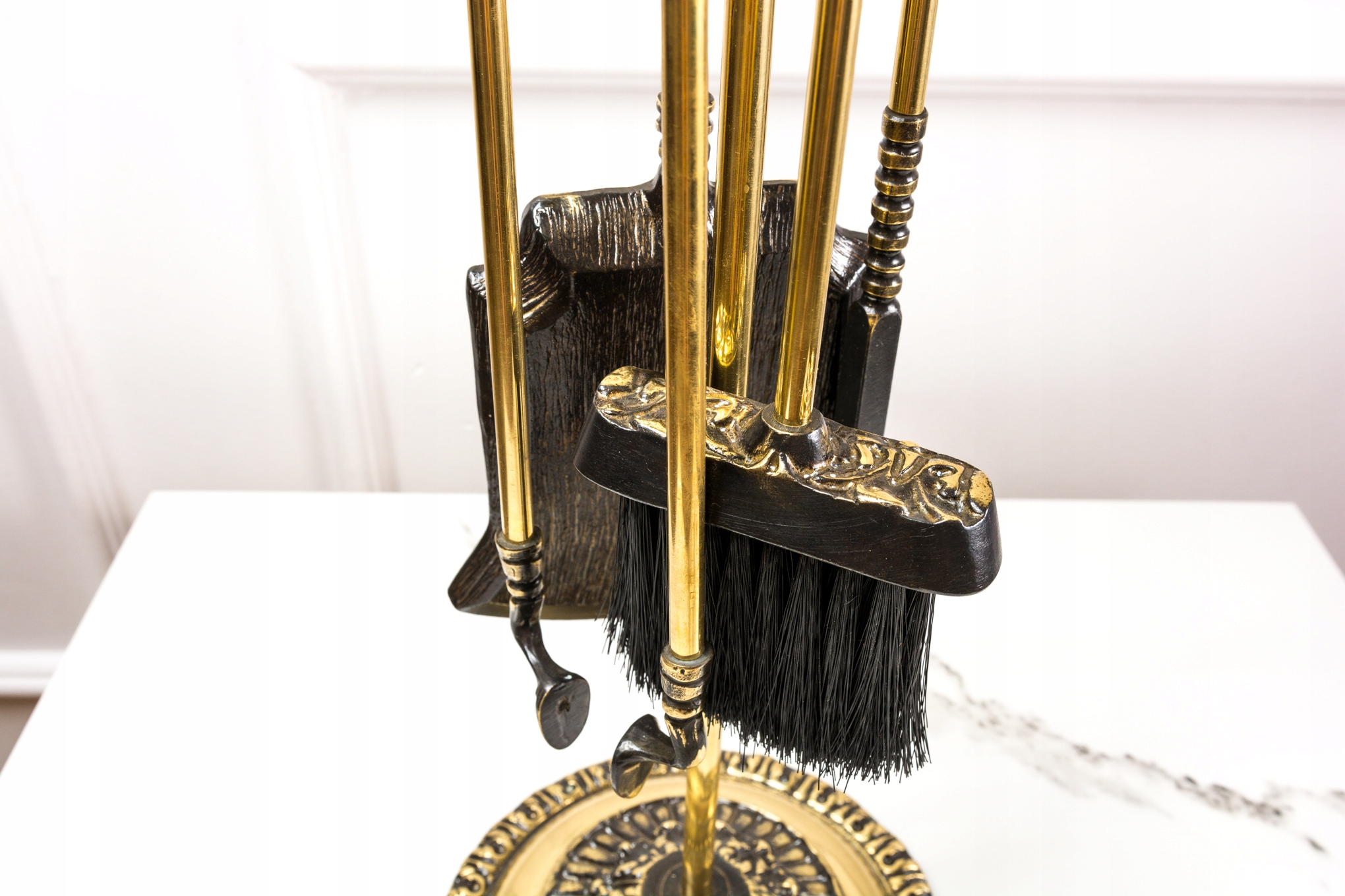 Камінний гарнітур виготовлений з латуні місцевим ливарним заводом. Весь багато оздоблений, в античному стилі, на відкритих місцях полірований, у кутах темніший. У набір входить: підставка на круглій основі, лопатка, щипці, кочерга і пензлик. Щетина щітки виготовлена з пластику, не використовувати для гарячої золи.