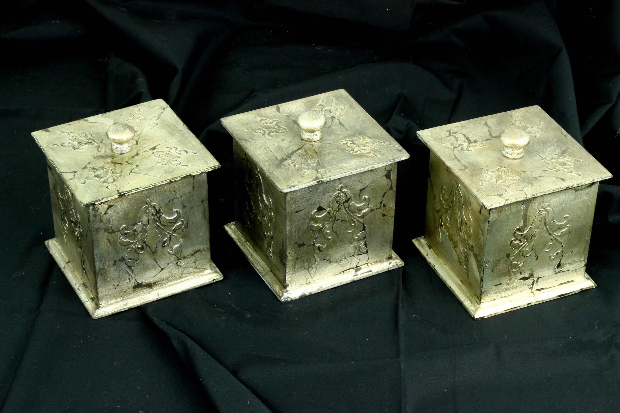 Розписані вручну носовичок і коробки з соснового дерева, прикрашені структурними паста та техніка сріблення.