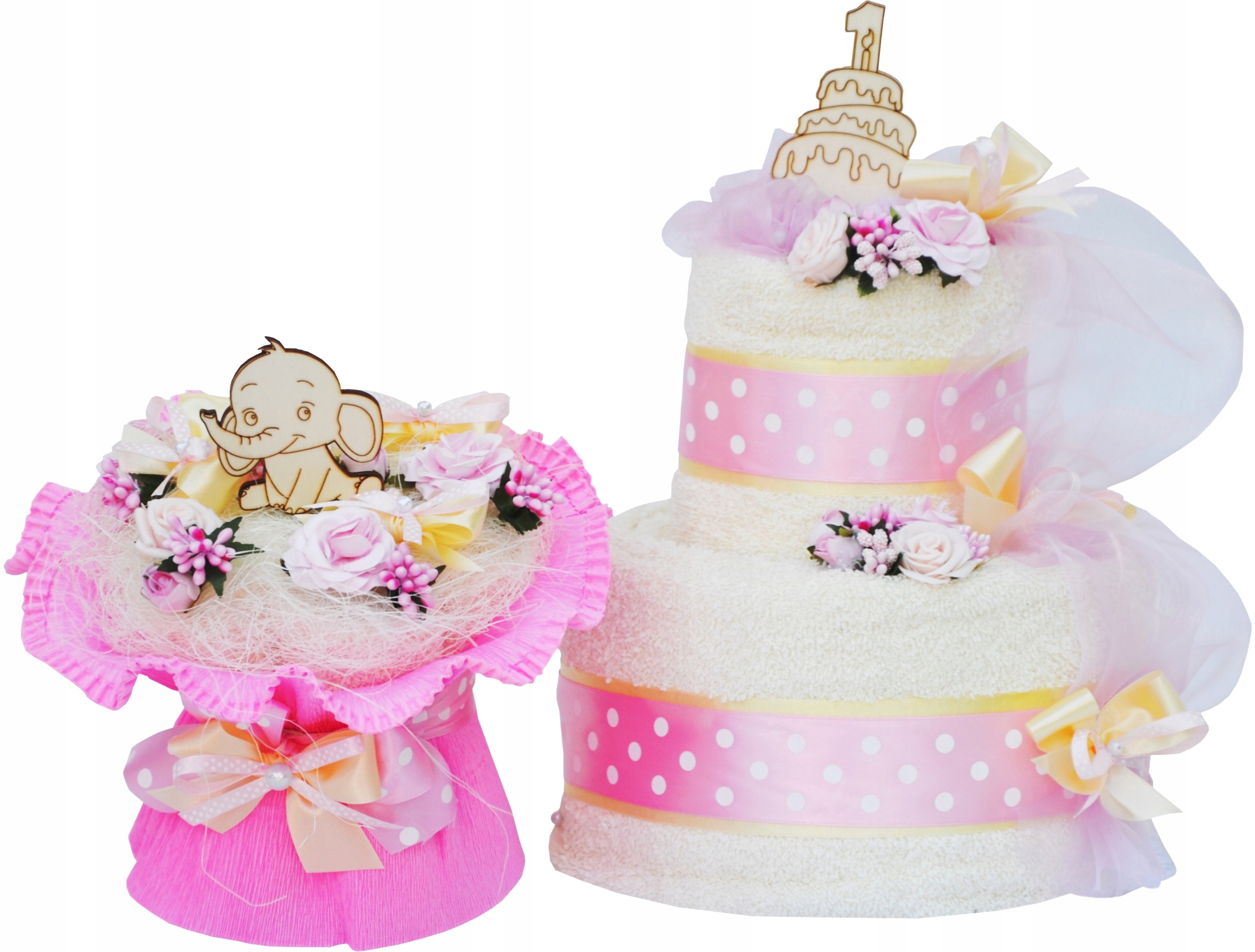 Гарний і практичний подарунок на народження дитини, хрещення, день народження - набір рушників: банні та банні рушники у формі торта з багатим кольоровим квітковим декором та три рушники для рук у формі букет.
