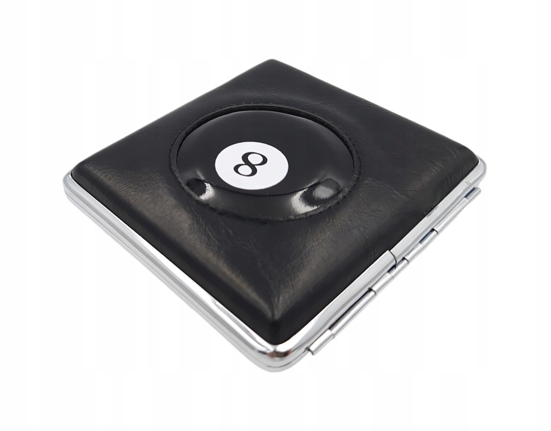 Пропозиція поширюється на портсигар, який видно на фото. Портсигар вміщує 20 сигарет. Він обтягнутий шкіряним матеріалом з пластиковою імітацією спереду, що нагадує більярдну кулю. Він має гумки, які утримують сигарети на місці та не дозволяють їм розлітатися під час носіння портсигара. Ідеально підходить для подарунка. Розміри портсигара 10х9,5х2,3 см.