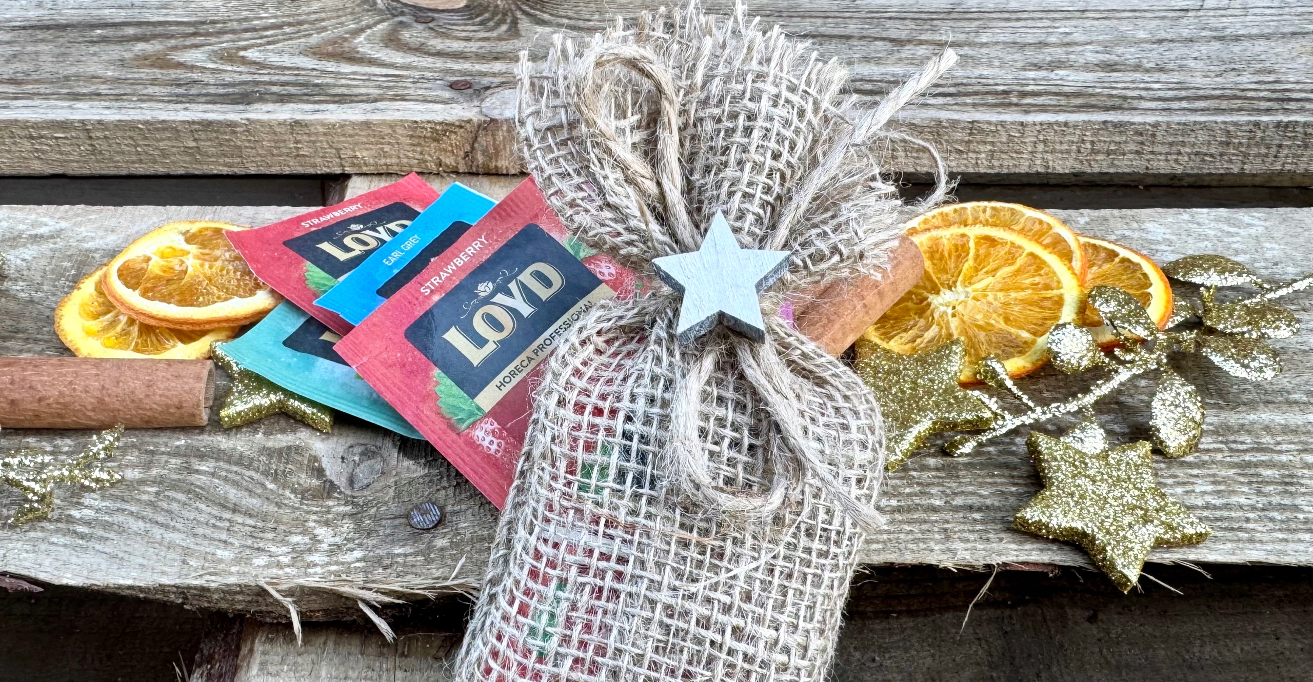 - 5 смачних чаїв із різними смаками, святково упакованих у натуральний джут,