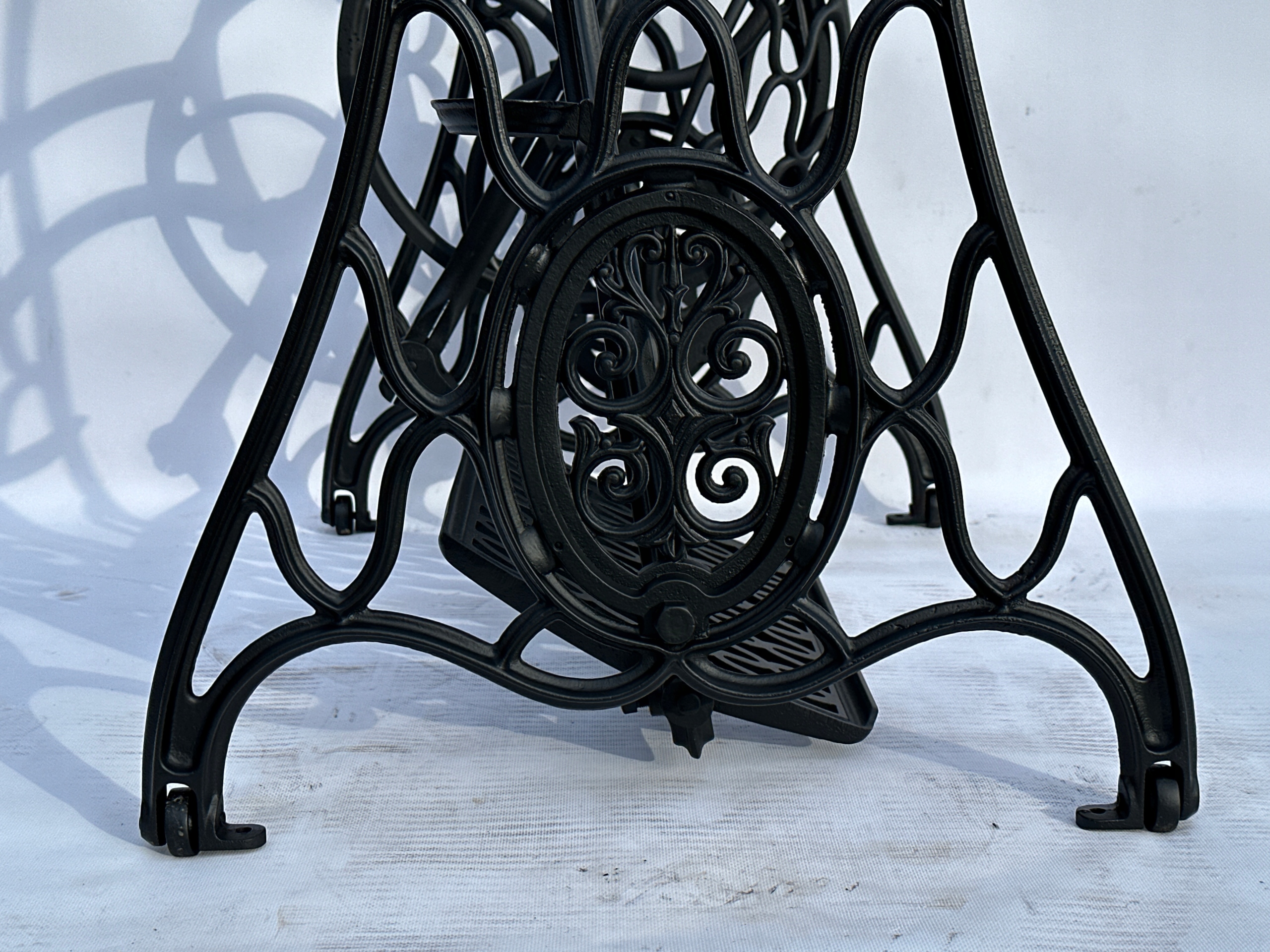 Предмет продажу стара чавунна швейна машина. Дуже гарний, широкий дизайн - буде багато місця для ніг. Декорації з боків. Він має всі 4 колеса внизу.