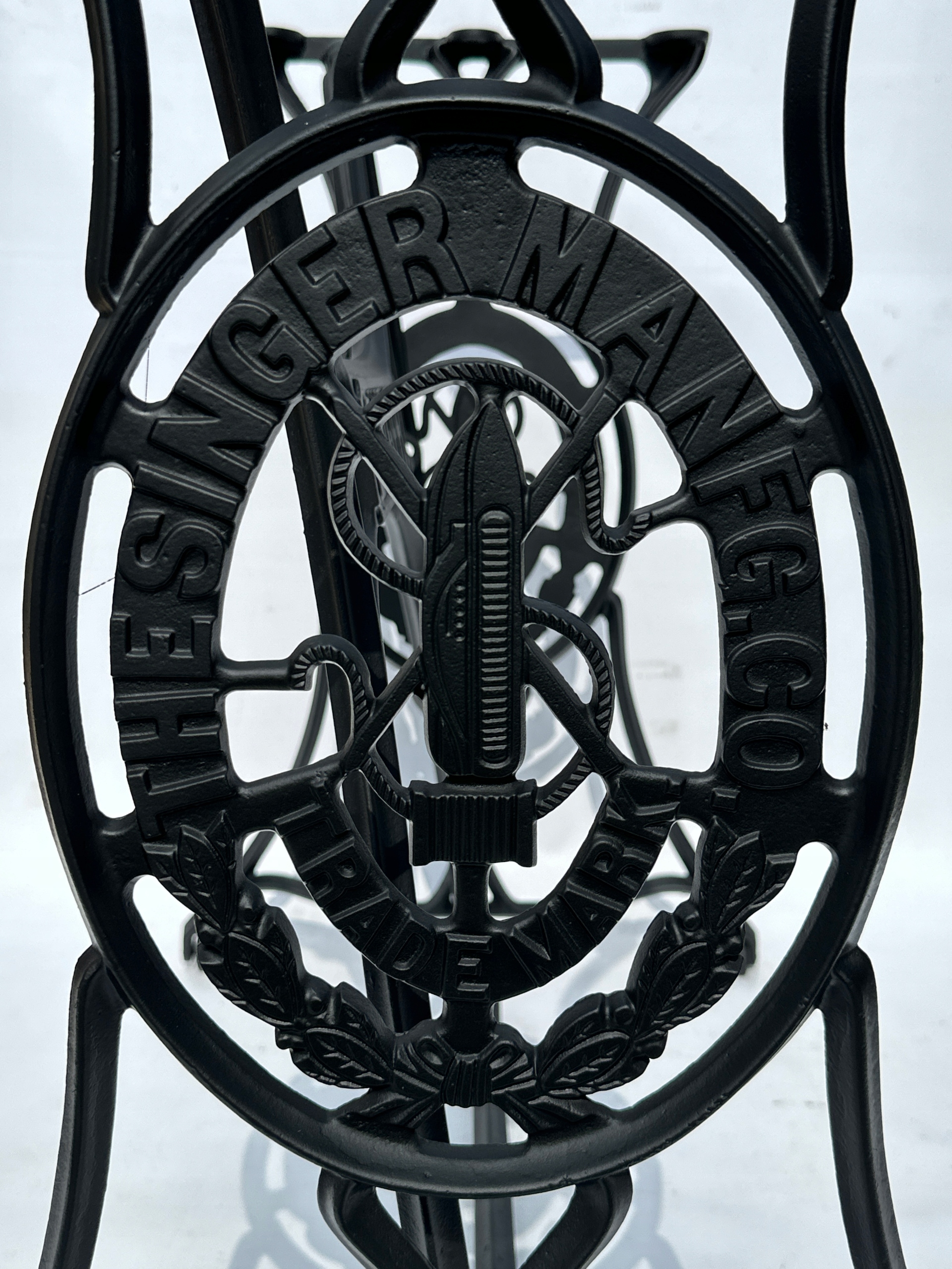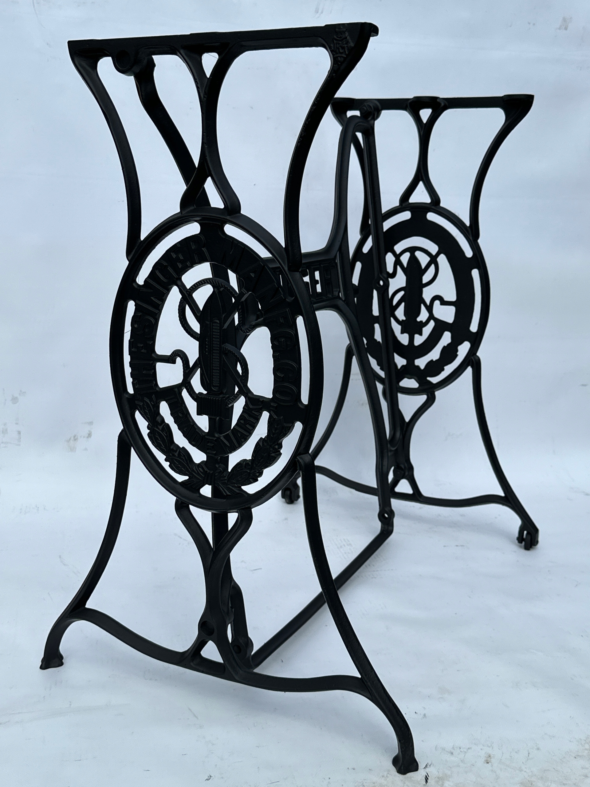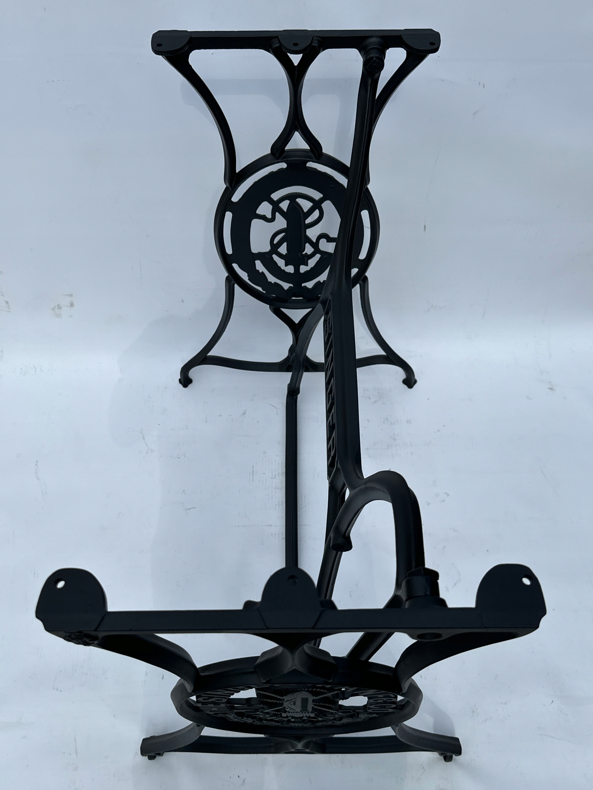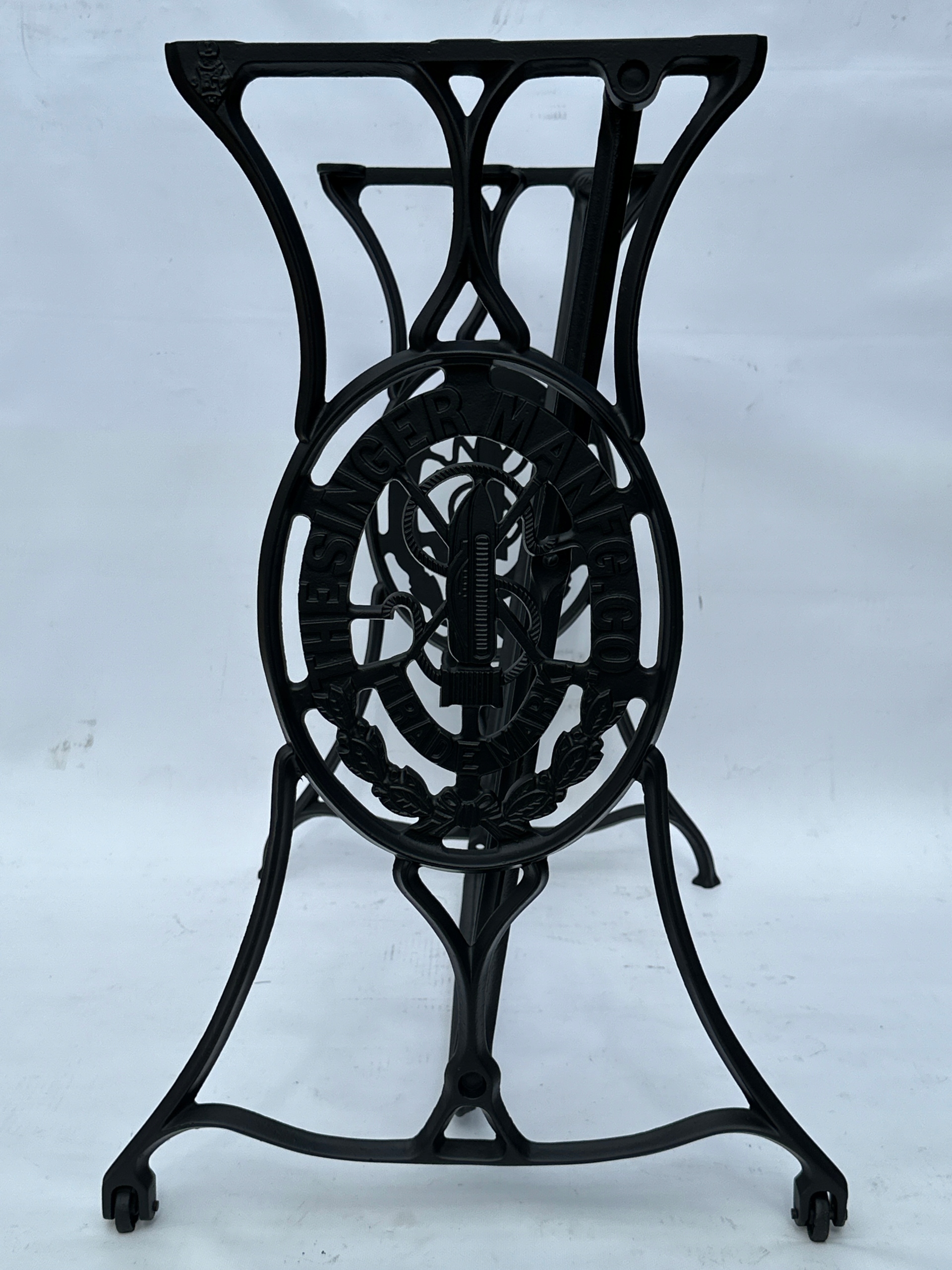 Предмет продажу стара чавунна основа від швейної машинки SINGER. Дуже гарна широка модель - багато місця для ніг. Посередині напис з логотипом компанії. З боків написи THE SINGER MANFG. ЩО. ТОРГОВА МАРКА. Має обидва колеса в нижній частині