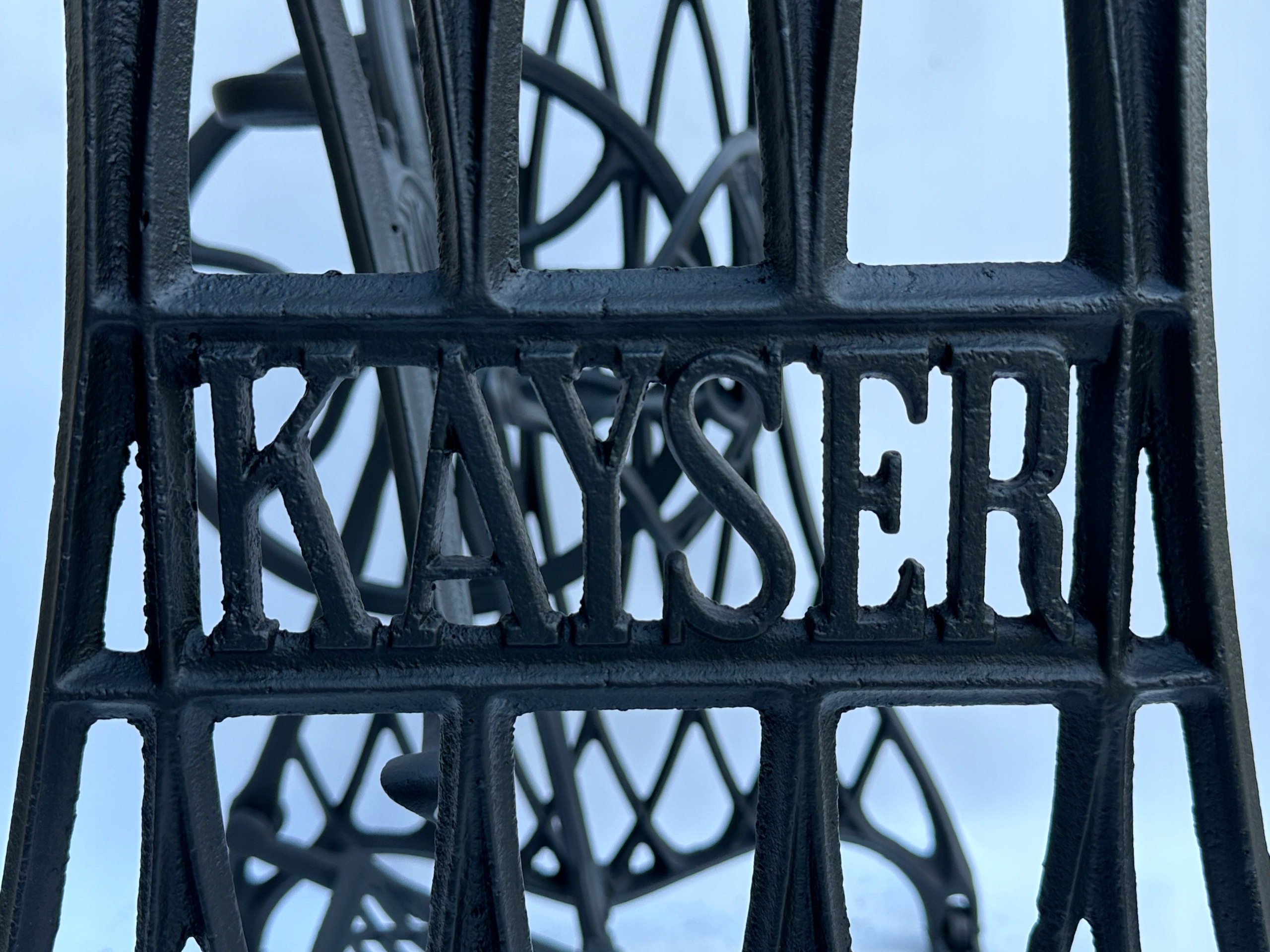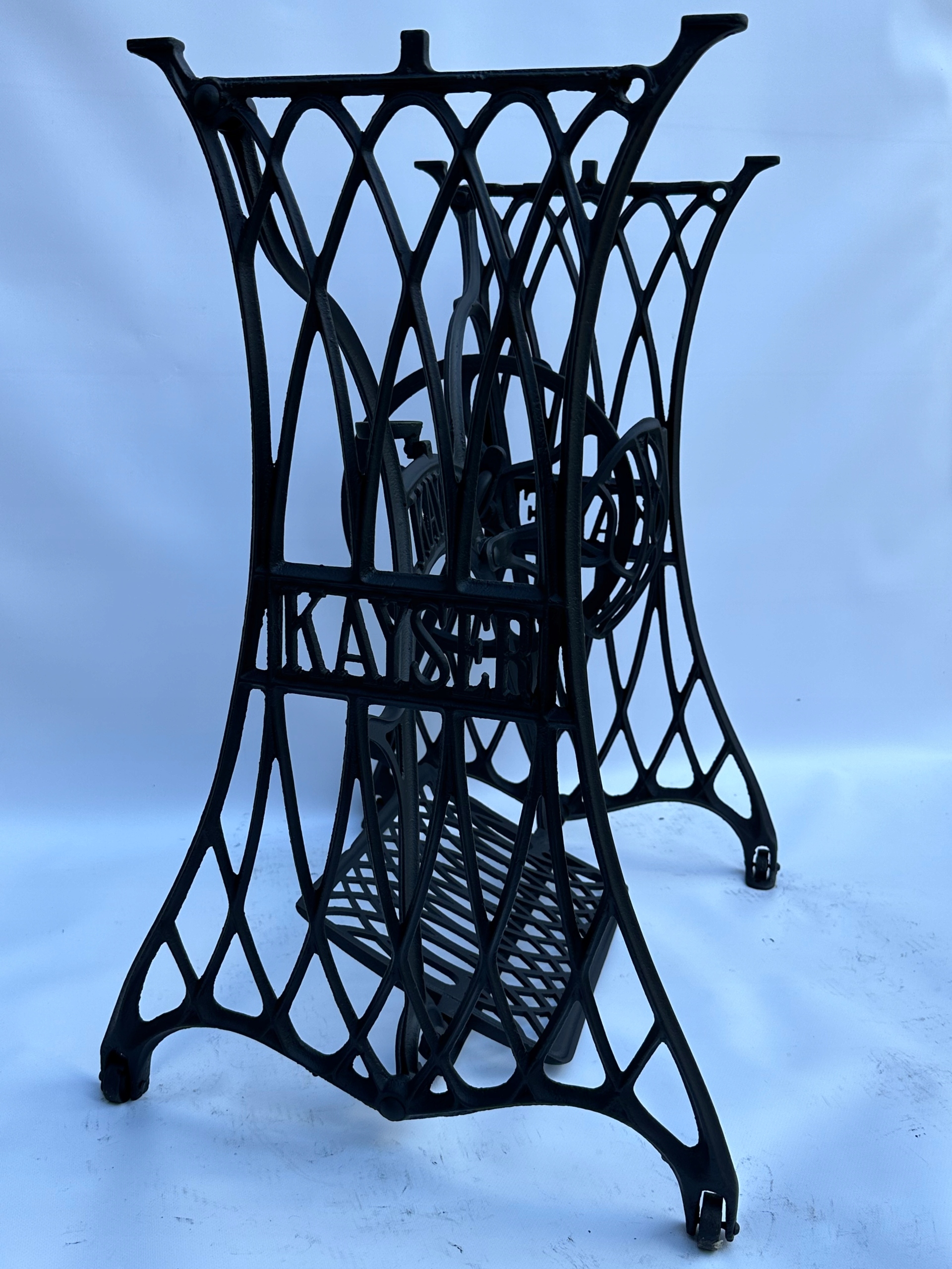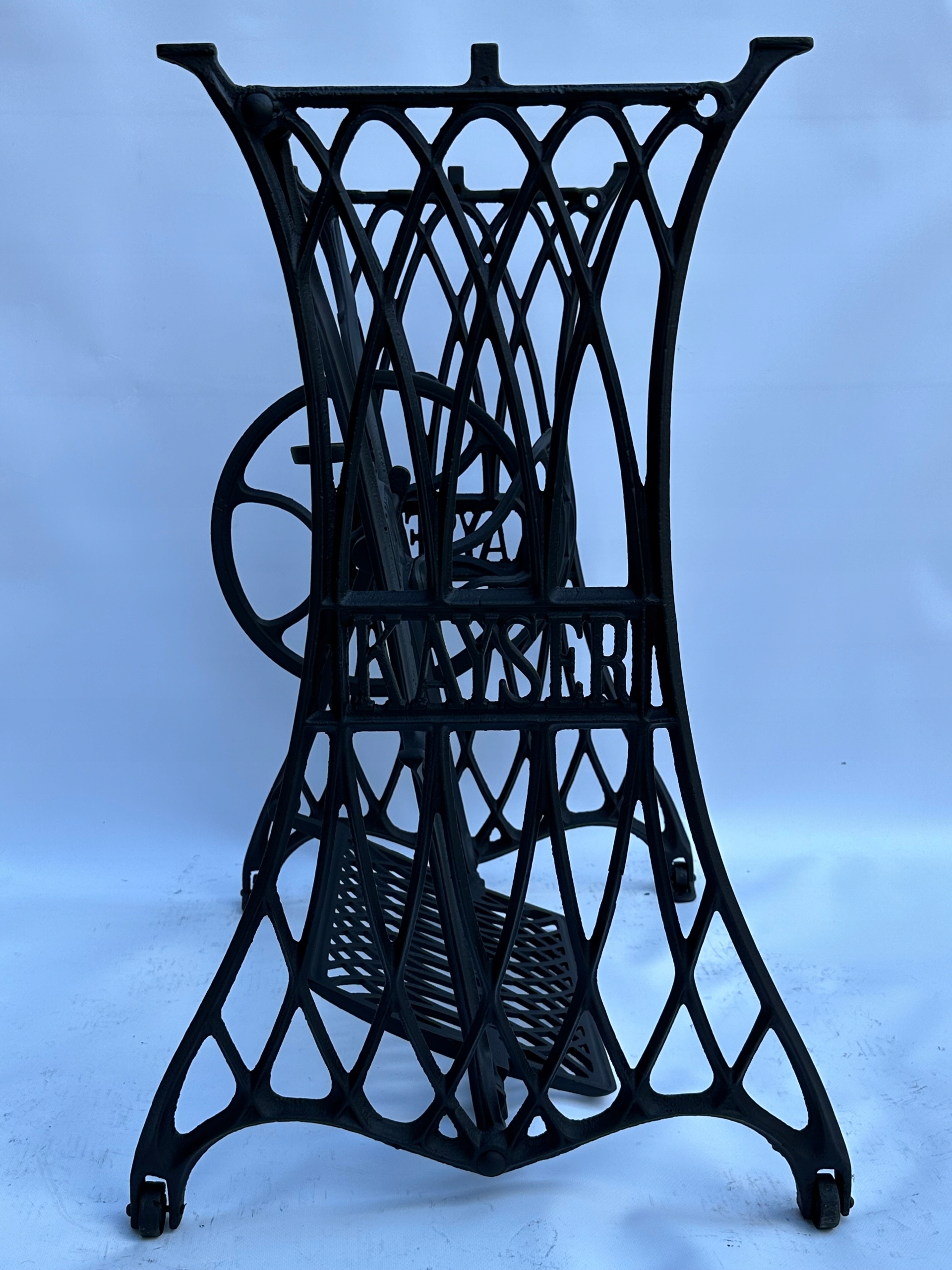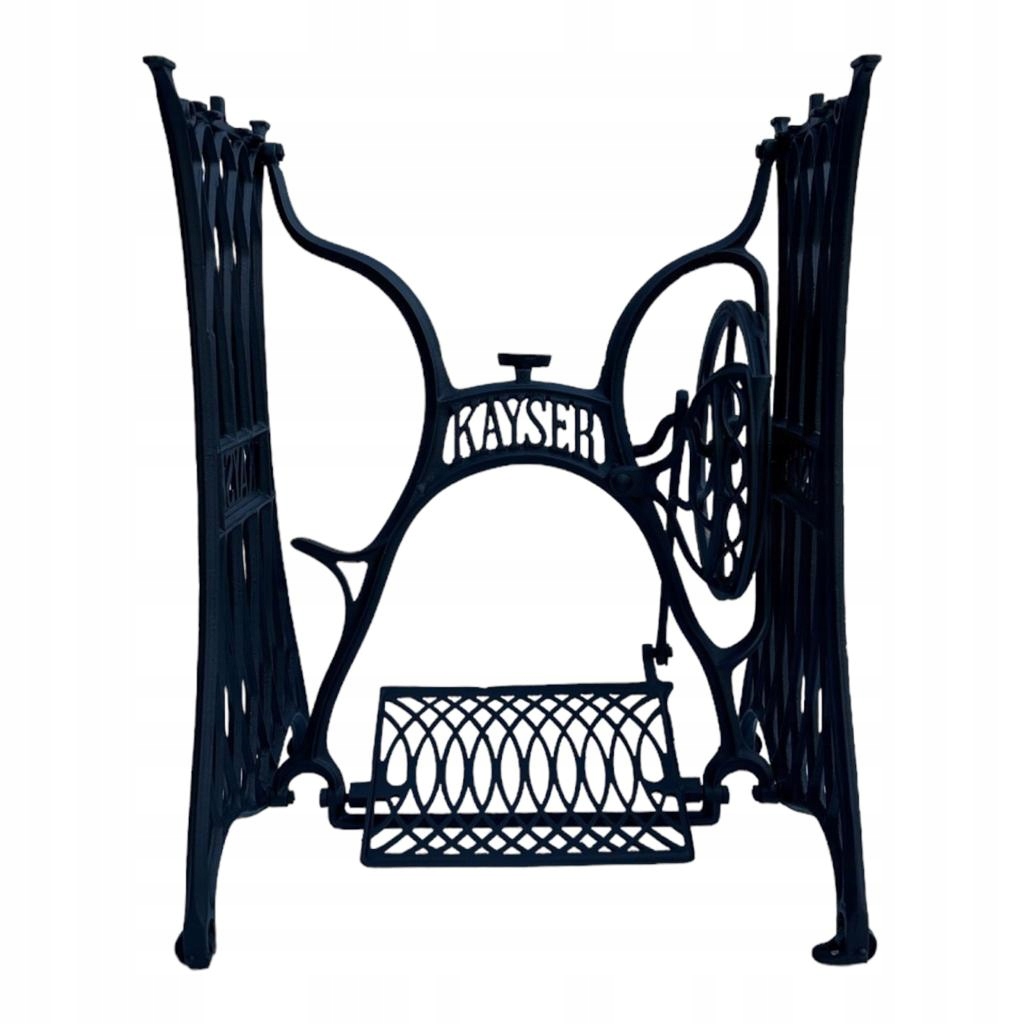 Предмет продажу стара чавунна основа від швейної машинки KAYSER. Дуже гарний візерунок, менш поширений. З боків і посередині є написи з логотипом компанії. Він має всі 4 колеса в нижній частині основи.
