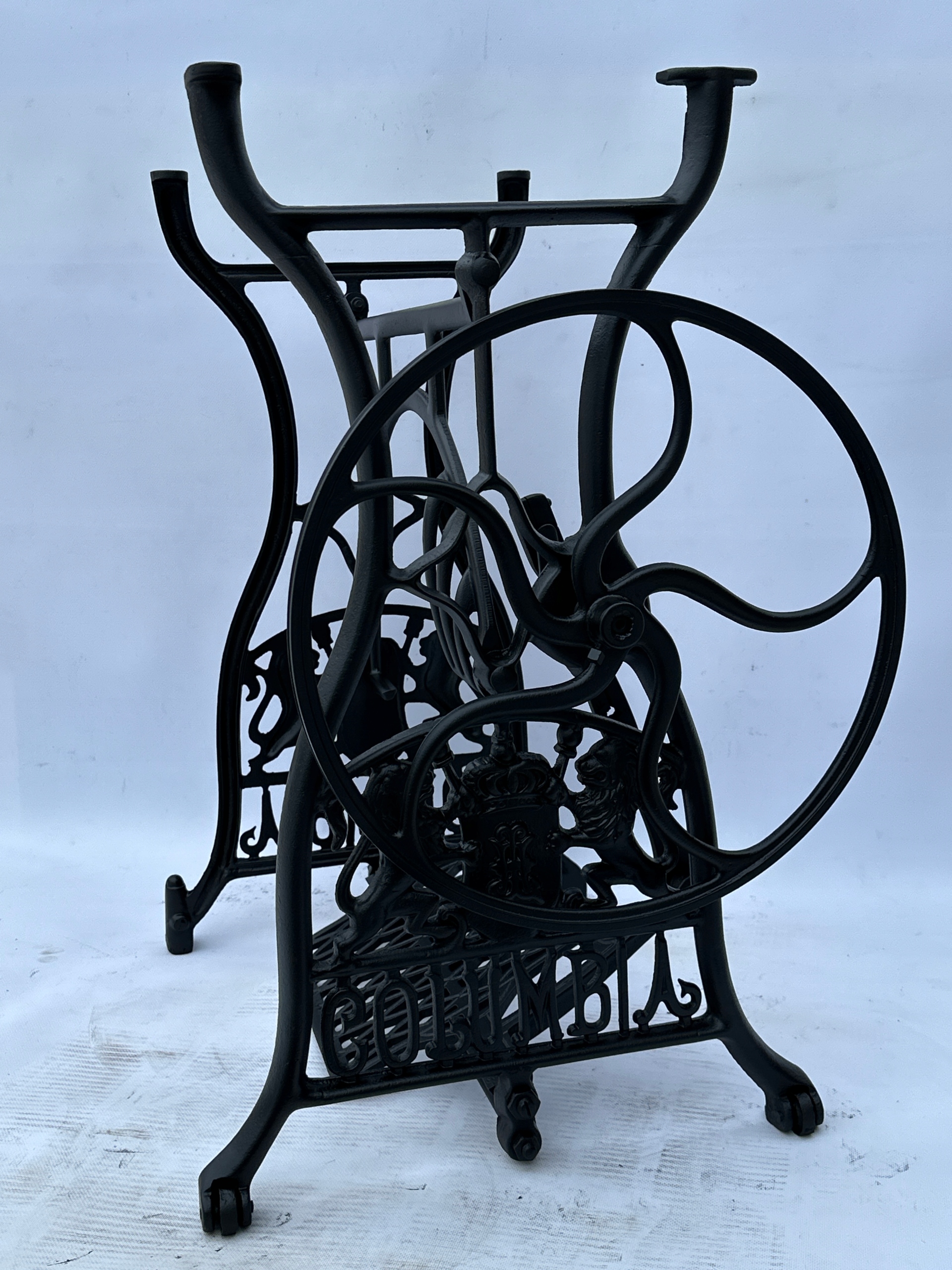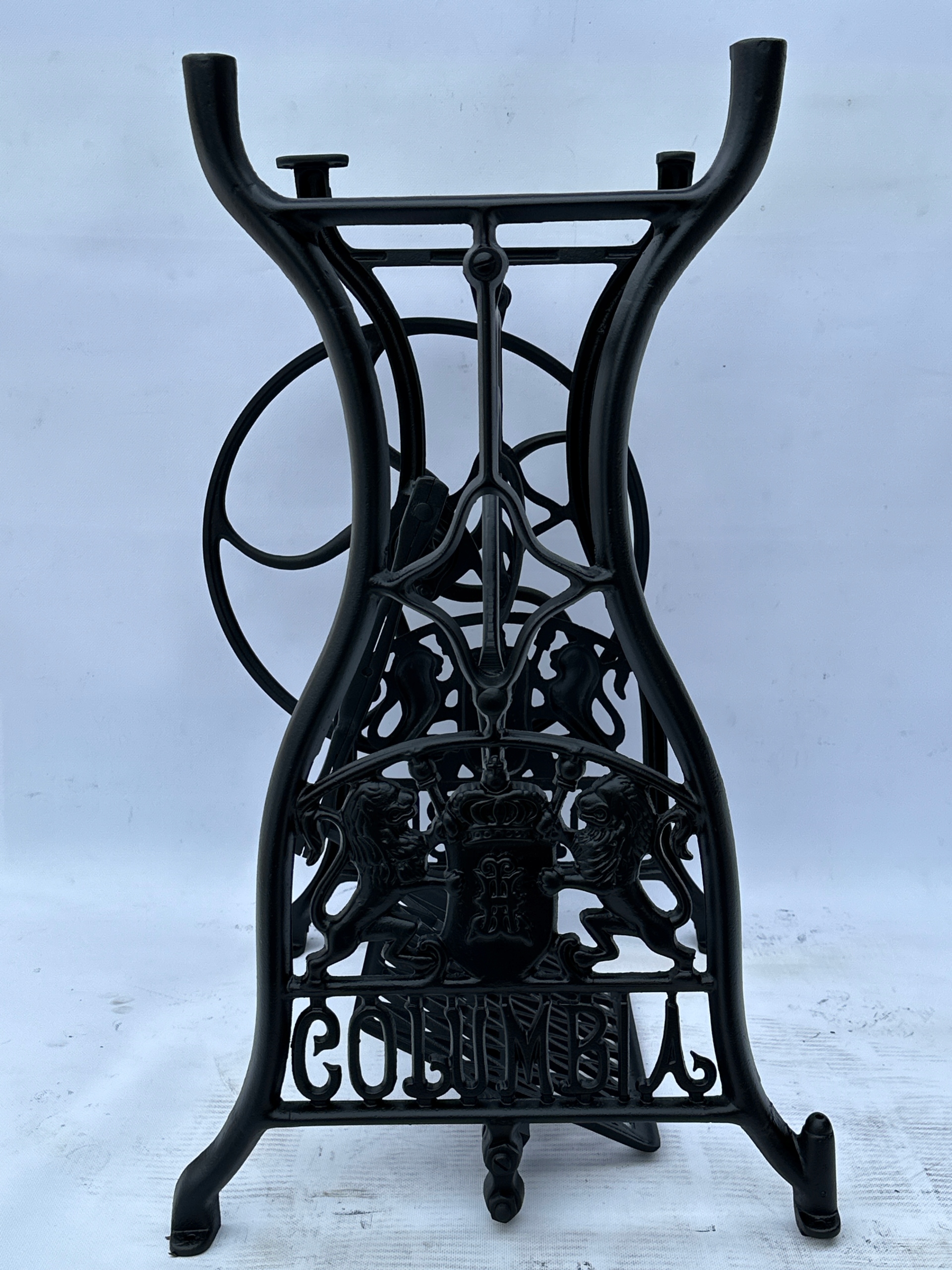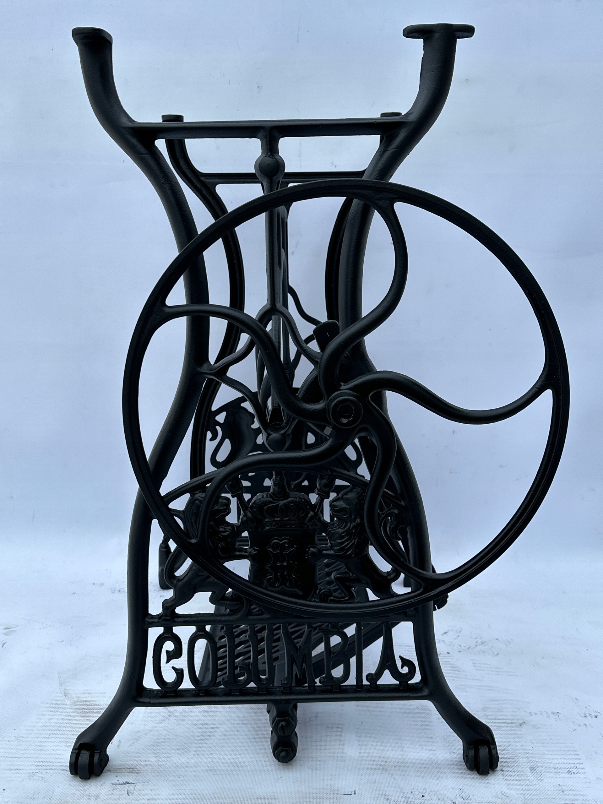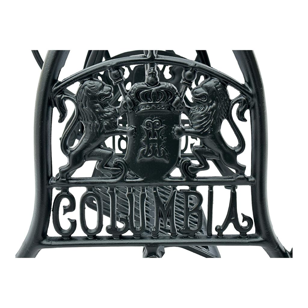 Предмет продажу стара чавунна основа до швейної машинки COLUMBIA. Дуже гарний візерунок з красивими левами, зустрічається рідше. З боків написи з логотипом компанії. Він має обидва колеса внизу. Все важче знайти основу для таких багатих декорацій.