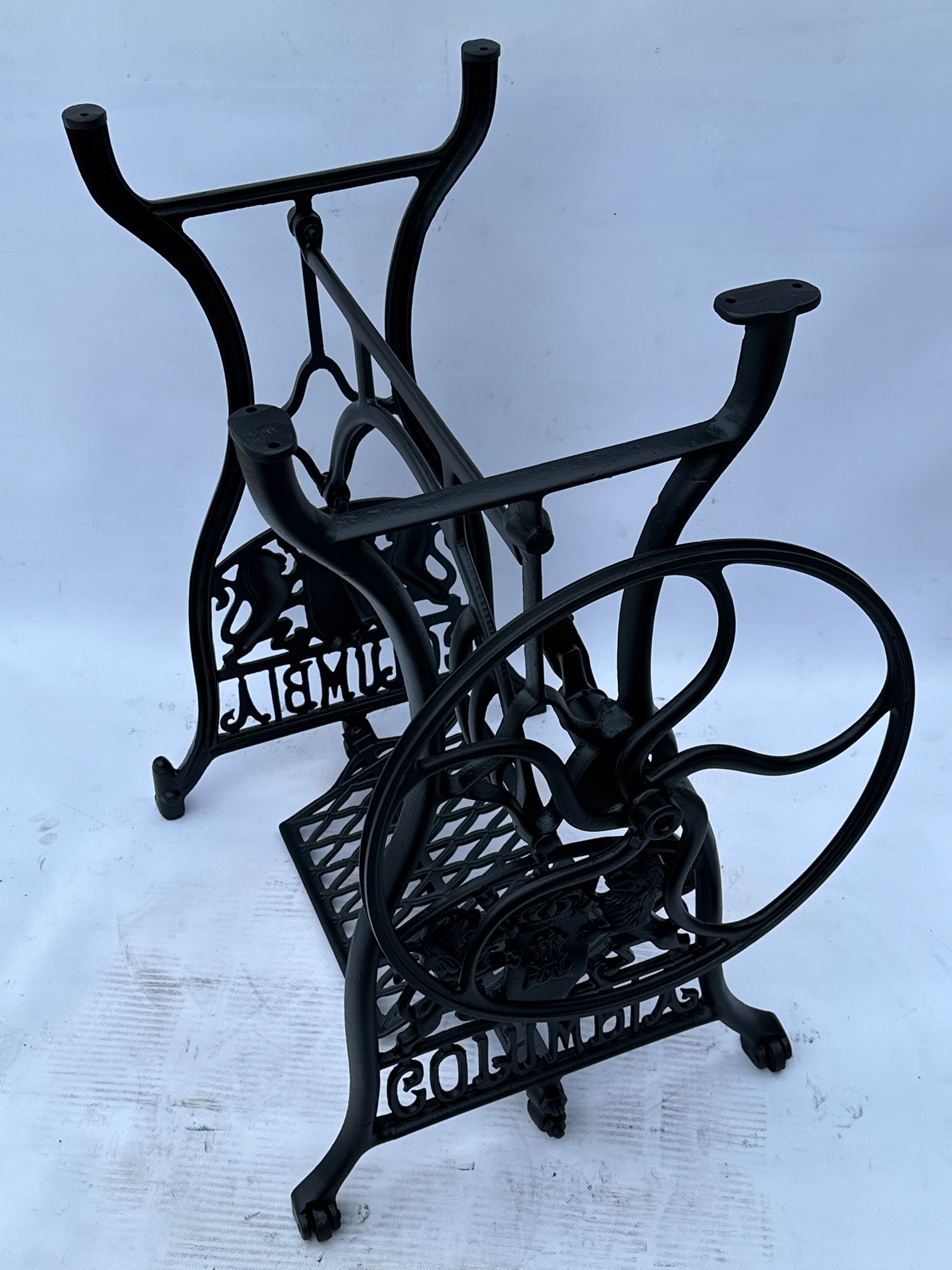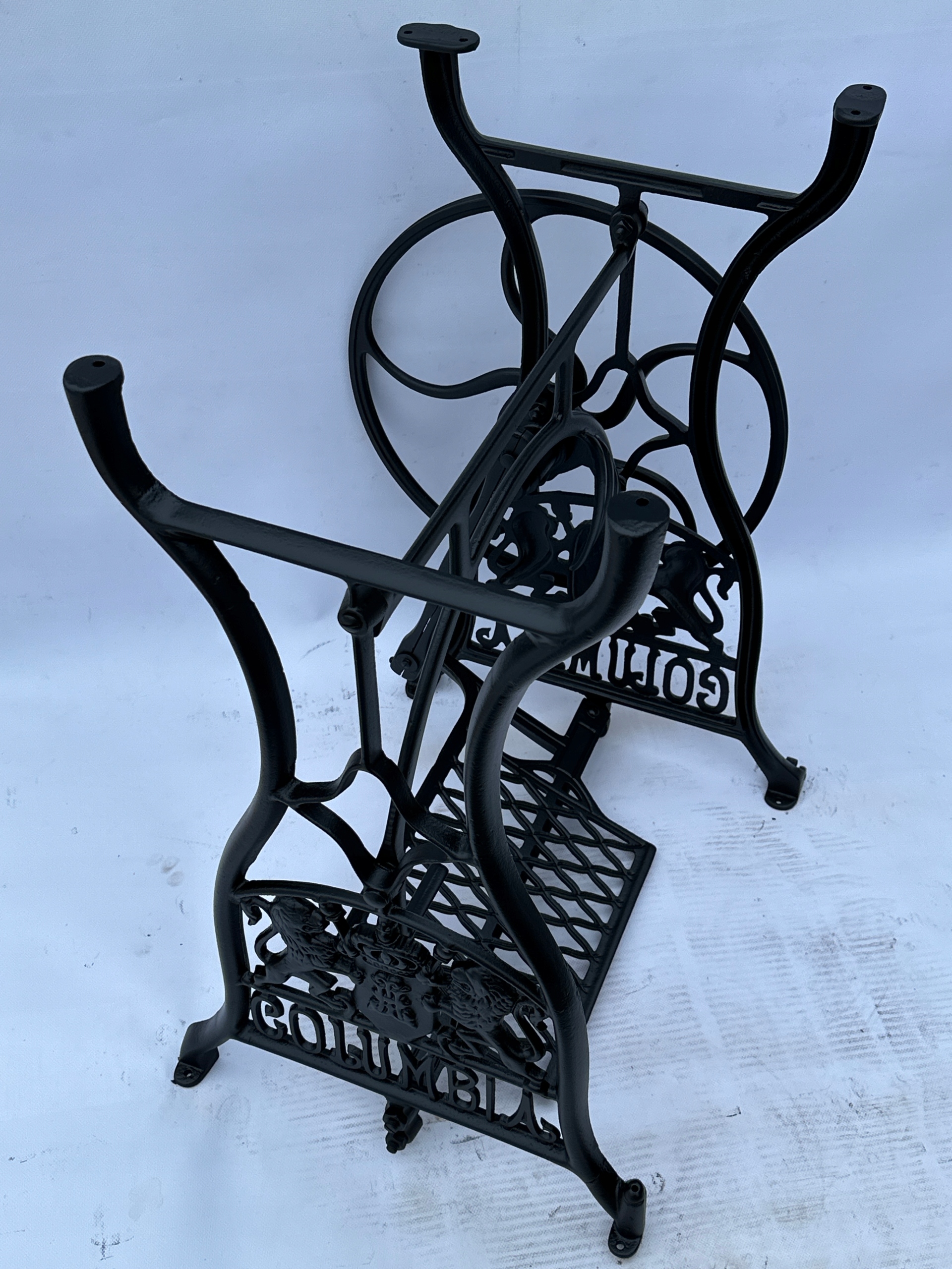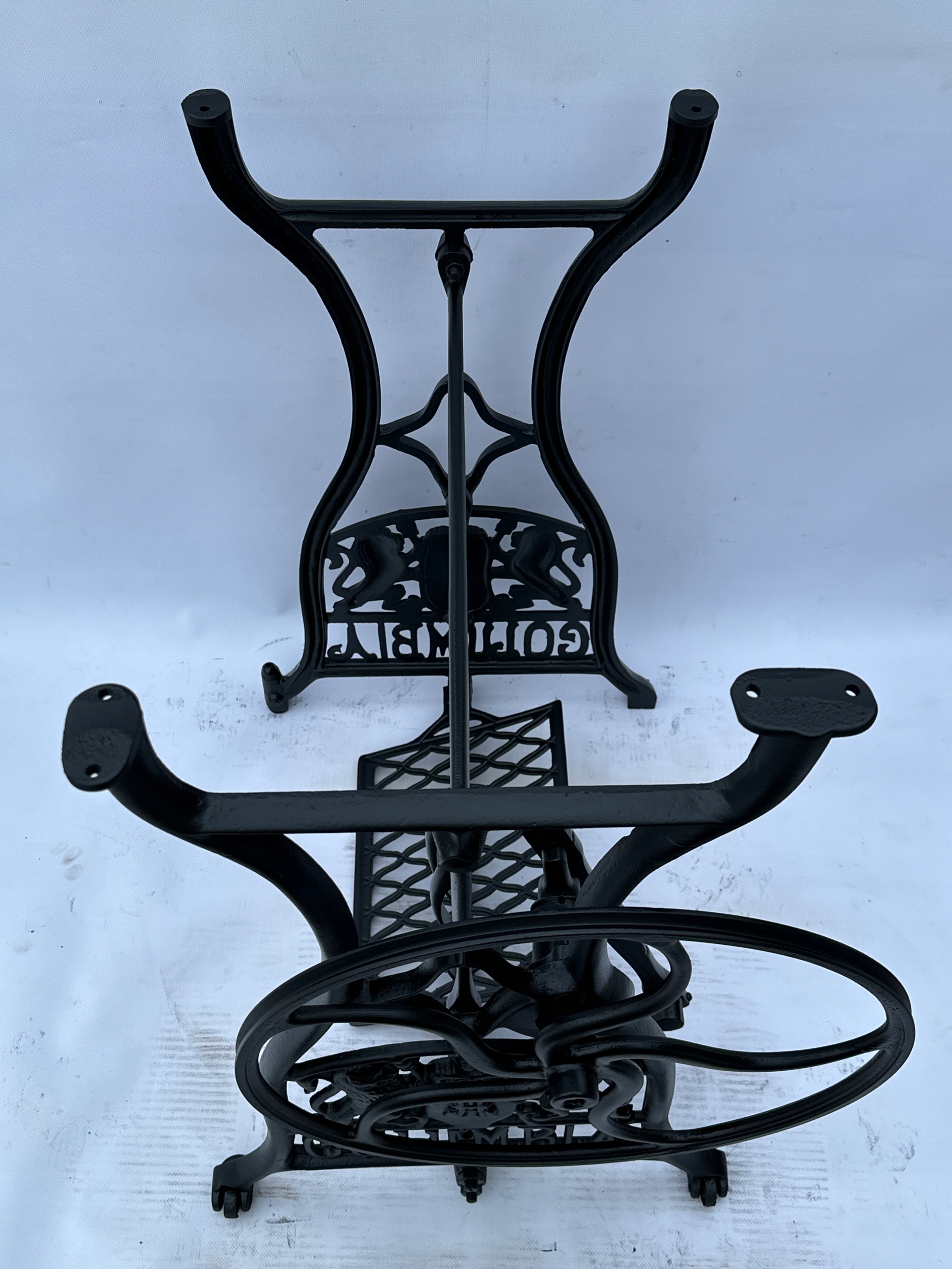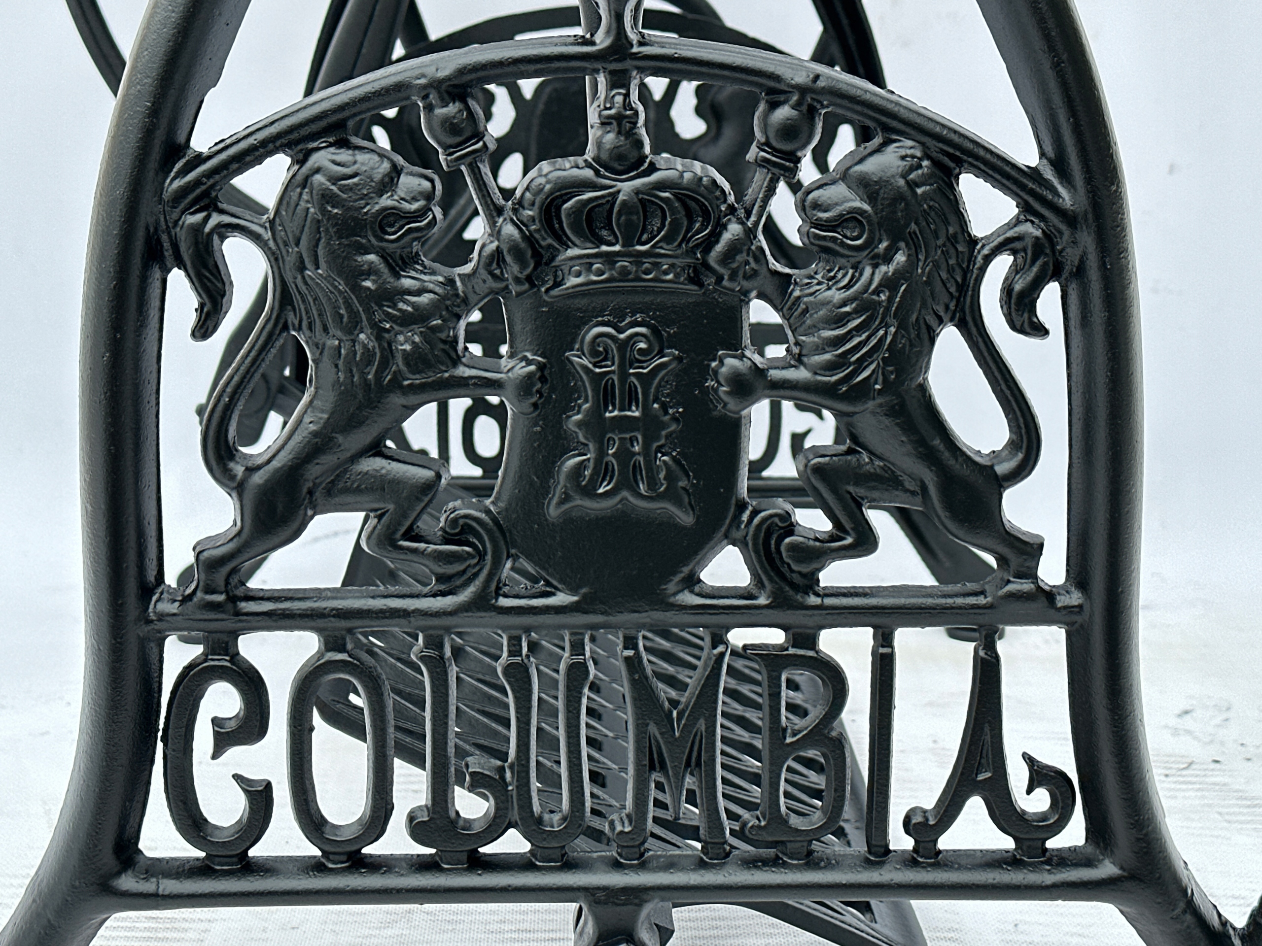 Предмет продажу стара чавунна основа до швейної машинки COLUMBIA. Дуже гарний візерунок з красивими левами, зустрічається рідше. З боків написи з логотипом компанії. Він має обидва колеса внизу. Все важче знайти основу для таких багатих декорацій.
