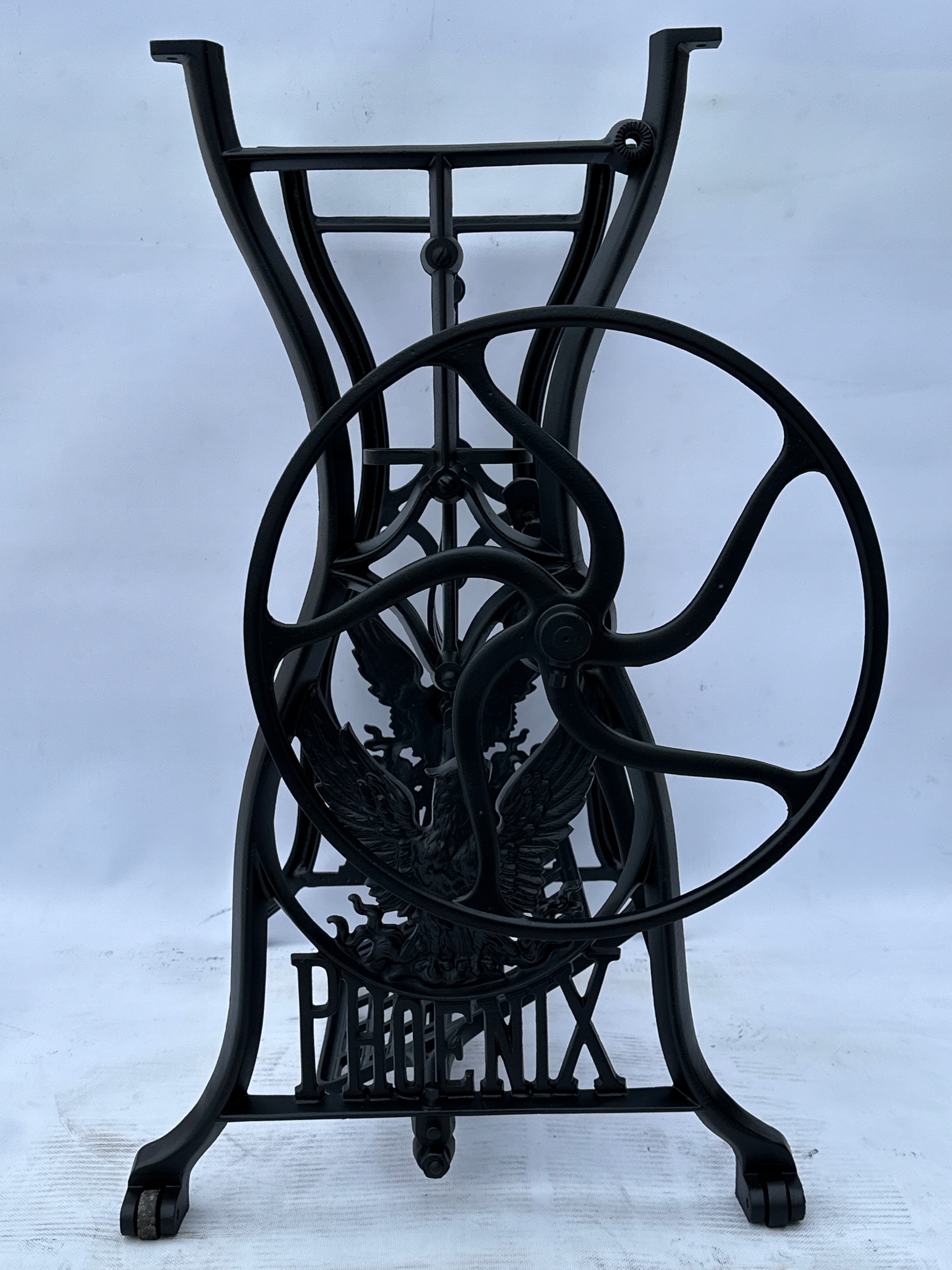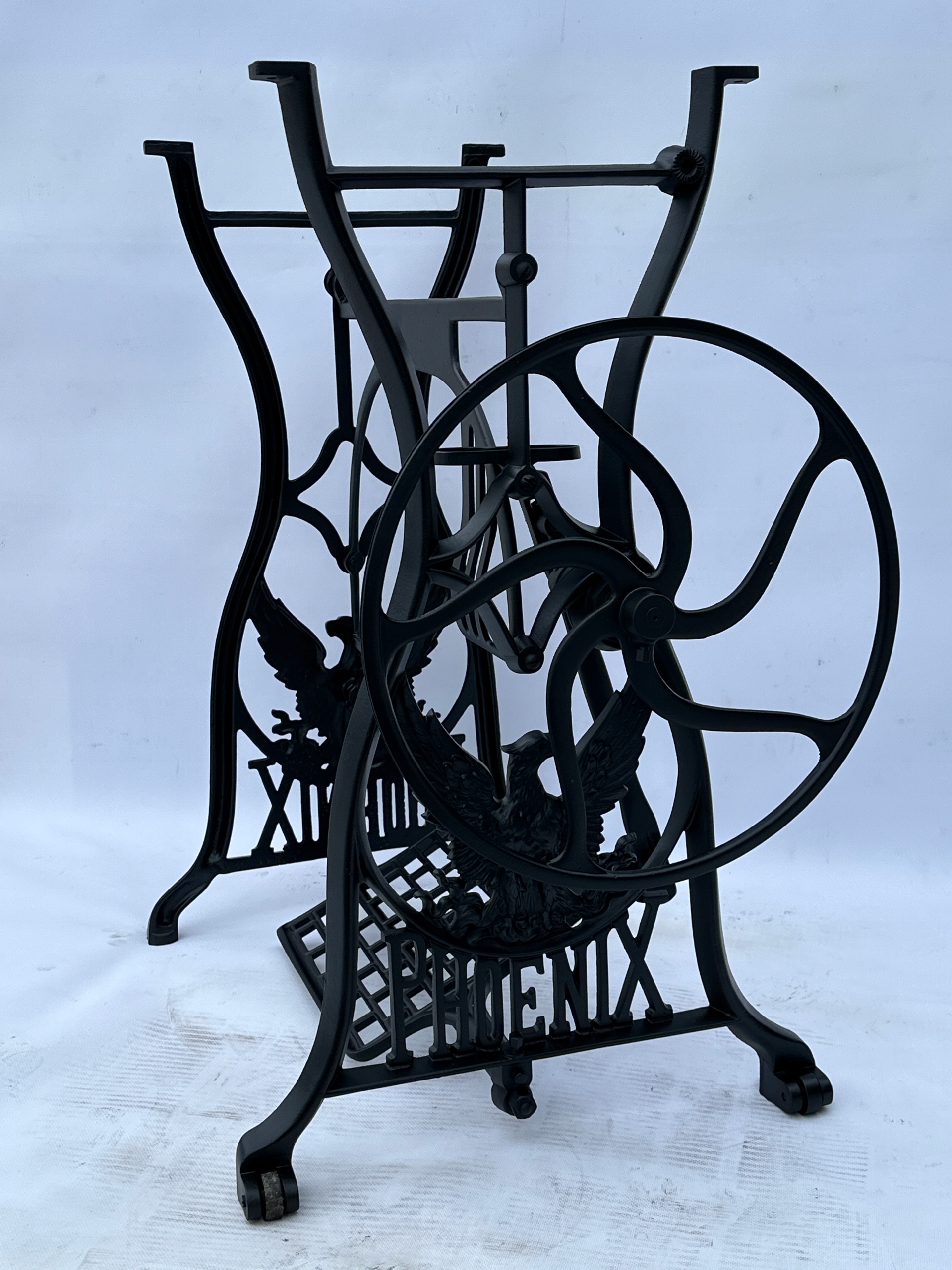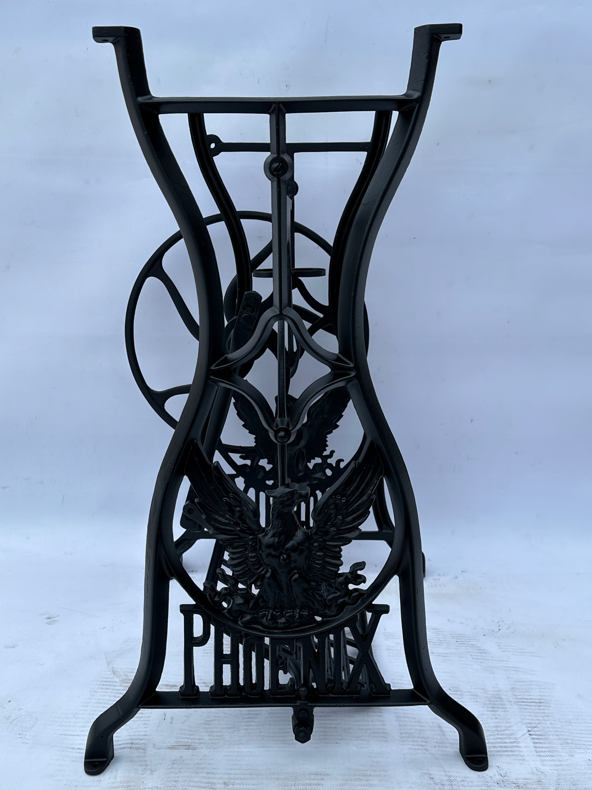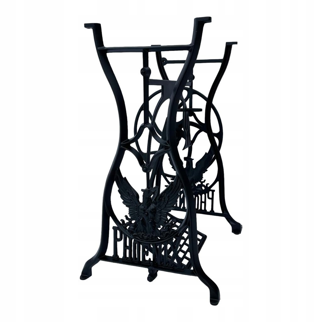 Предмет продажу стара чавунна основа від швейної машинки ФЕНІКС. Дуже гарний візерунок з красивими орлами, зустрічається рідше. З боків написи з логотипом компанії. Він має обидва колеса внизу. Все важче знайти основу в таких багатих декораціях.