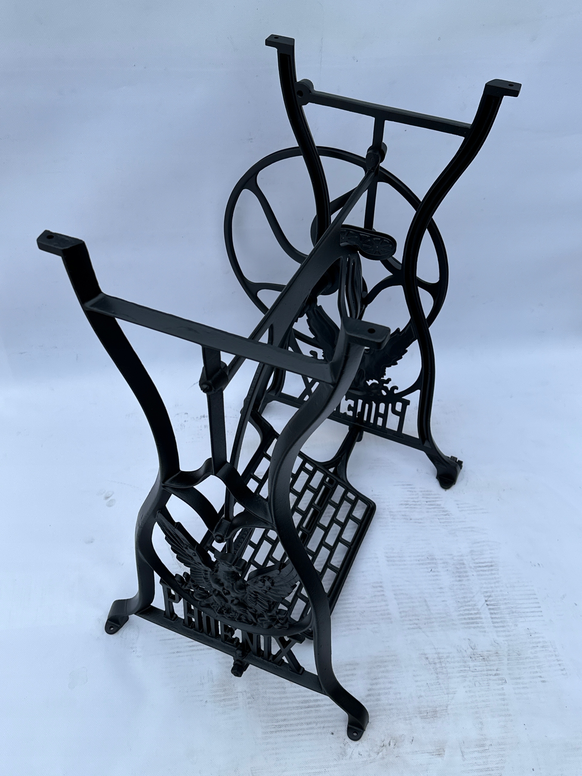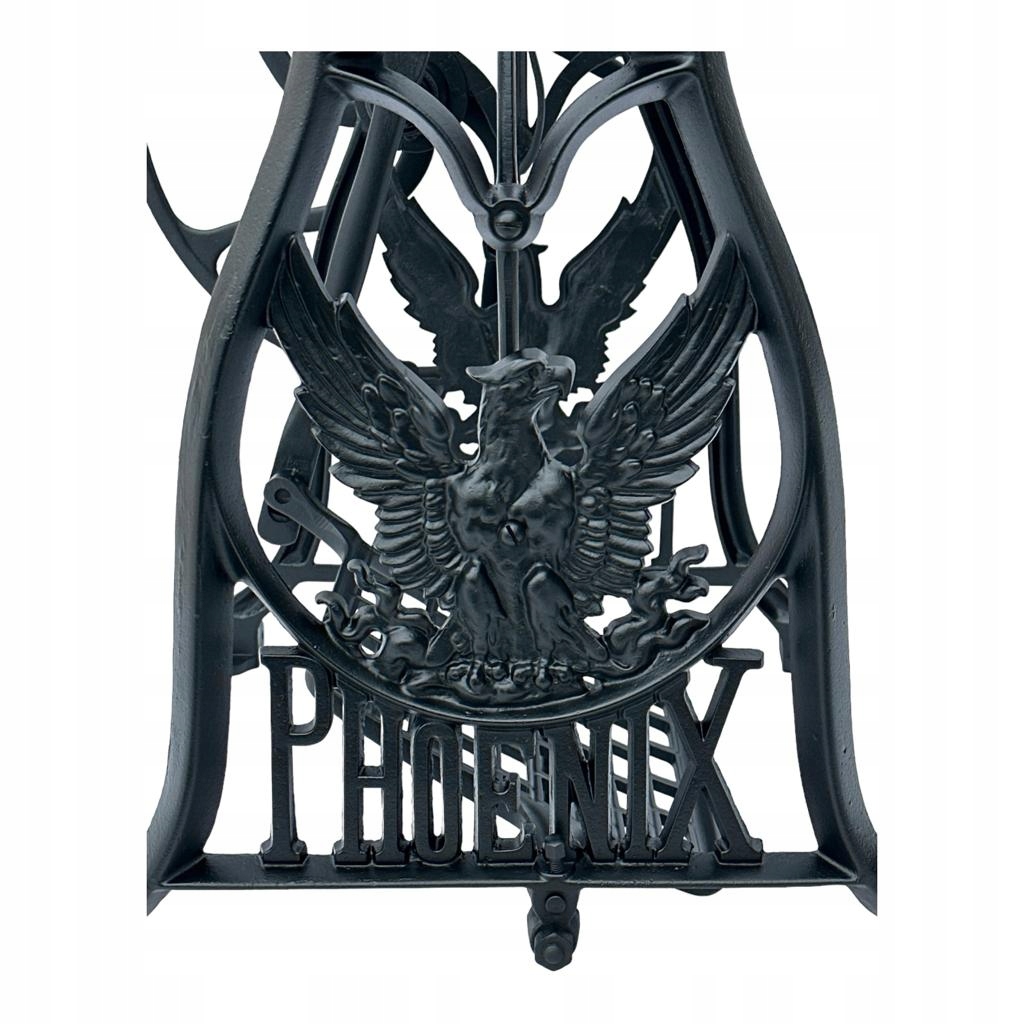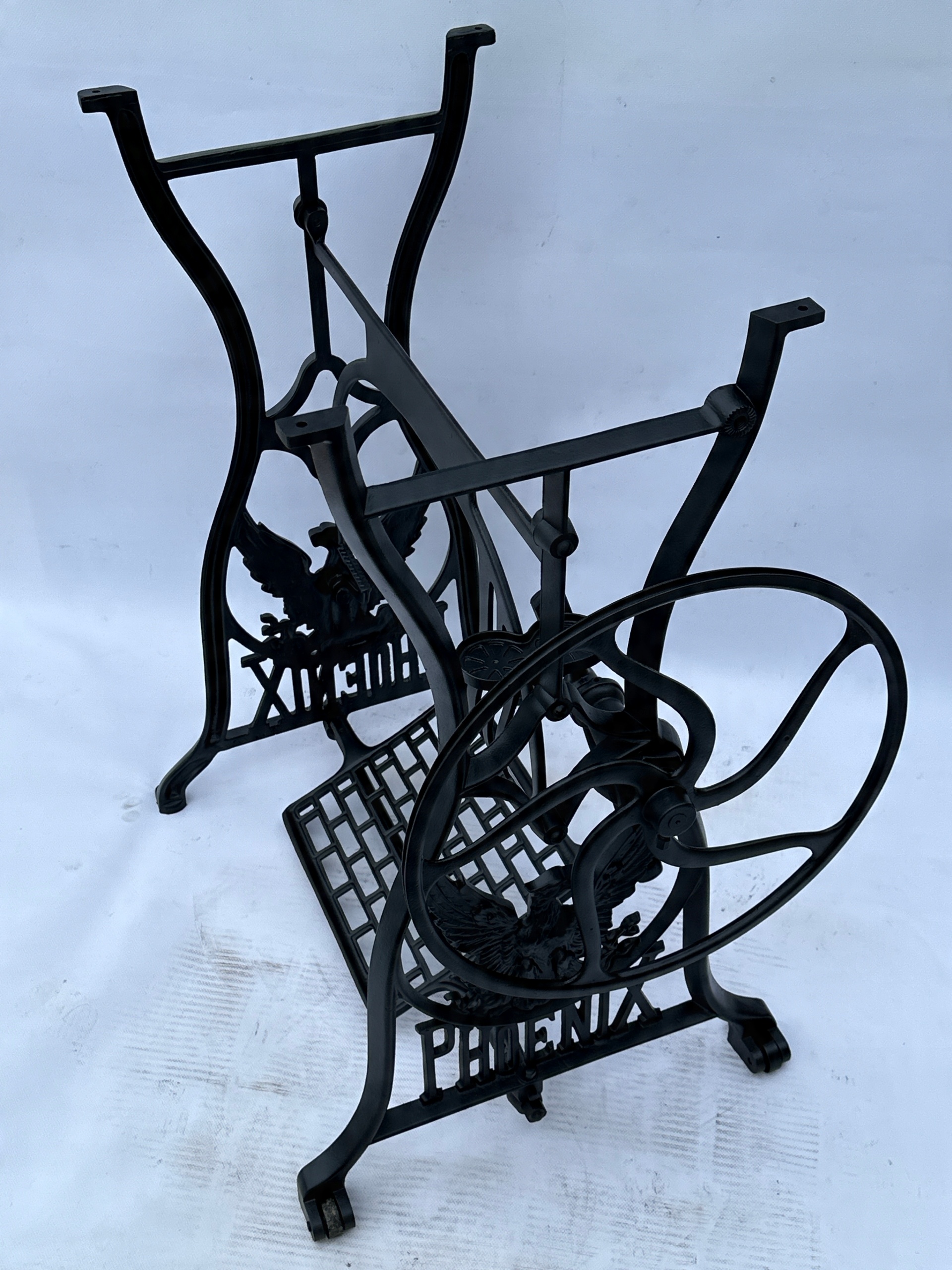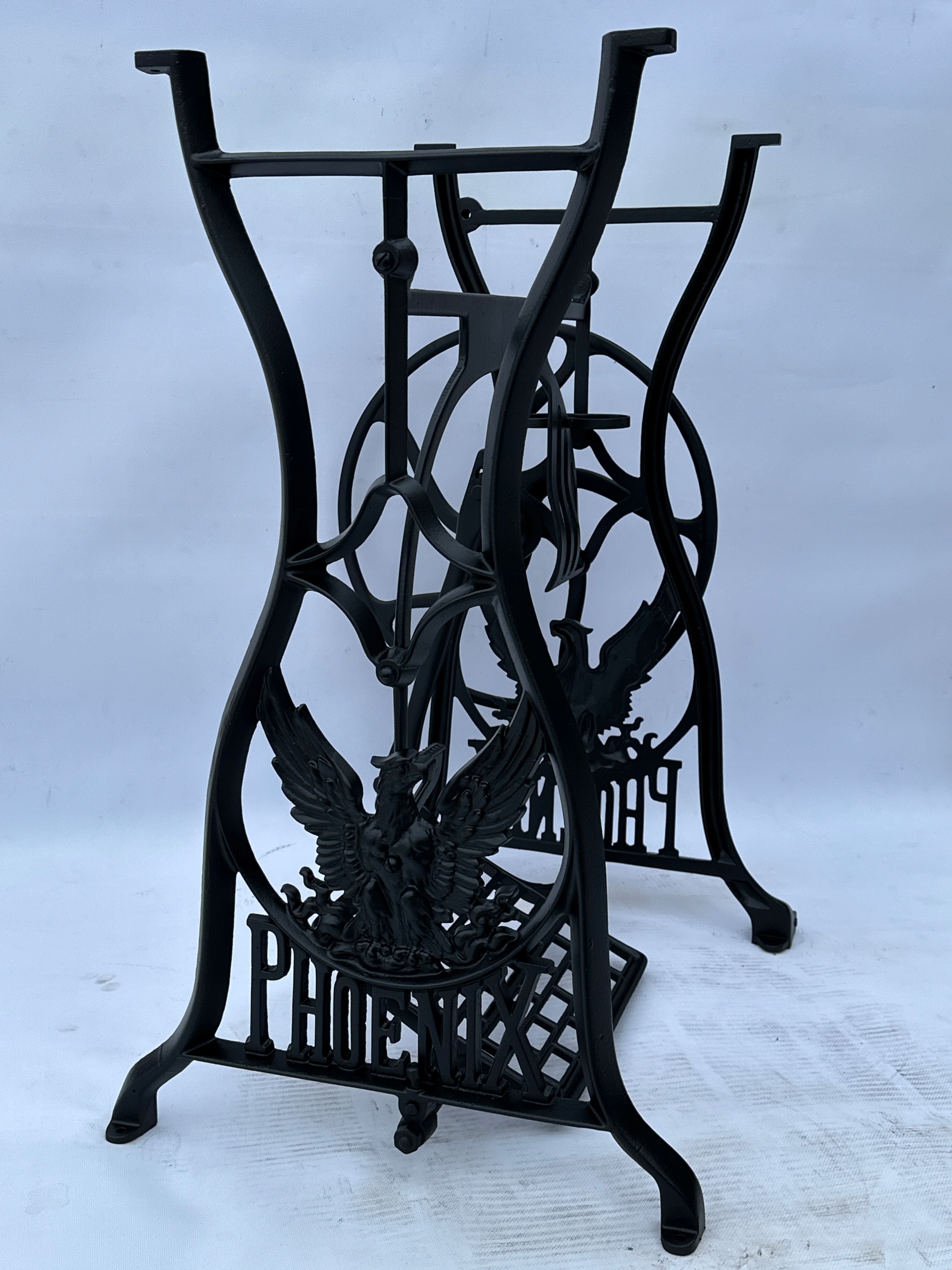 Предмет продажу стара чавунна основа від швейної машинки ФЕНІКС. Дуже гарний візерунок з красивими орлами, зустрічається рідше. З боків написи з логотипом компанії. Він має обидва колеса внизу. Все важче знайти основу в таких багатих декораціях.
