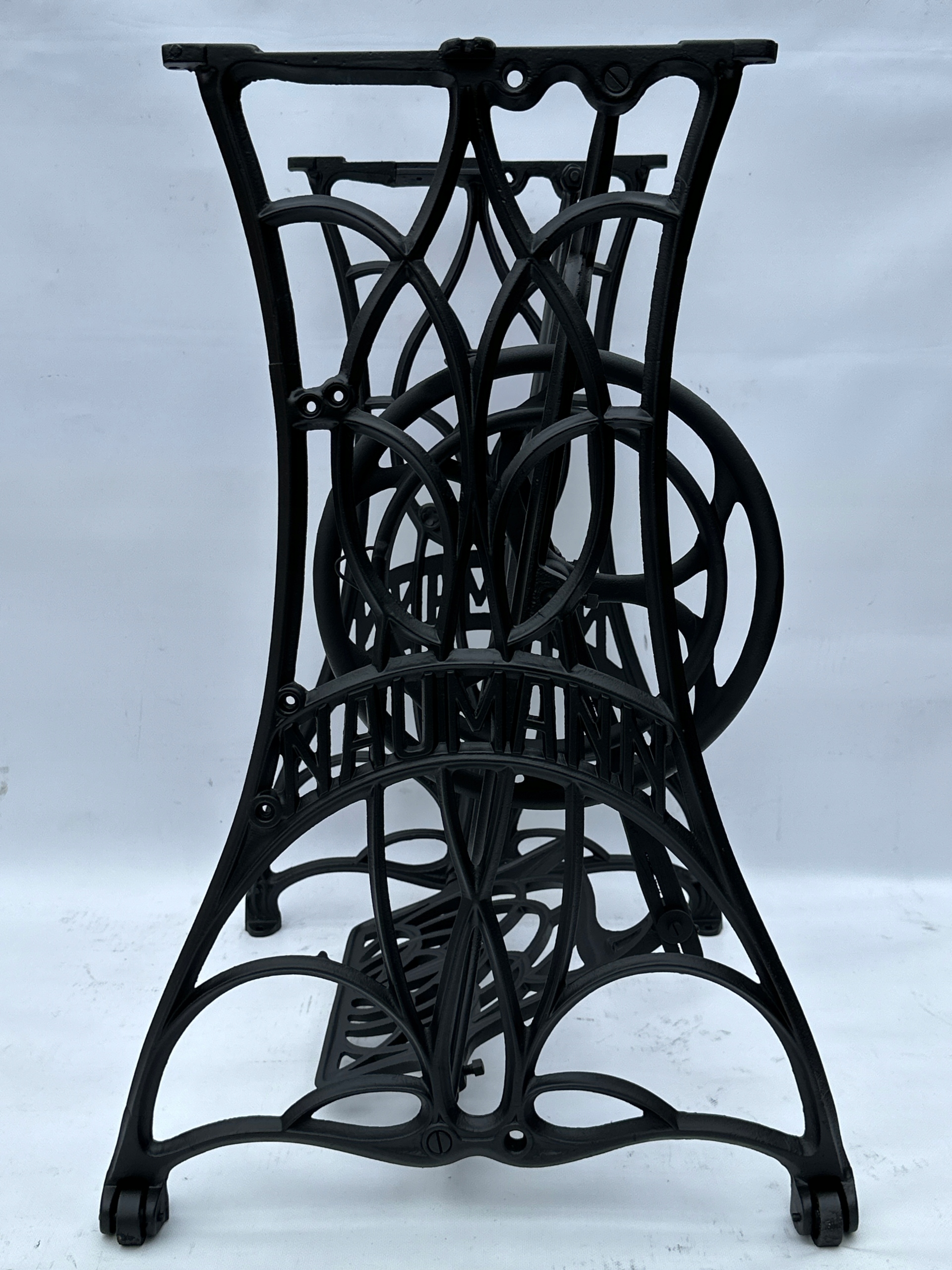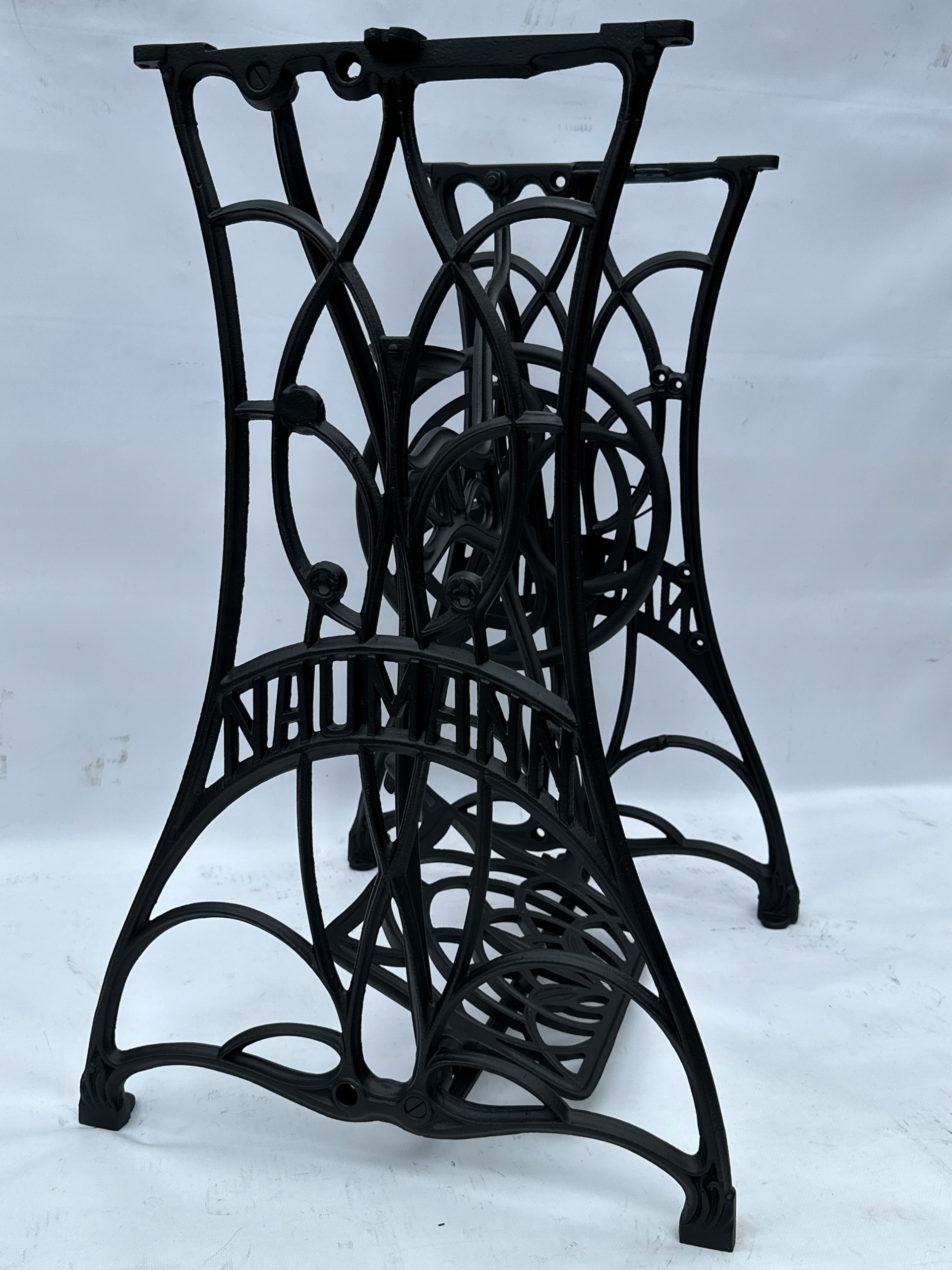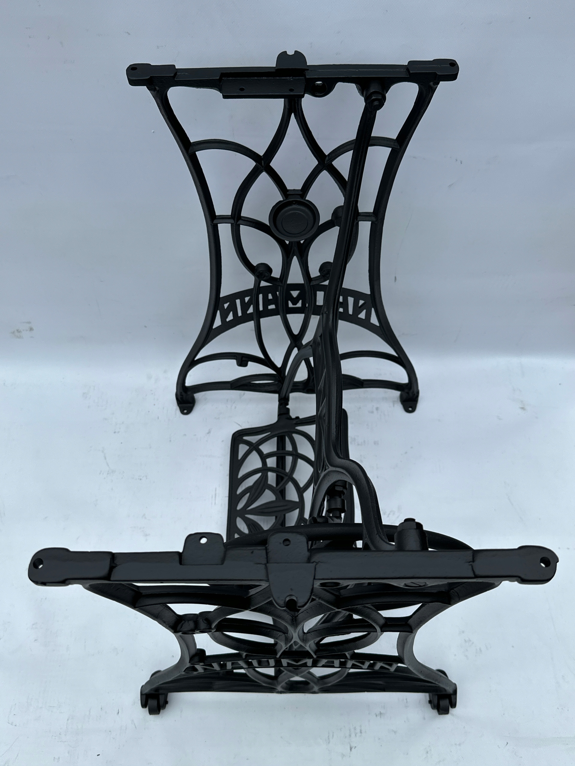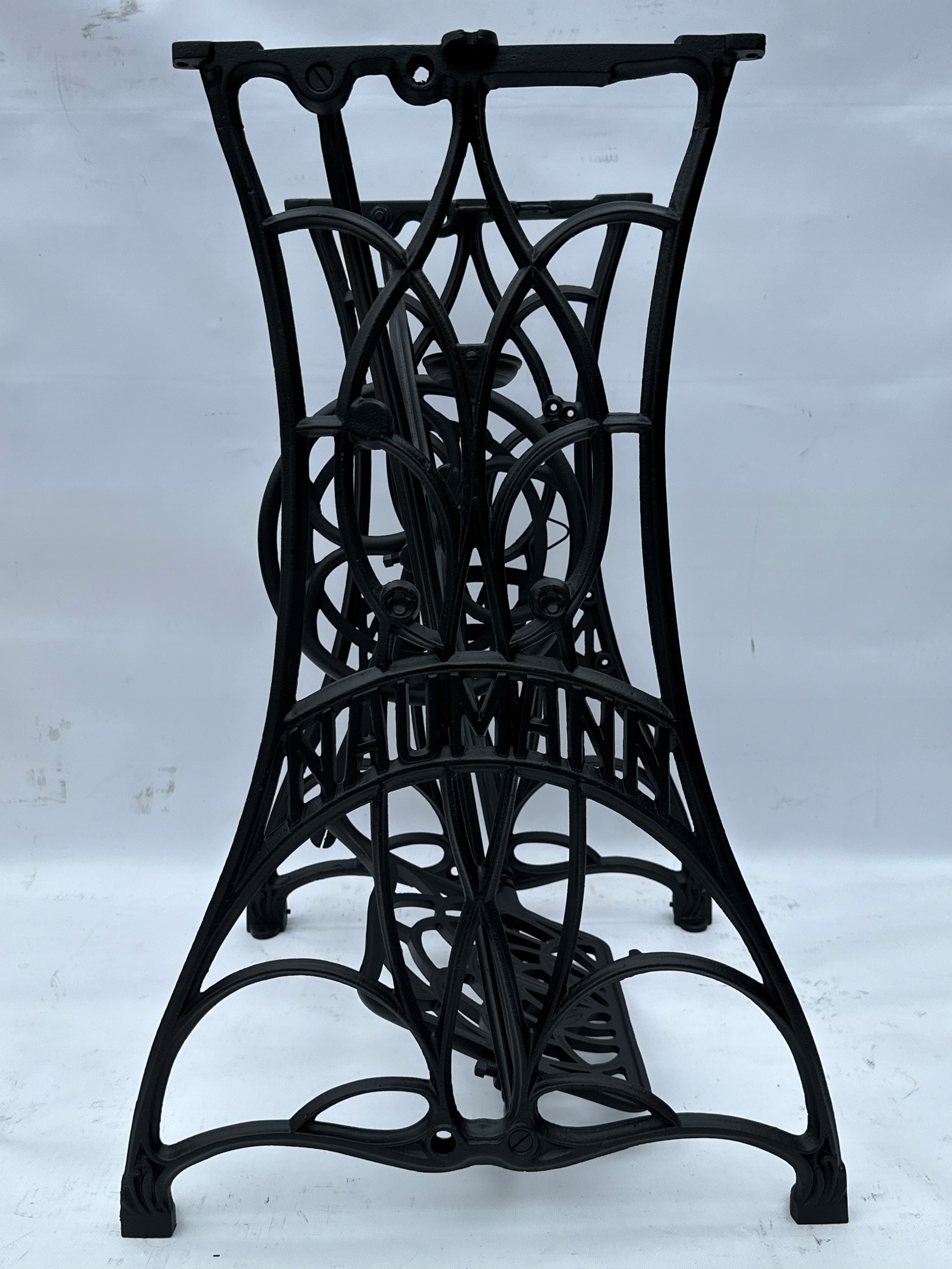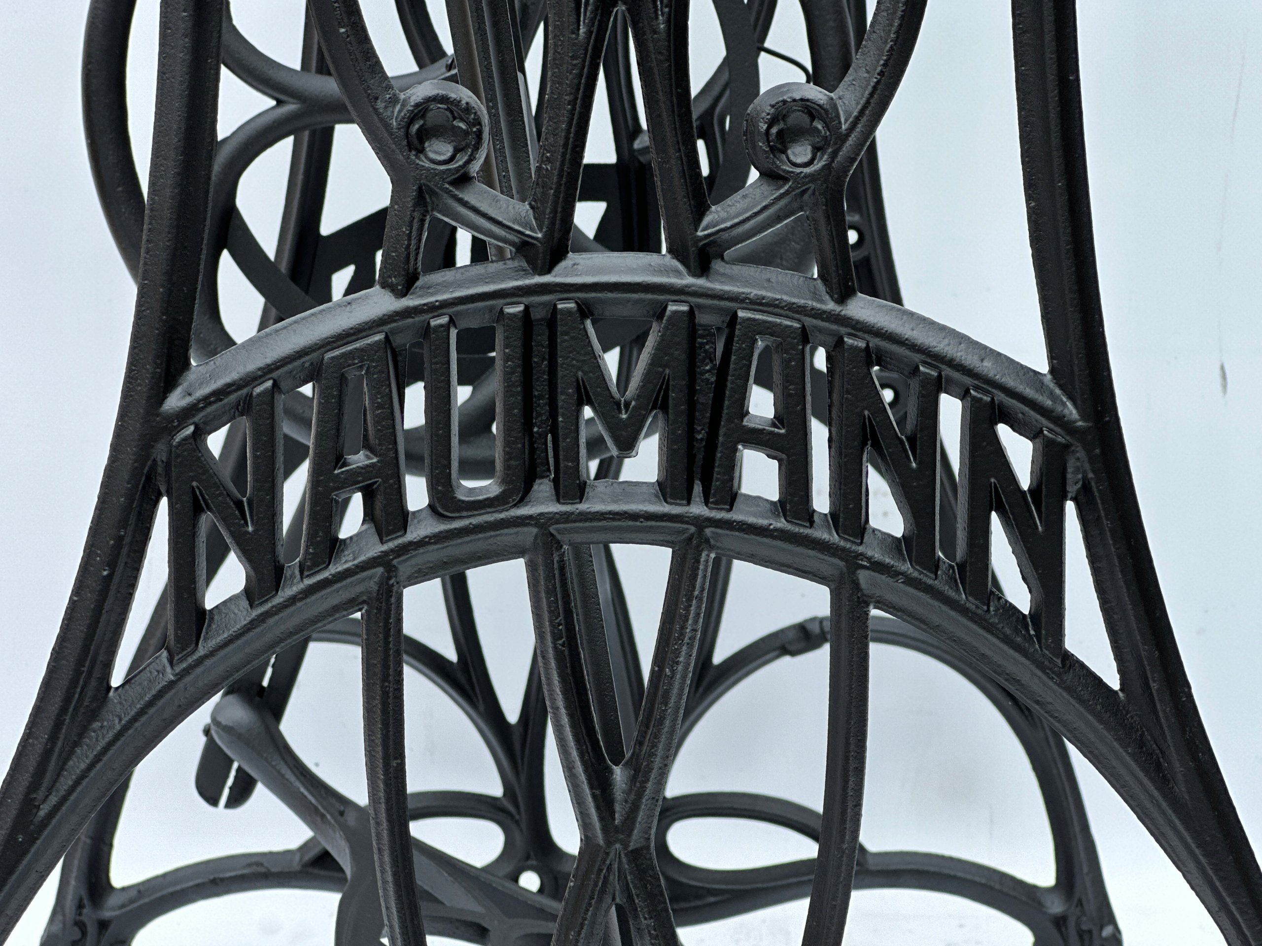 Предмет продажу стара чавунна основа від швейної машинки NAUMANN. Дуже гарна конструкція з товстого чавуну, зустрічається рідше. Посередині логотип компанії, а з боків написи NAUMANN. Він має обидва колеса внизу.