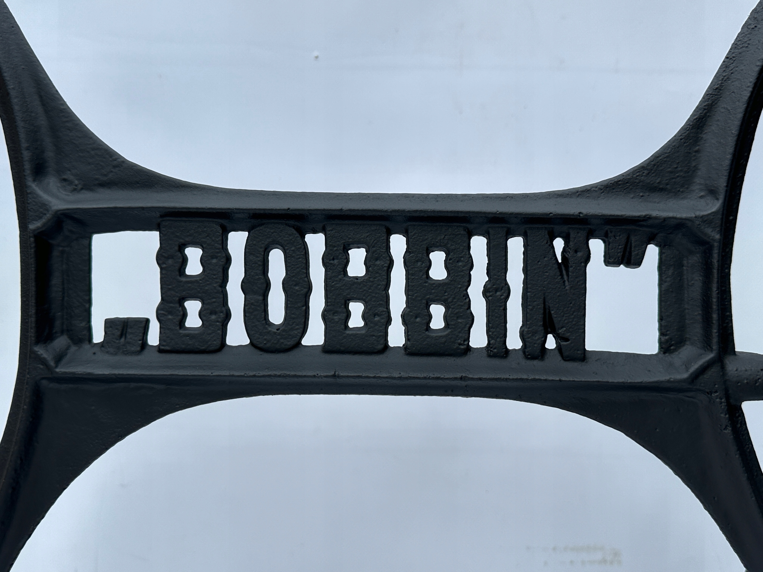 Предмет продажу стара чавунна основа для швейної машинки BOBBIN. Дуже гарний візерунок, менш поширений. Посередині напис з логотипом компанії. Колеса в нижній частині були зняті, що робить стіл більш стійким і не буде рухатися.