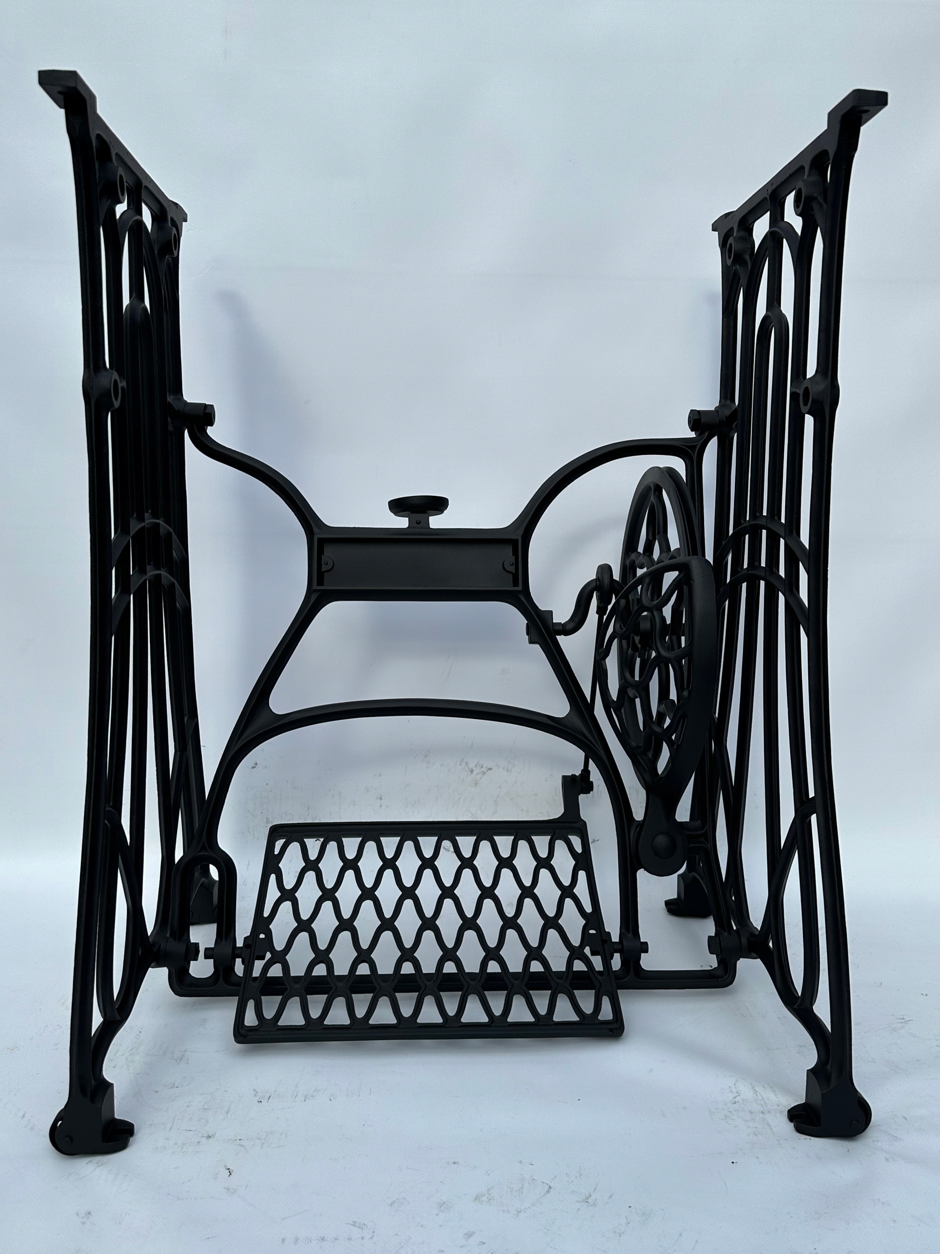 Предмет продажу стара чавунна швейна машина. Дуже гарний візерунок, менш поширений. Посередині був напис з логотипом компанії. Має всі 4 колеса. Додатковою перевагою є металевий елемент, який з’єднує колесо з педаллю приводу, тож ми можемо бути впевнені, що його не з’їдять древоїди, що можливо в базах із дерев’яним елементом.
