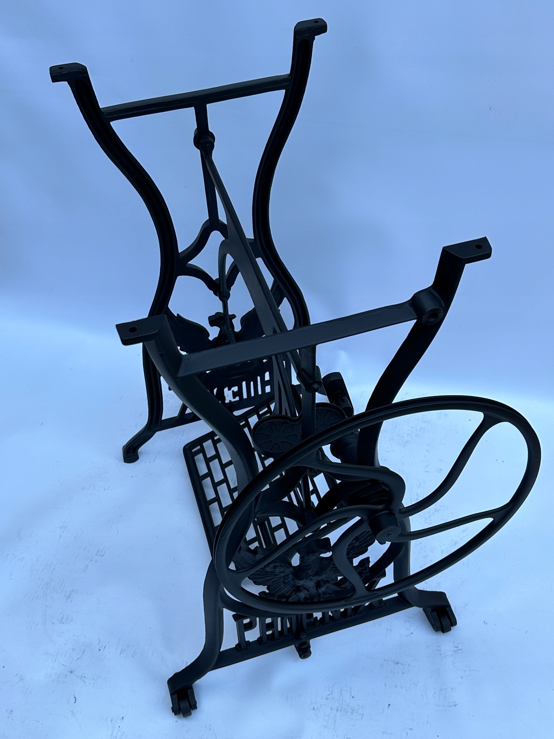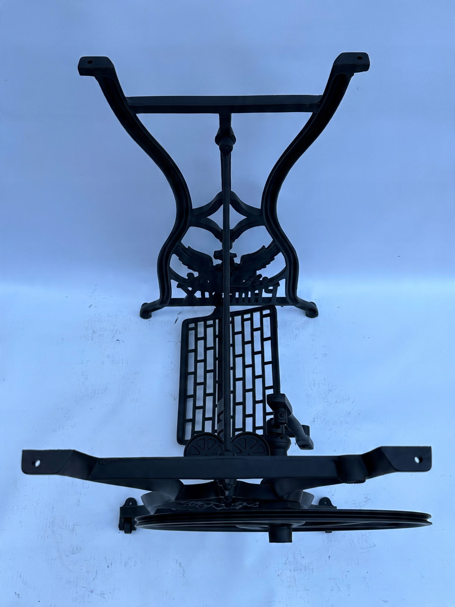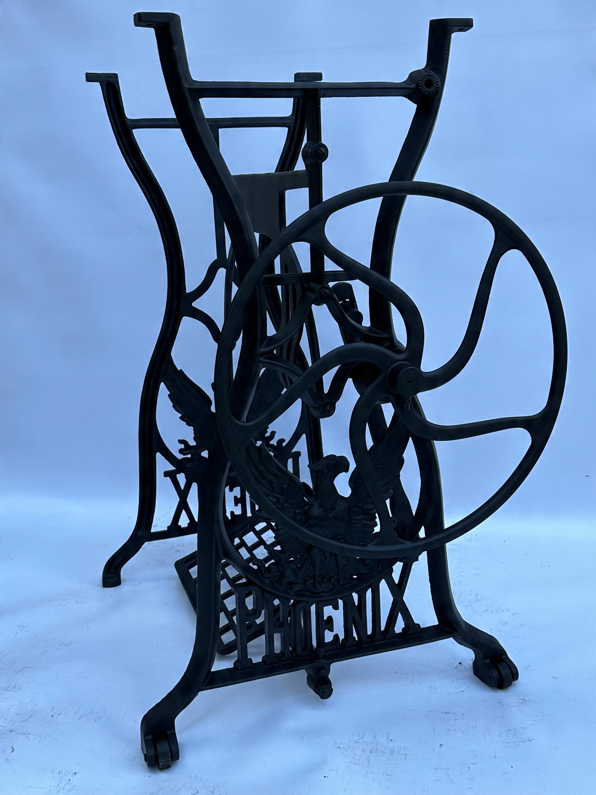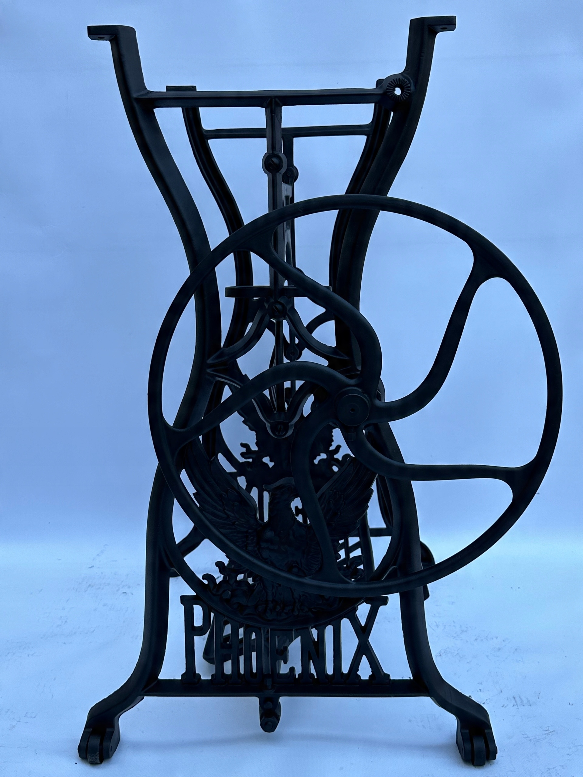 Предмет продажу стара, чавунна основа від швейної машинки ФЕНІКС. Дуже гарний візерунок з красивими орлами, зустрічається рідше. З боків написи з логотипом компанії. Він має обидва колеса внизу. Все важче знайти основу в таких багатих декораціях.