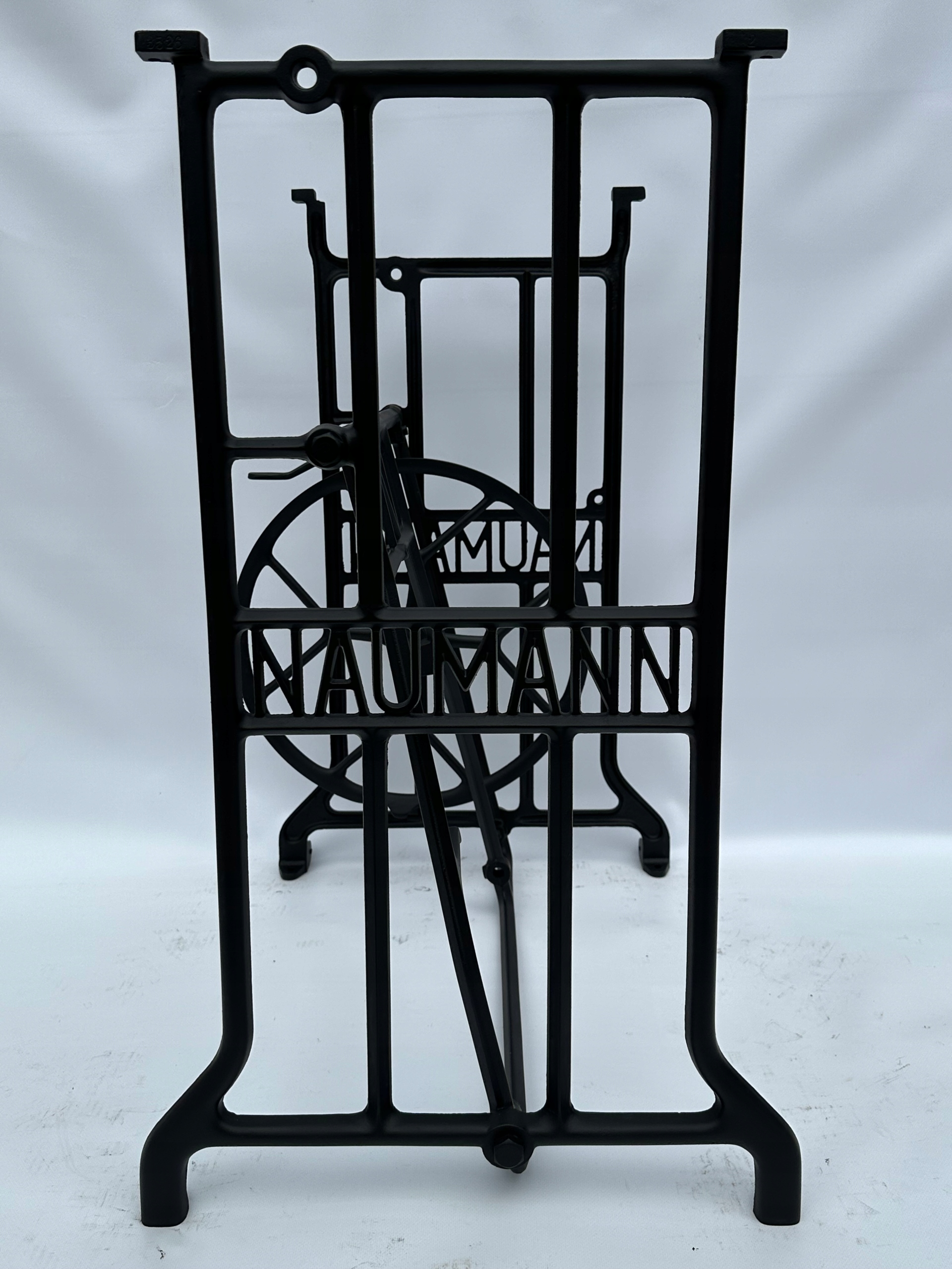 Предмет продажу стара чавунна основа від швейної машинки NAUMANN. Дуже гарний візерунок. З боків написи з логотипом компанії. Він має обидва колеса внизу.