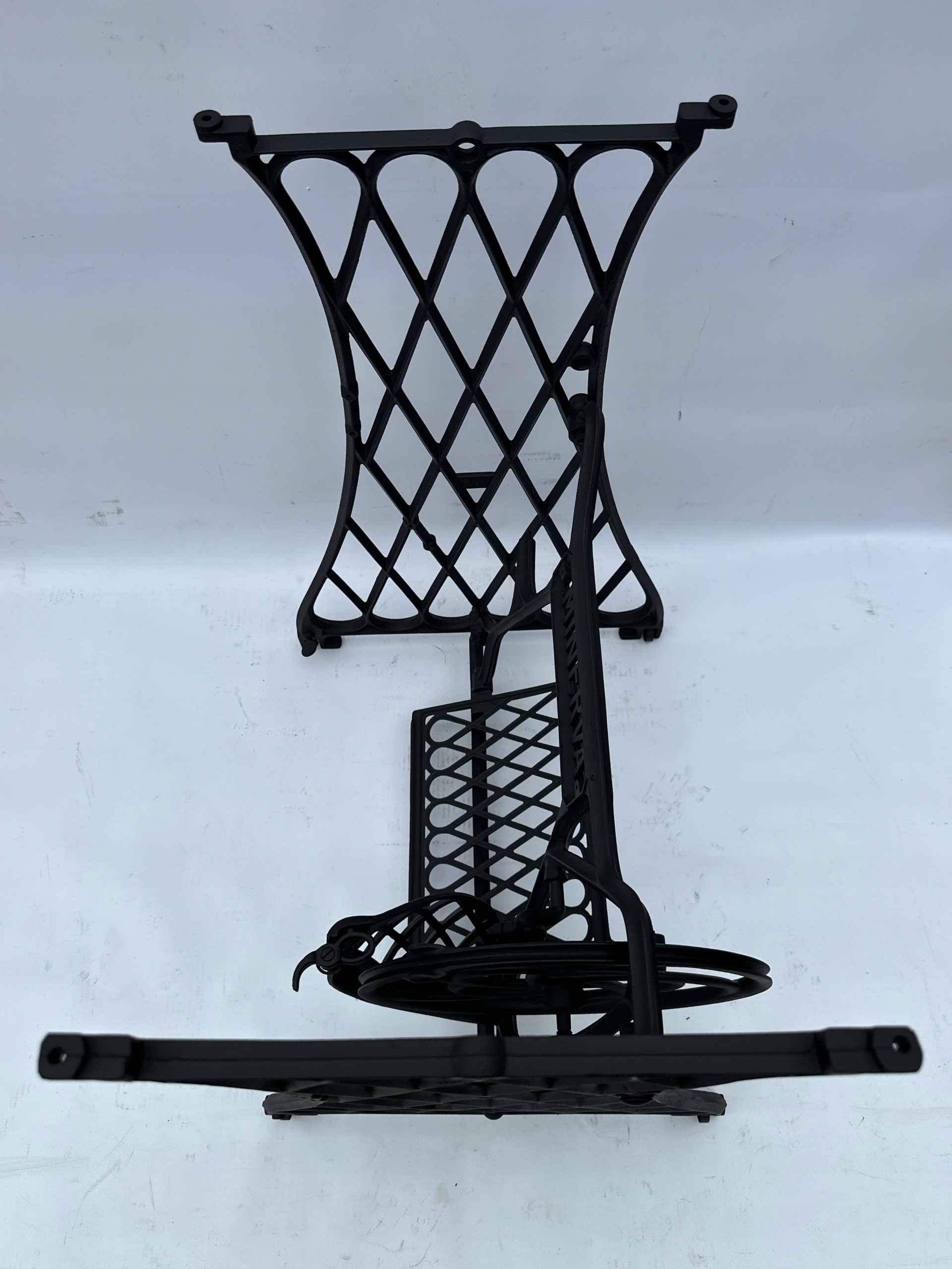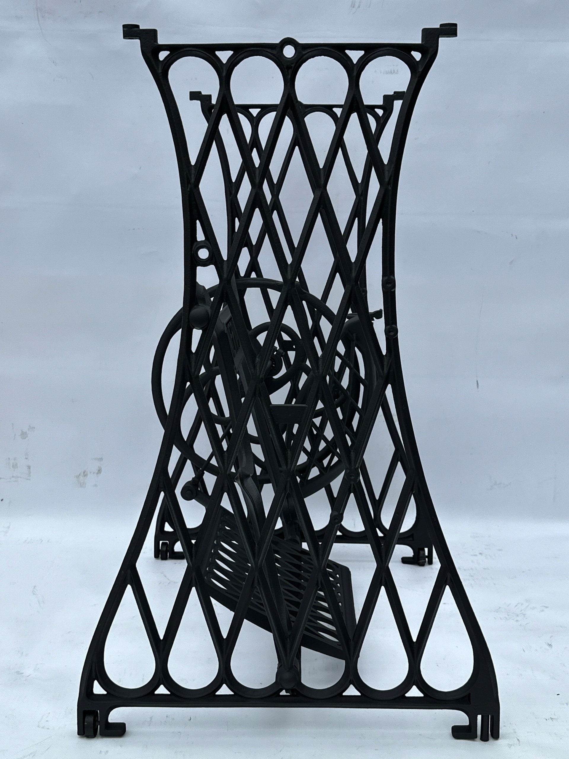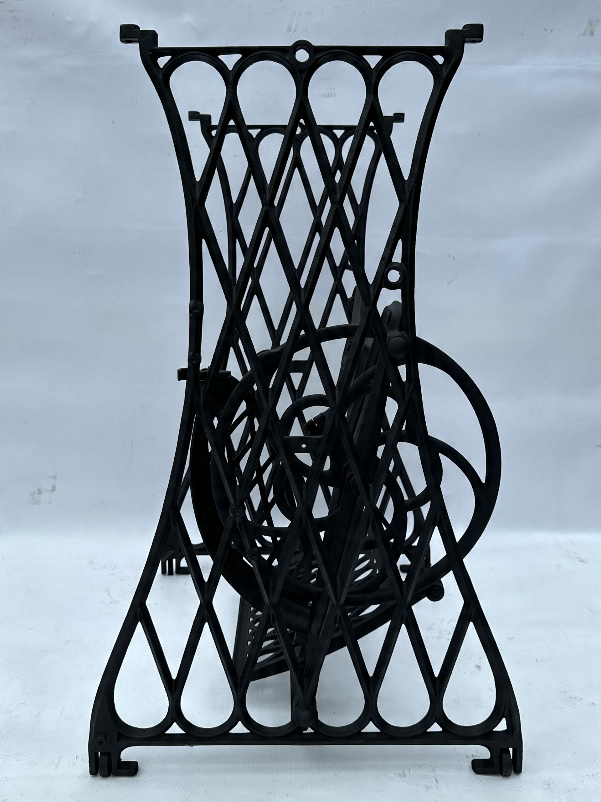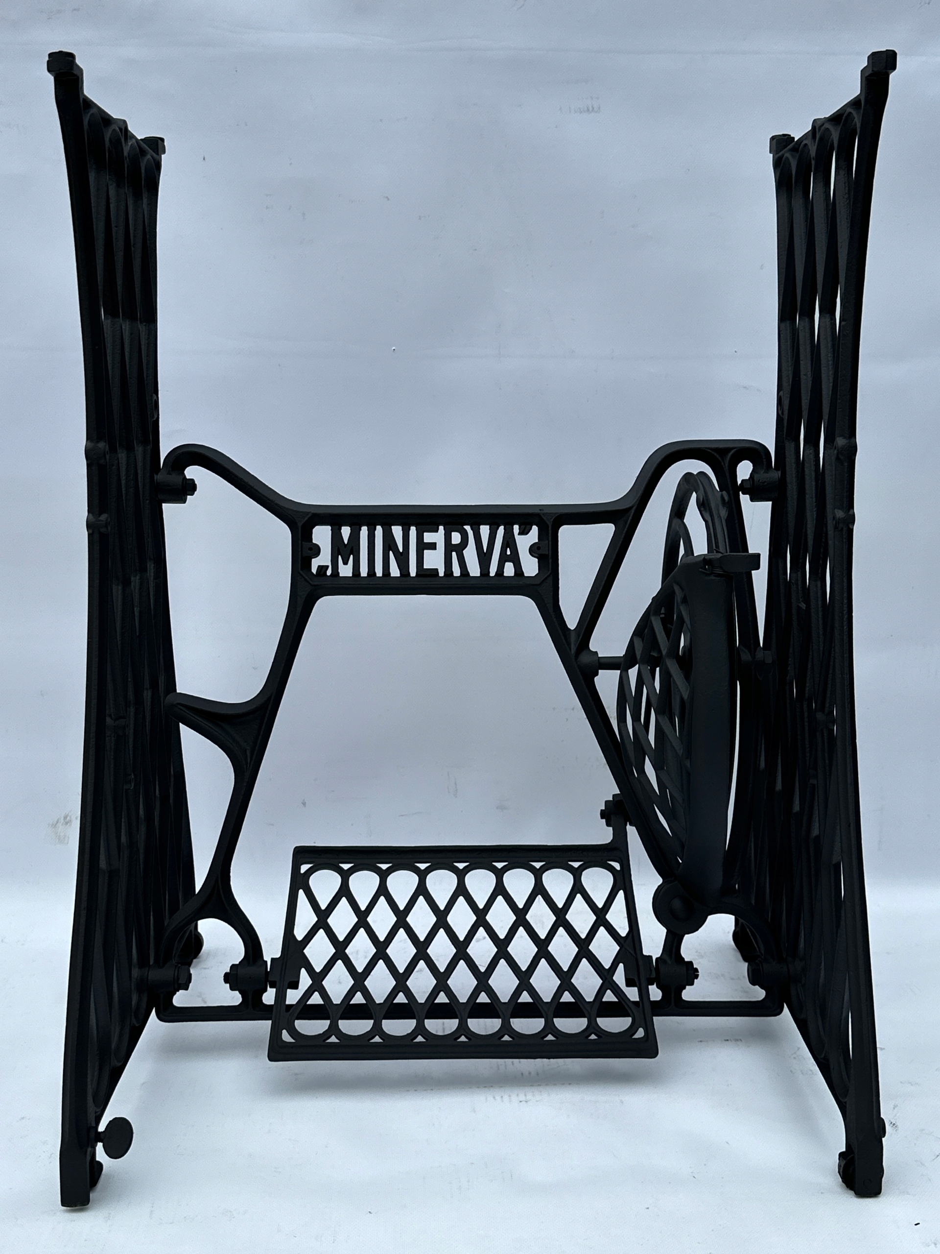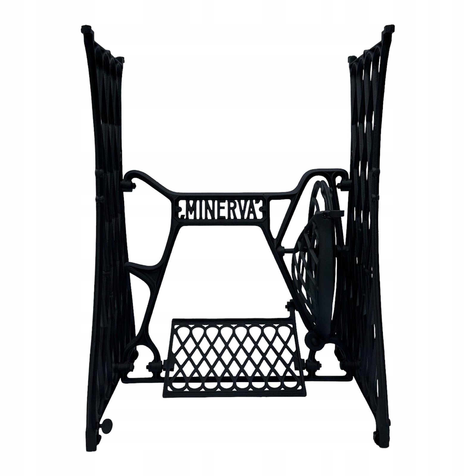 Предмет продажу стара чавунна основа від швейної машинки MINERVA. Дуже гарний візерунок. Посередині напис з логотипом компанії. Має всі 4 колеса в нижній частині.Додатковою перевагою є металевий елемент, що з'єднує колесо з педаллю приводу, завдяки чому ми можемо бути впевнені, що його не з'їдять дровожери, які можлива в основах з дерев'яним елементом.
